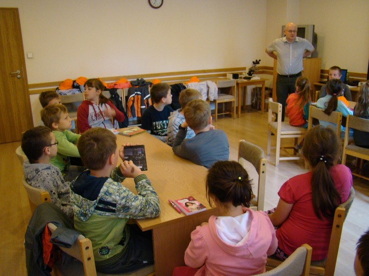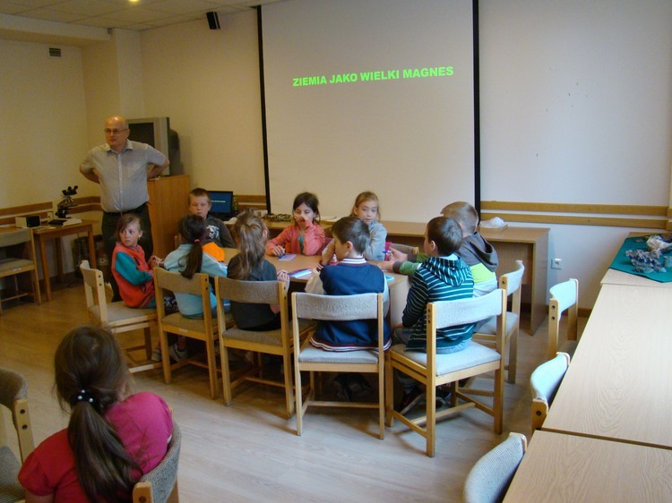 Drugi dzień wycieczki rozpoczął się od odwiedzenia siedziby Instytutu Geofizyki PAN w Warszawie. Uczniowie byli podekscytowani i nie mogli się doczekać kolejnych wrażeń. Zaproszono nas do Laboratorium Paleomagnetyzmu, gdzie w formie zajęć warsztatowych uczniowie poznawali kolejne zjawiska i właściwości materiałów. Uczniowie mieli możliwość sprawdzić magnetyzm wybranych substancji, a nawet magnetyzm samych siebie. Największa wartość wyszła uczniowi, który w trakcie trwania doświadczenia miał założone okulary, poczuł się wyróżniony na tle grupy . Kolejne zajęcia przeprowadzała Pani dydaktyk, która opowiadała o Spitsbergenie, o biegunach, florze i faunie na nich się znajdujących. Ponieważ dzieci wcześniej słyszały o tym na zajęciach w szkole korzystając z platformy Eduscience, tak trudne informacje jak: biegun, równik, Arktyka, Antarktyda, niedźwiedzie, pingwiny i inne zwierzęta biegunowe po tych zajęciach nie były już dla nich zagadką, a wiedza o tych zagadnieniach została przez dzieci w pełni przyswojona.