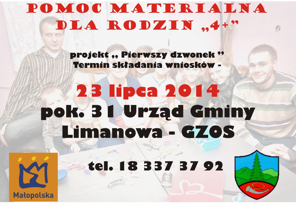 Do dnia 23 lipca 2014 roku trwa nabór do projektu „PIERWSZY DZWONEK”, w ramach którego wsparcie finansowe na zakupu artykułów edukacyjnych oraz pomocy dydaktycznych, w szczególności podręczników mogą uzyskać rodziny wielodzietne 4+.