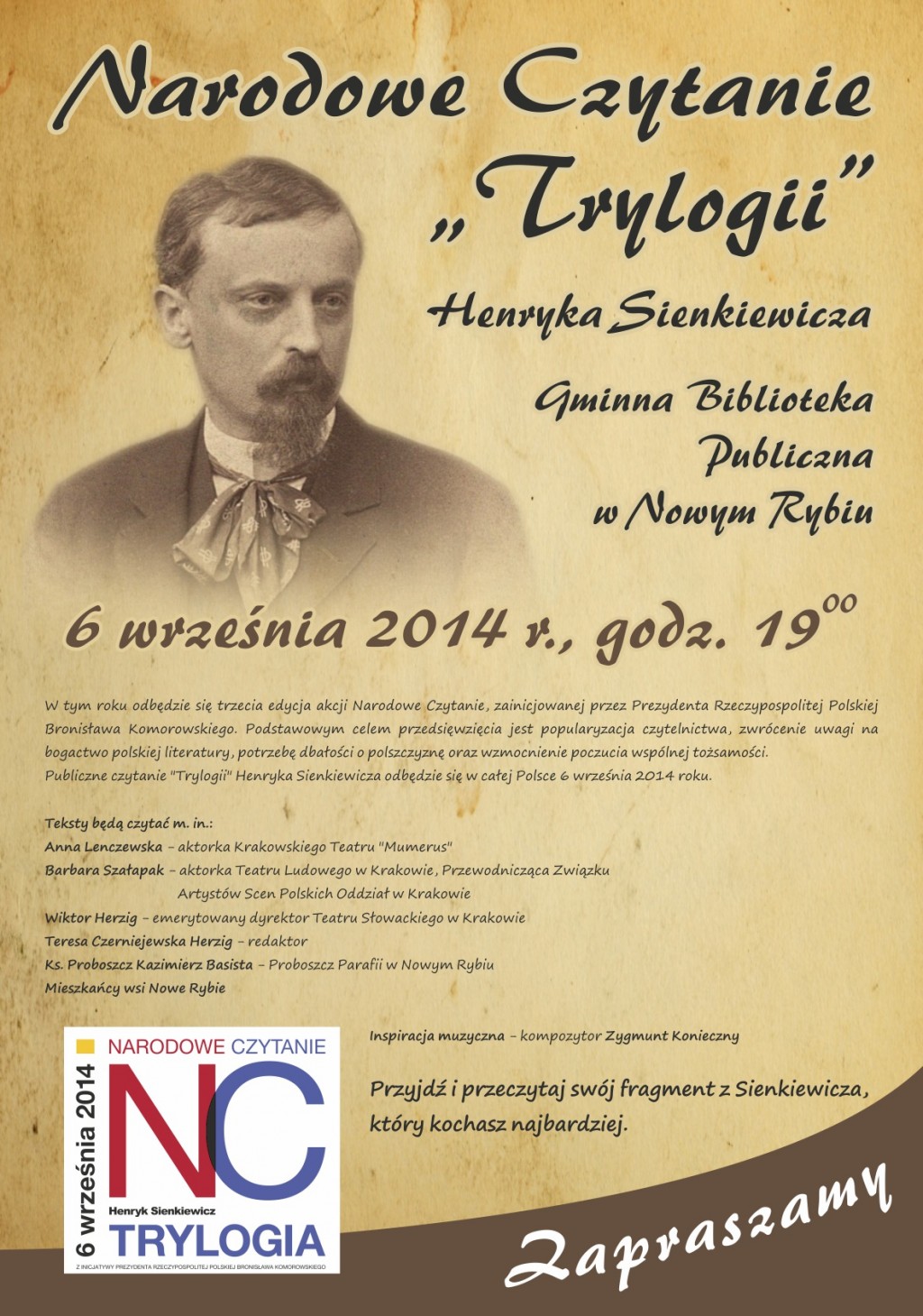 Gminna Biblioteka Publiczna w Starej Wsi – Filia w Nowym Rybiu serdecznie zaprasza na Narodowe Czytanie „Trylogii” Henryka Sienkiewicza, które odbędzie się 6 września /sobota/ o godz. 19:00 w Gminnej Bibliotece Publicznej w Nowym Rybiu.