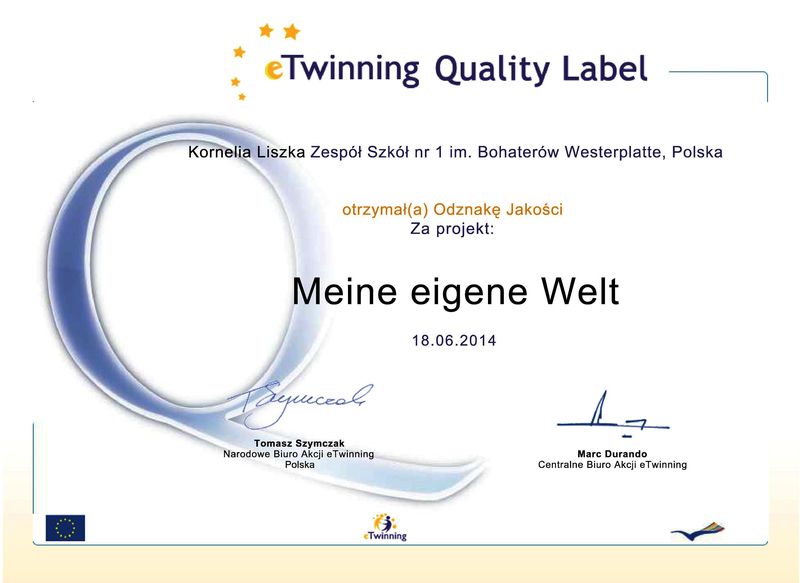 Zespół Szkół Nr 1 w Starej Wsi otrzymał prestiżową Krajową Odznakę Jakości eTwinning - Quality Label za projekt "Meine eigene Welt". Praca i podejmowane działania w dziedzinie europejskiej współpracy szkół przy wykorzystaniu nowoczesnych technologii informacyjno- komunikacyjnych zostały uznane za szczególnie oryginalne nowatorskie w skali krajowej.