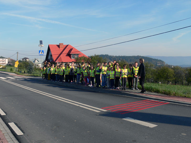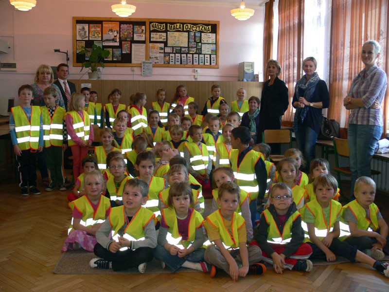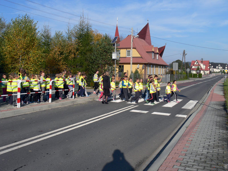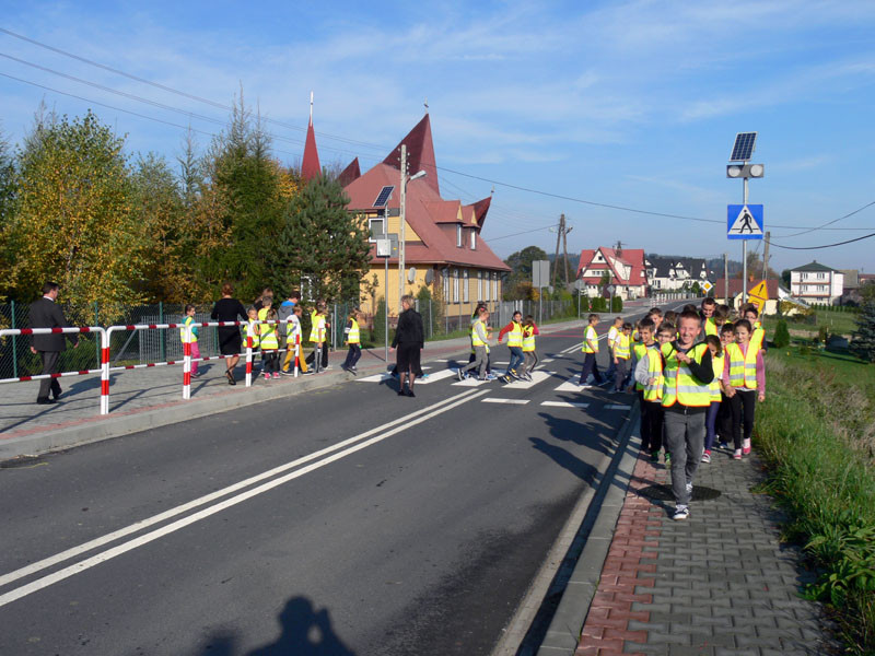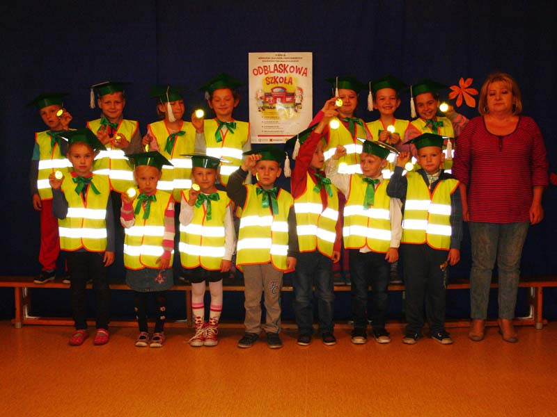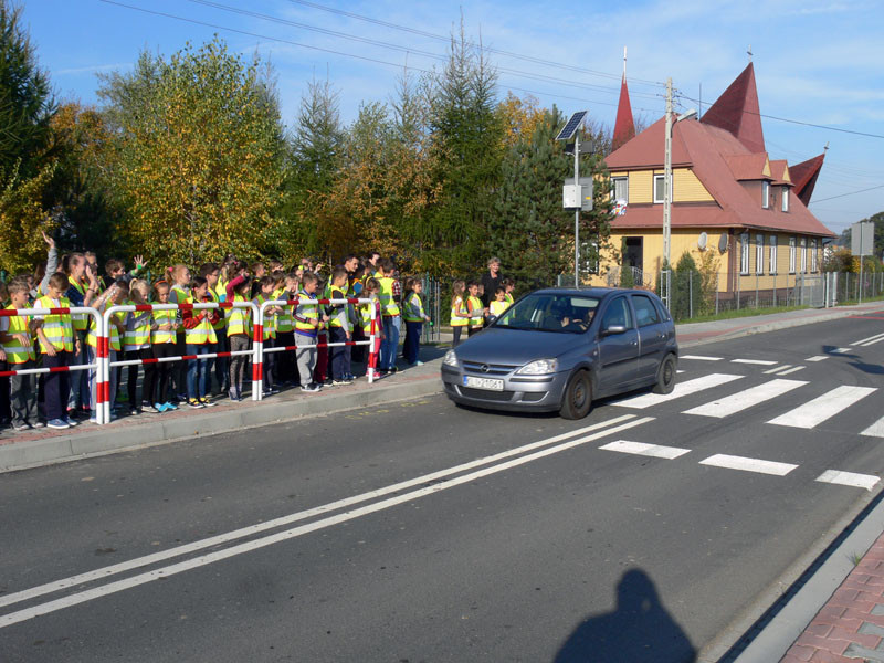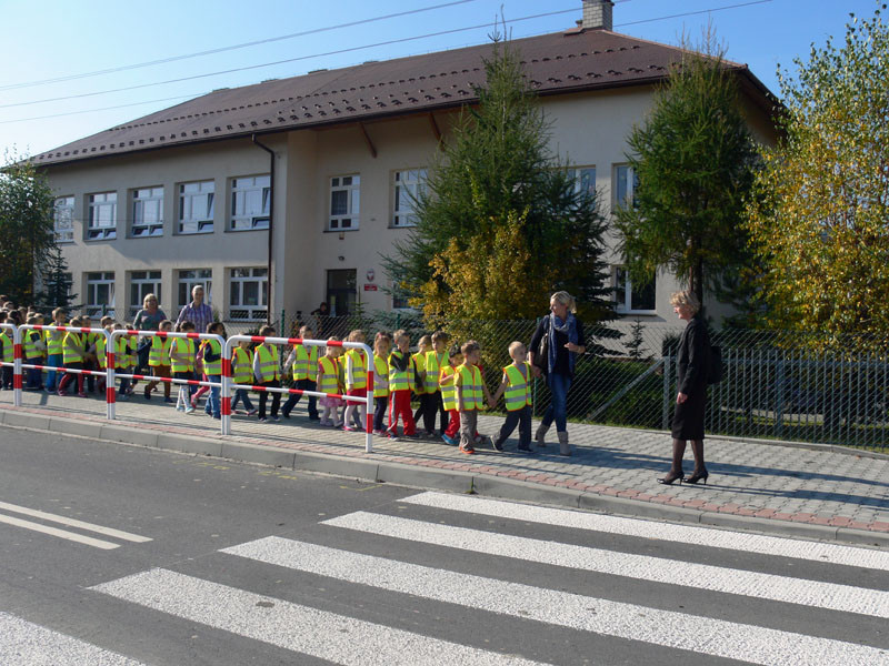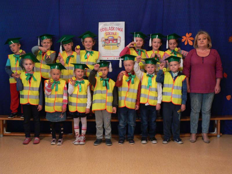 Na zakończenie wszystkie dzieci w odblaskowych kamizelkach, ze swoimi opiekunami włączyły się do ruchu drogowego i zademonstrowały prawidłowe przechodzenie przez ulicę w wyznaczonych miejscach przy szkole. W doskonałych humorach podziękowały za tak ciekawe i pouczające spotkanie, które utrwalono na pamiątkowych fotografiach.