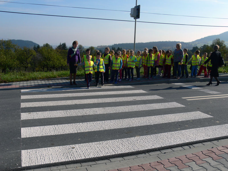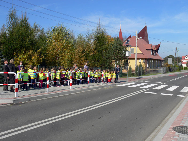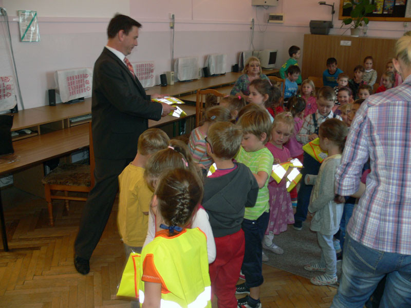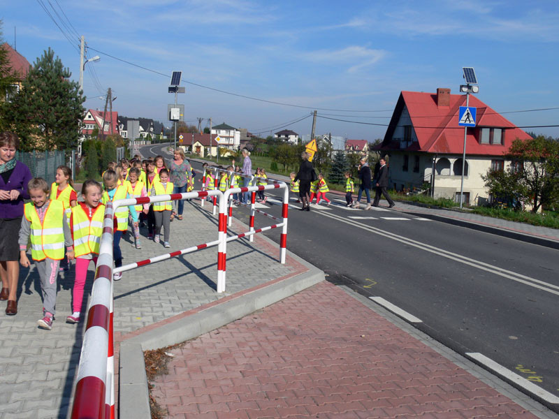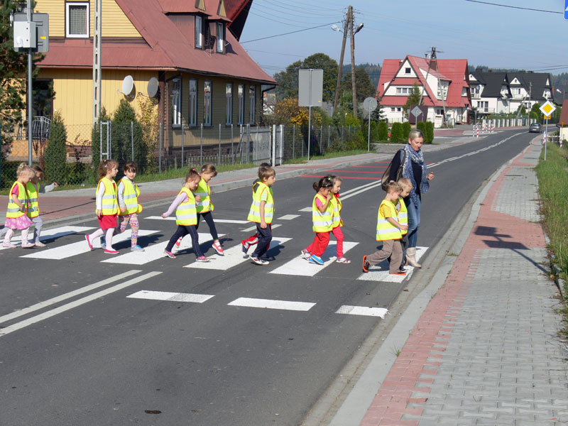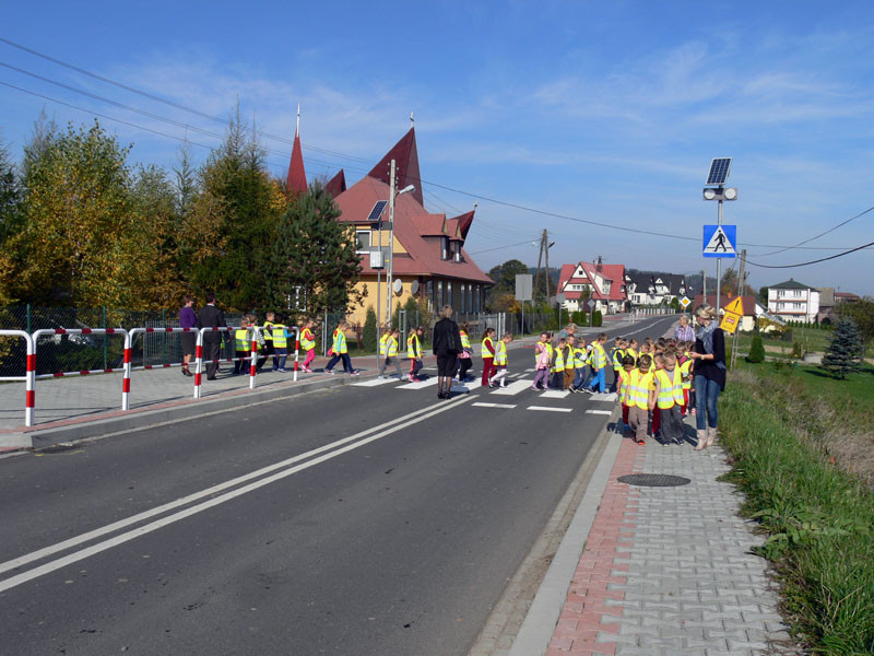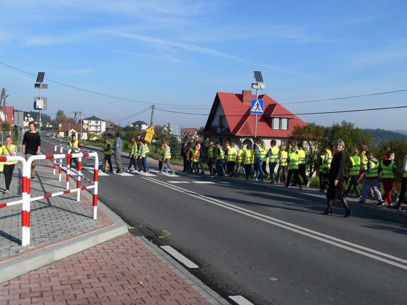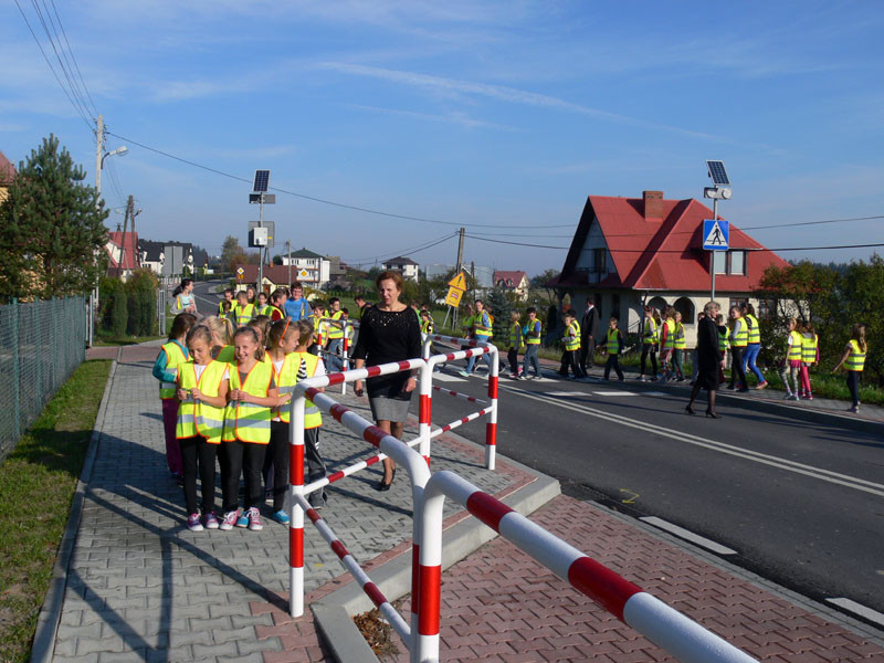 Na zakończenie wszystkie dzieci w odblaskowych kamizelkach, ze swoimi opiekunami włączyły się do ruchu drogowego i zademonstrowały prawidłowe przechodzenie przez ulicę w wyznaczonych miejscach przy szkole. W doskonałych humorach podziękowały za tak ciekawe i pouczające spotkanie, które utrwalono na pamiątkowych fotografiach.