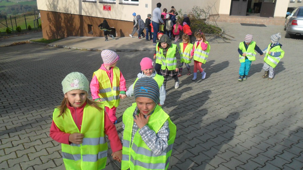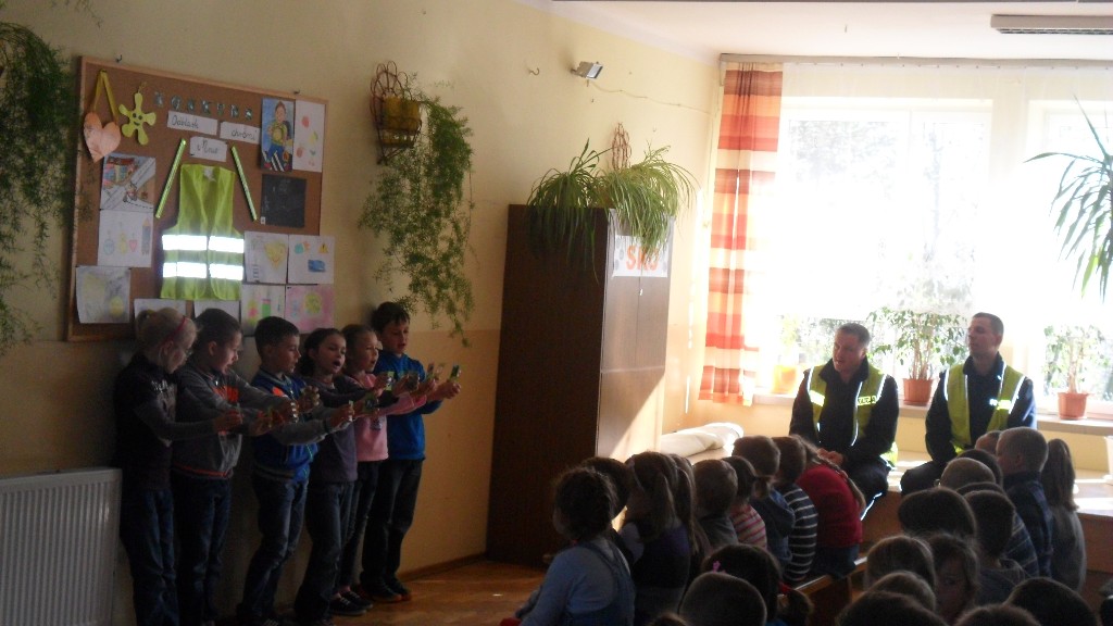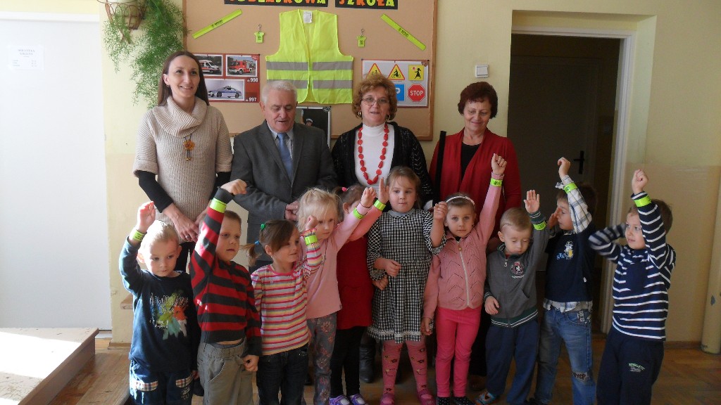 W ramach akcji w październiku odbyło się również spotkanie z Policjantami z Komendy Powiatowej Policji w Limanowej. Panowie Policjanci wygłosili prelekcję na temat bezpiecznego poruszania się po drodze oraz na temat zagrożeń, jakie czyhają na dzieci w drodze do i ze szkoły. Zwracali też uwagę na konieczność noszenia elementów odblaskowych, by zwiększyć bezpieczeństwo pieszych poruszających się po drogach. Dzieci miały możliwość praktycznej nauki prawidłowego przechodzenia przez jezdnię.