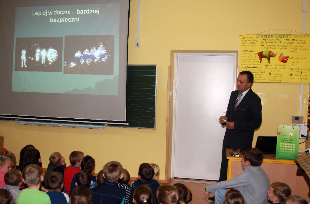 W celu podniesienia świadomości o obowiązku noszenia odblasków odbyło się spotkanie z panem mgr Wiesławem Królem egzaminatorem Małopolskiego Ośrodka Ruchu Drogowego, który po interesującej prezentacji przekazał materiały odblaskowe dla każdego ucznia.