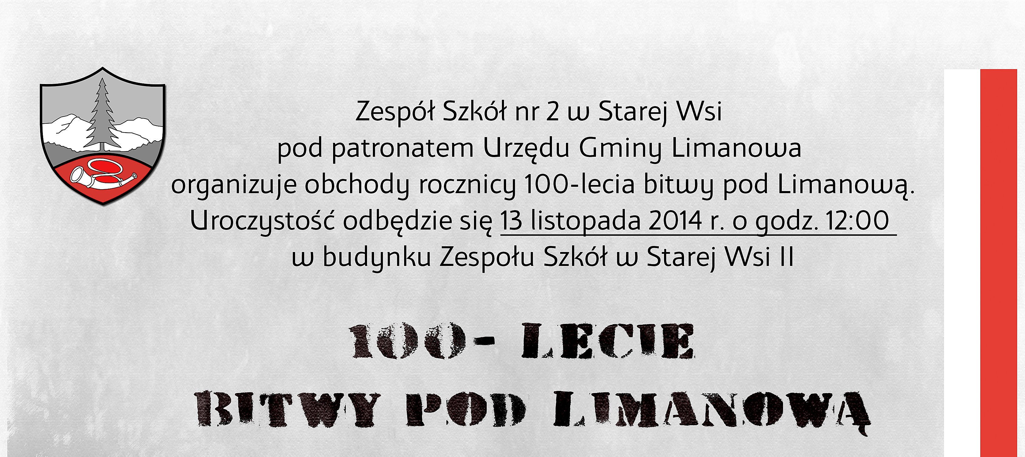 Dnia 13 listopada br. w Starej Wsi II odbędą się uroczyste obchody 100 rocznicy bitwy pod Limanową. Obchody rozpoczną się o godz. 12.00 w budynku Zespołu Szkół nr 2 w Starej Wsi, a zakończą złożeniem zniczy na cmentarzu wojennym na Golcowie. Podczas uroczystości rozstrzygnięty zostanie konkurs plastyczny, którego tematem była bitwa pod Limanową.