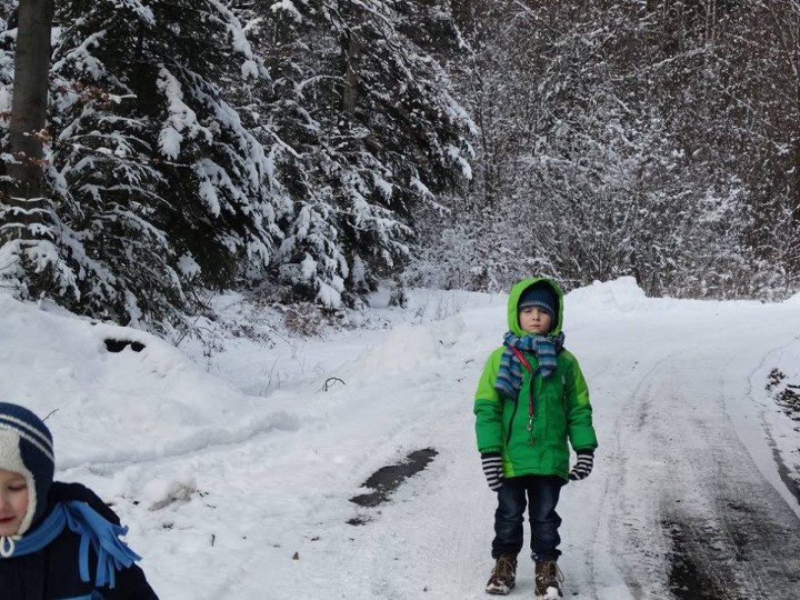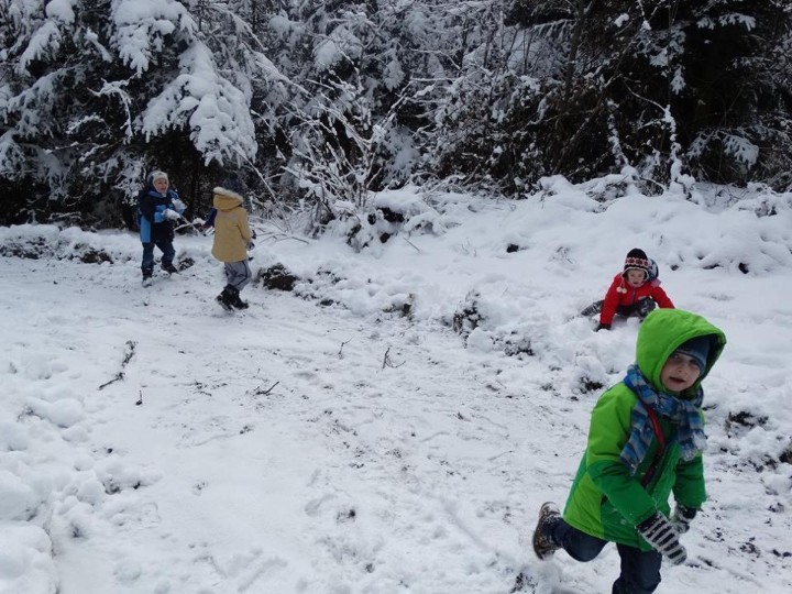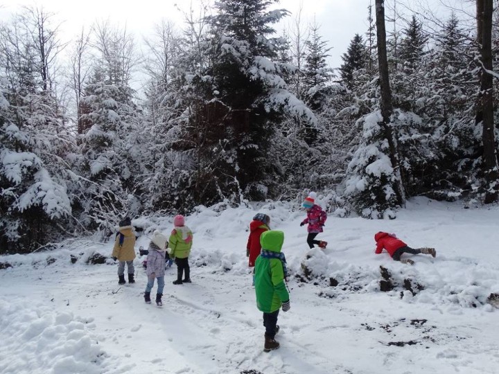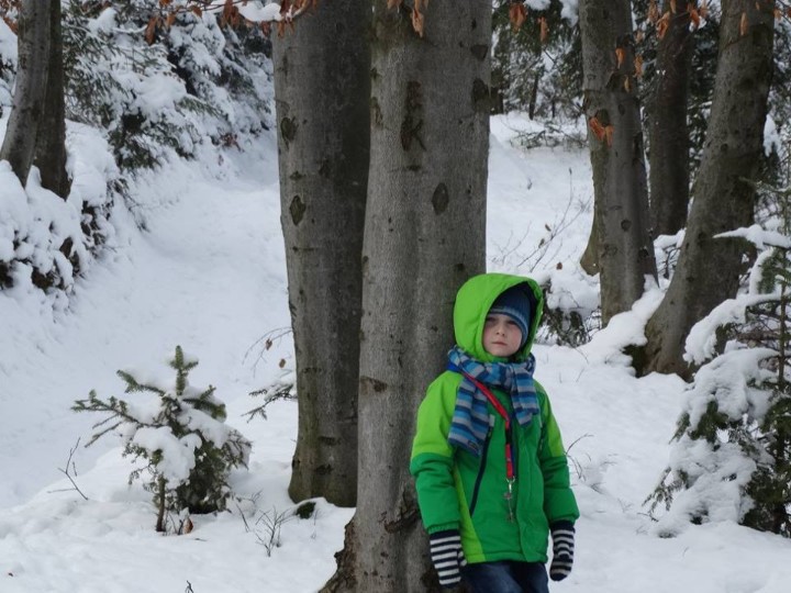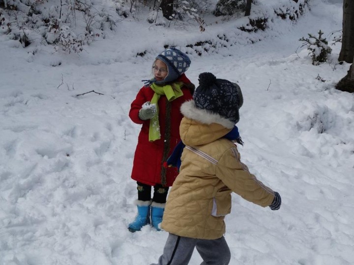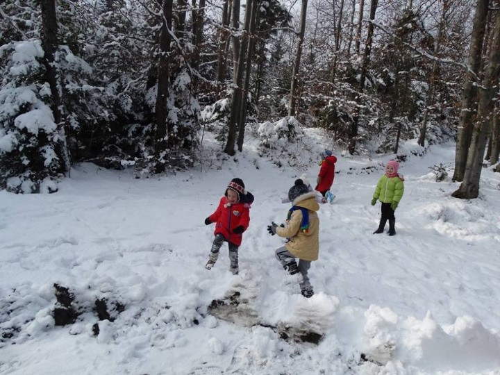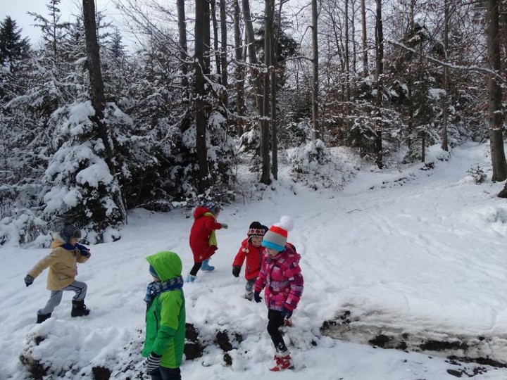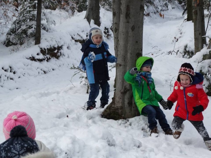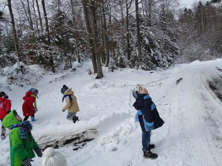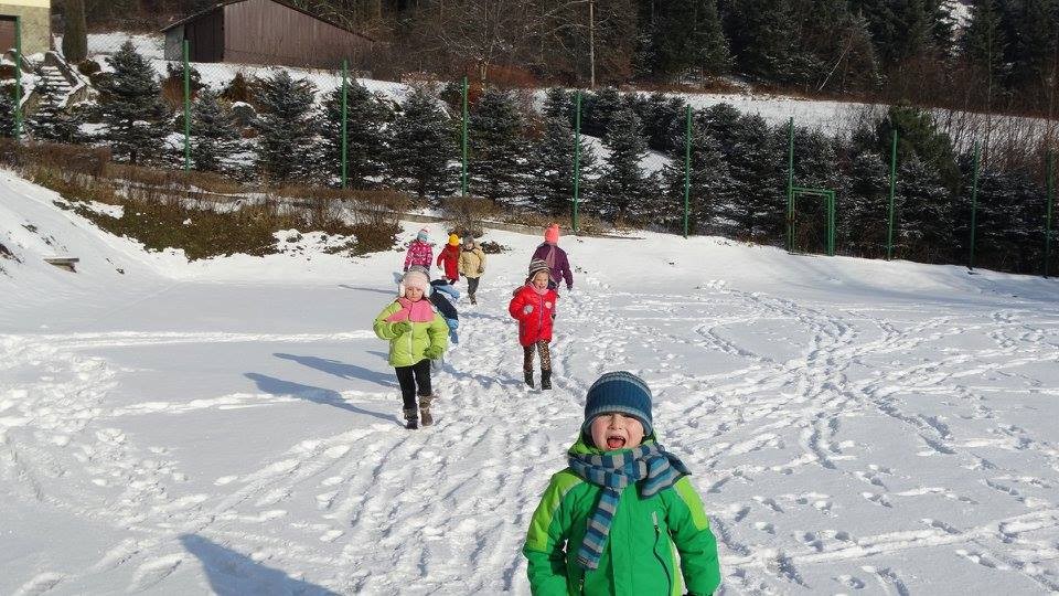 Trochę zobowiązani lokalizacją a bardziej chęcią podziwiania piękna Gminy Limanowa w szczególności malowniczej miejscowości Męcina uczniowie wybrali się na szczyt góry Jaworz. Niestrudzeni wędrówką i lekkim mrozem przedszkolaki bawiły się na całego odziane w wszędobylski biały puch.