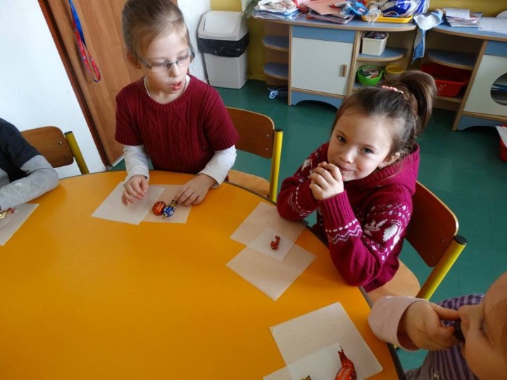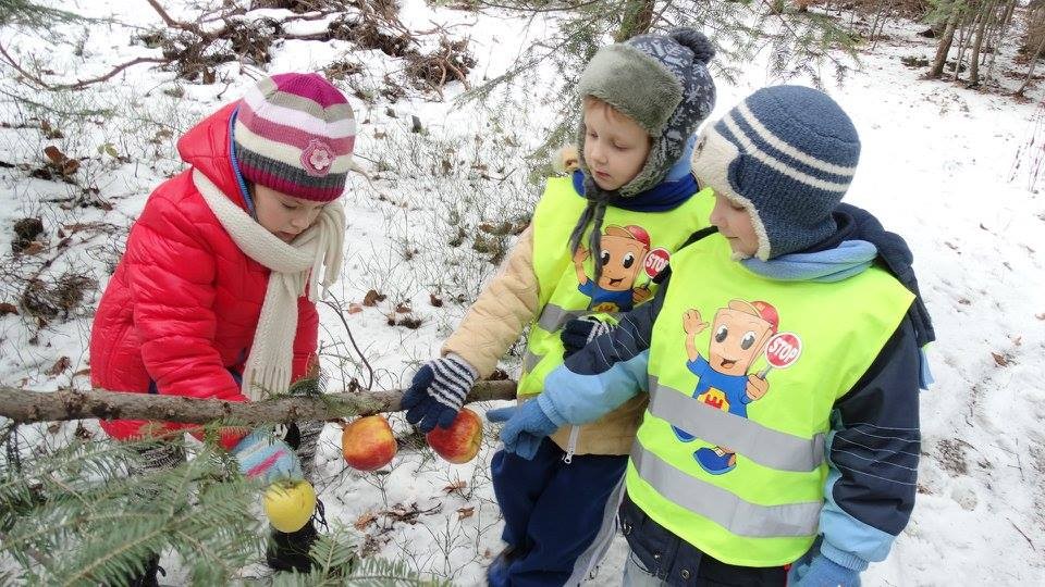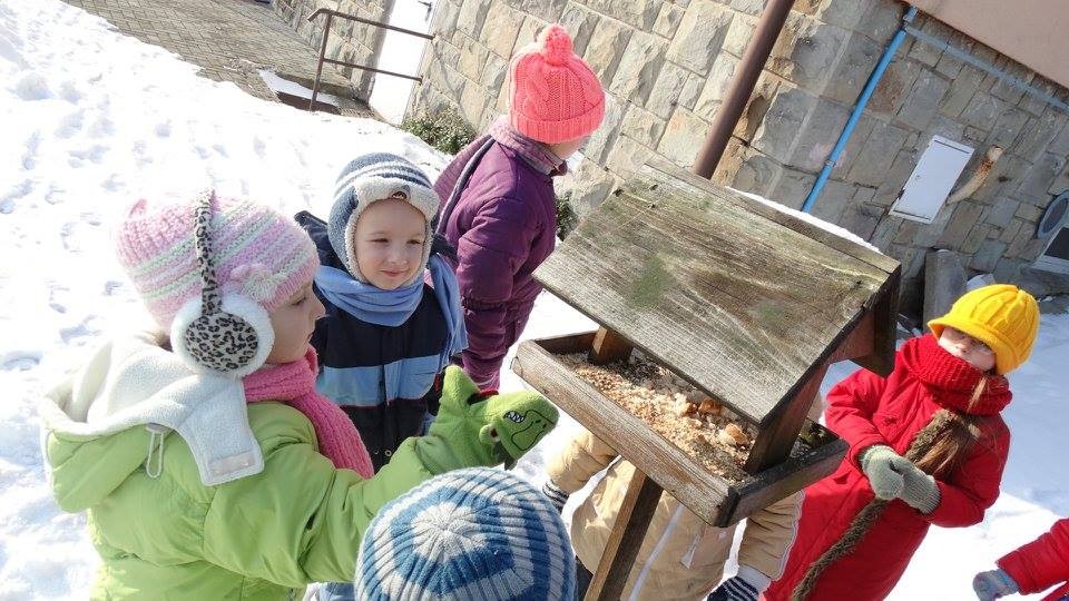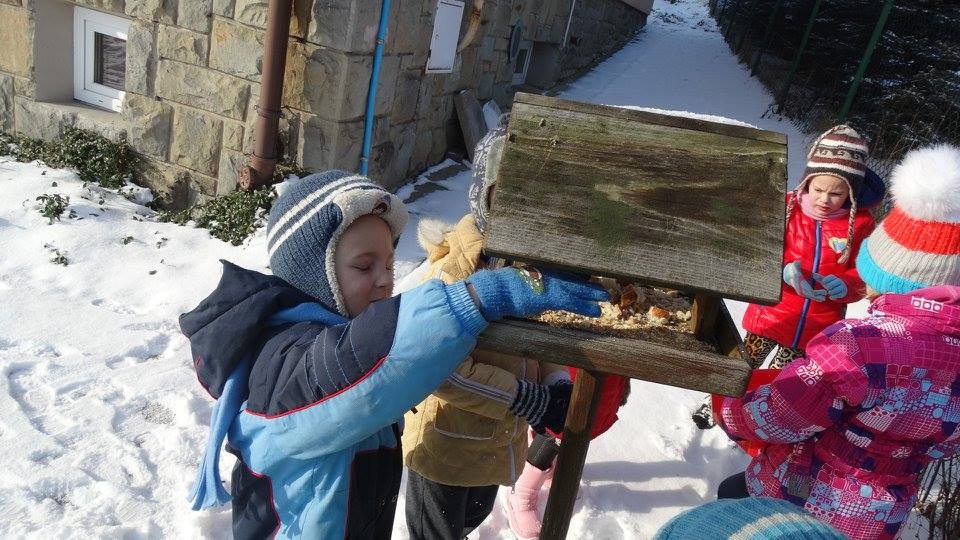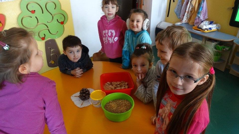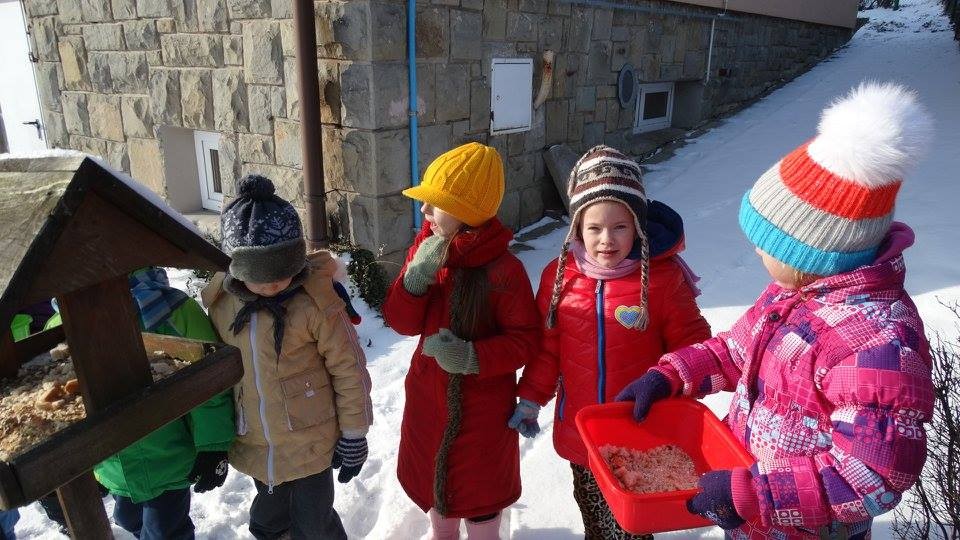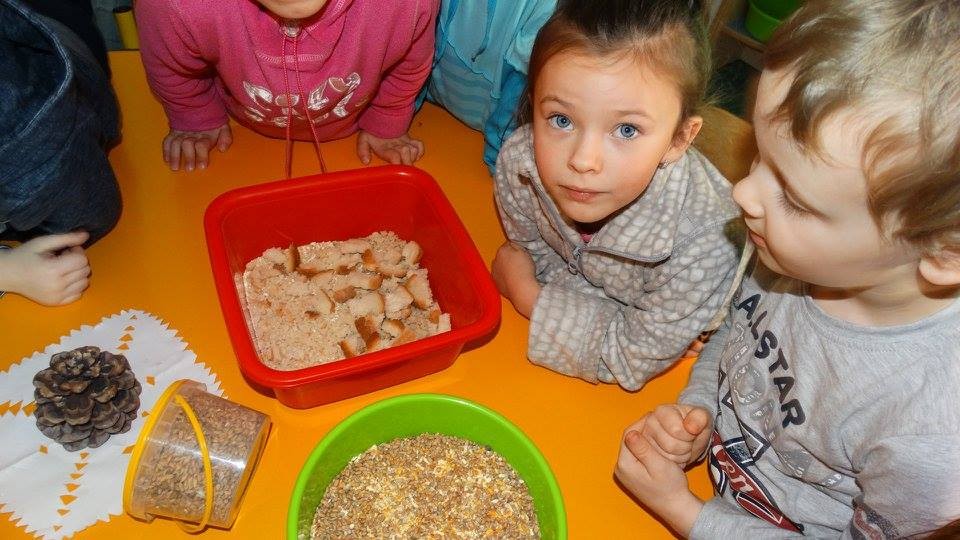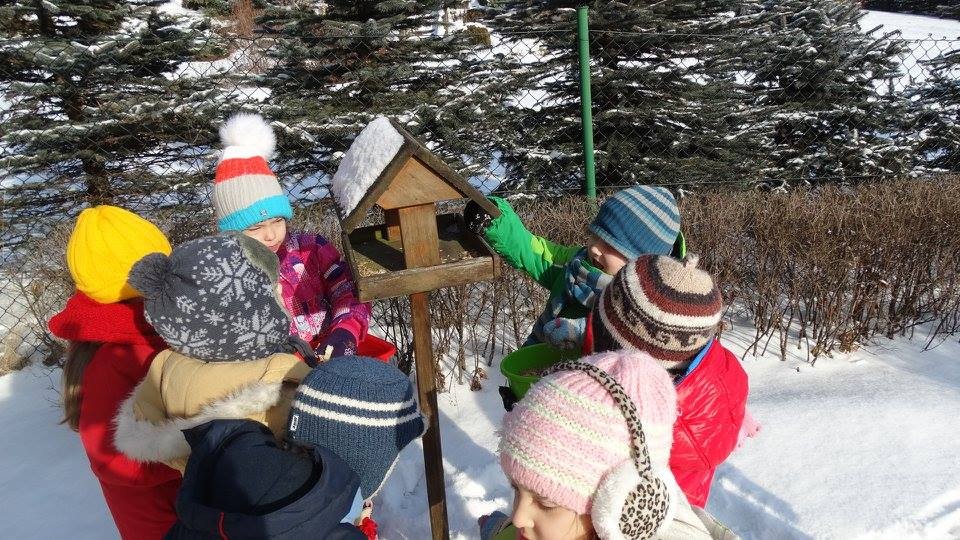 Wraz z pojawieniem się pierwszych płatków śniegu w przedszkolu na parapetach zaczęły gromadzić się ptaki. Dzieci wiedziały, że jest to sygnał aby pomóc ptakom w zdobywaniu pokarmu – w te pędy zgromadziły potrzebne produkty tj. ziarna pszenicy, kukurydzy, słonecznika, orzeszków i słoninkę. Wszystkie składniki zostały dokładnie wymieszane. Przygotowane smakołyki dla skrzydlatych przyjaciół dzieci wsypały do karmnika. Mimo szczypiącego mrozu dzieci obserwowały zlatujące się zewsząd ptaszki, które z wielkim zapałem dziobały pożywienie. Codziennie uczniowie zaglądają do karmnika i uzupełniając „ ptasią stołówkę”.