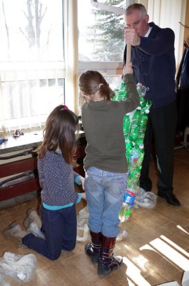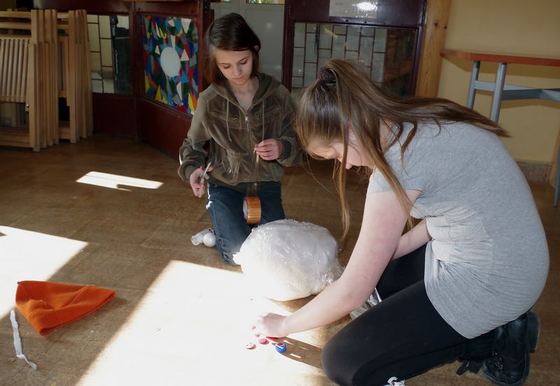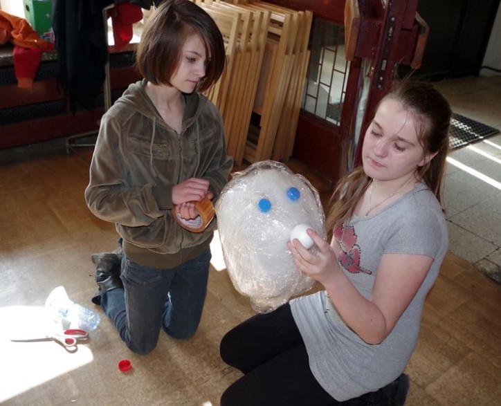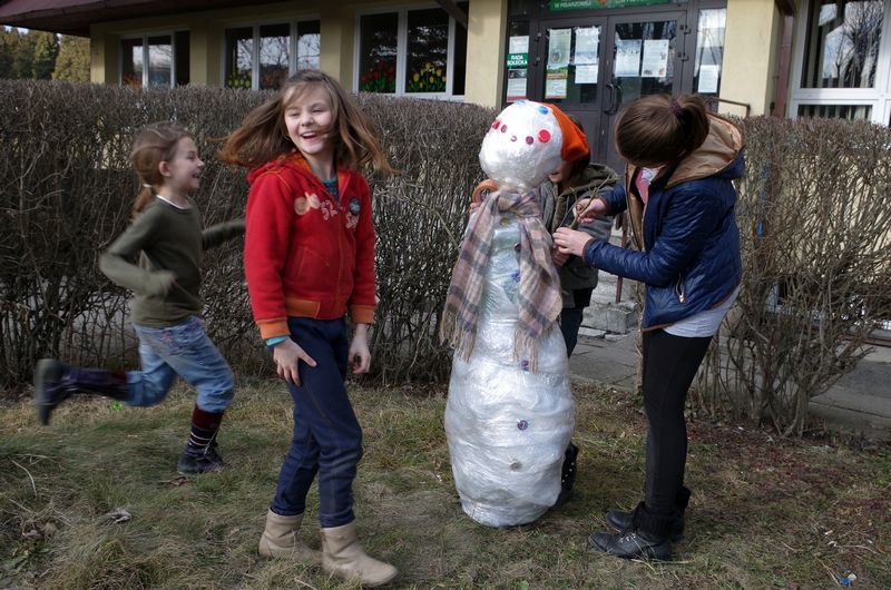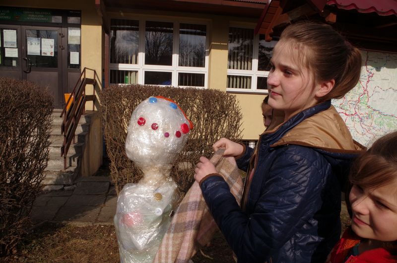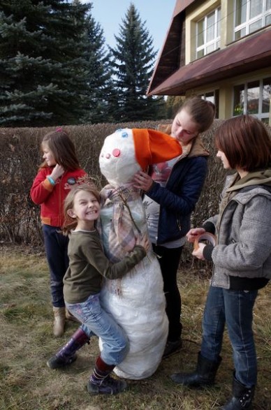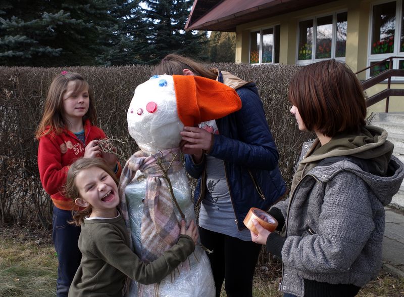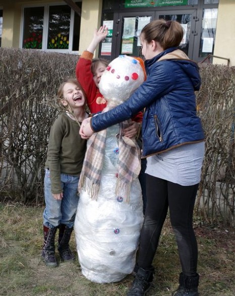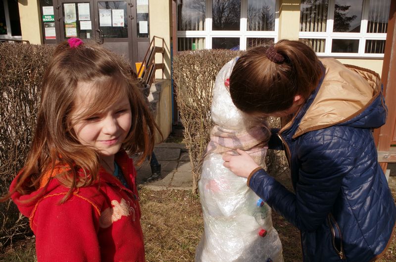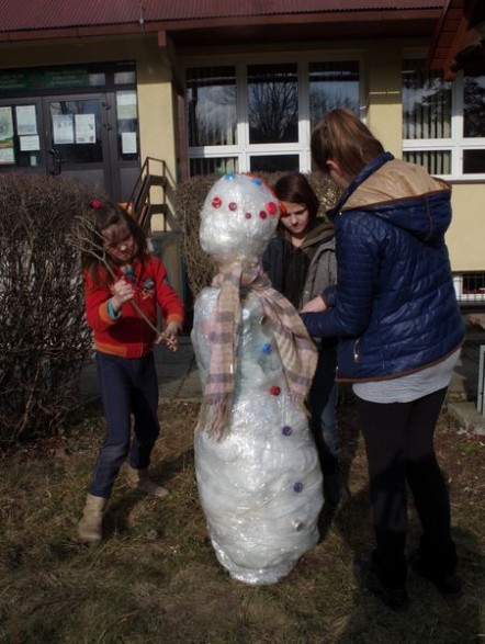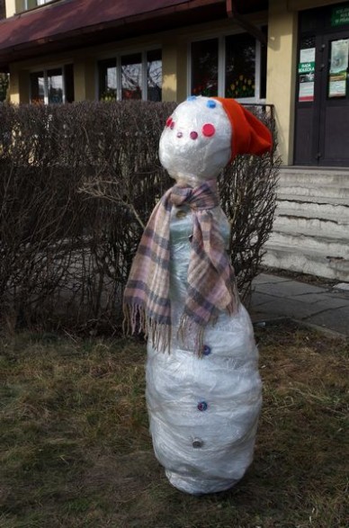 Planując Dzień Bałwana w ostatni dzień lutego, trudno przewidzieć zmiany klimatyczne. A właśnie one pokrzyżowały nieco plany uczestników zajęć feryjnych w Świetlicy w Pisarzowej. Jednak dzieciaki korzystając z ostatnich dni wolnych od szkoły nie dały za wygraną, a że w programie były takie zajęcia, to je uskuteczniono. Zamiast śniegu, którego oczywiście przy tej pogodzie być nie może, wykorzystały śmieci, a konkretnie puste butelki po napojach. Do tego kilka zabiegów kosmetycznych, gustowna czapeczka- i bałwan odporny na warunki atmosferyczne gotowy. Spełniając już swoją rolę- trafi do białego worka na segregowane odpady, czyli prawie tak, jakby stopniał.