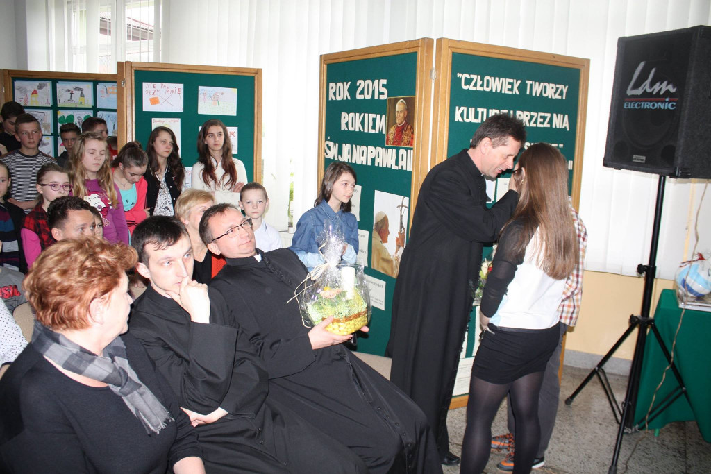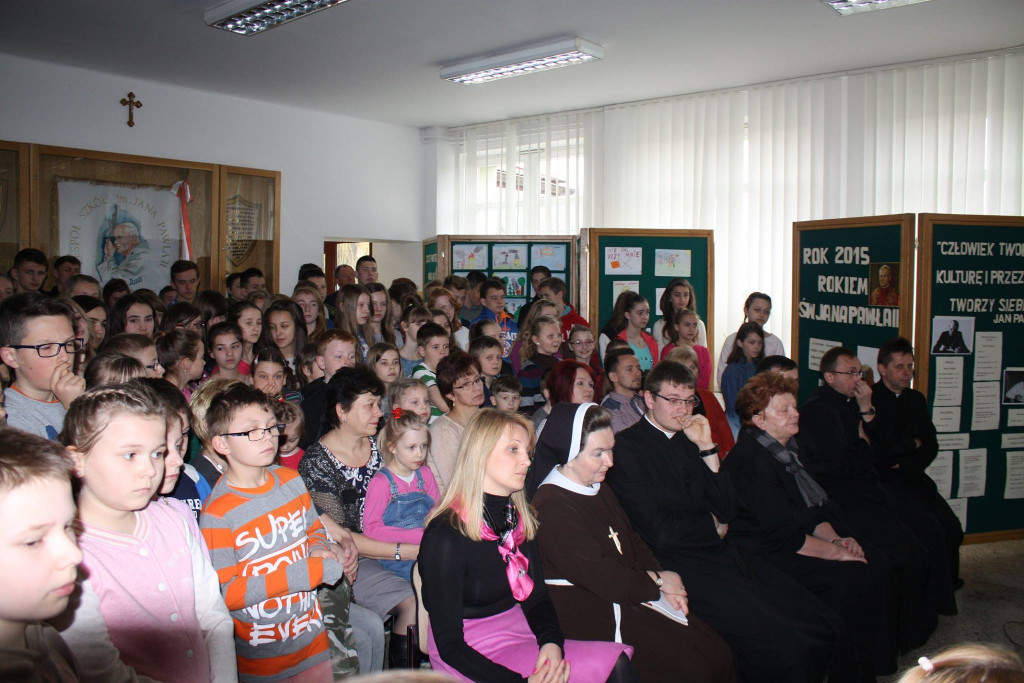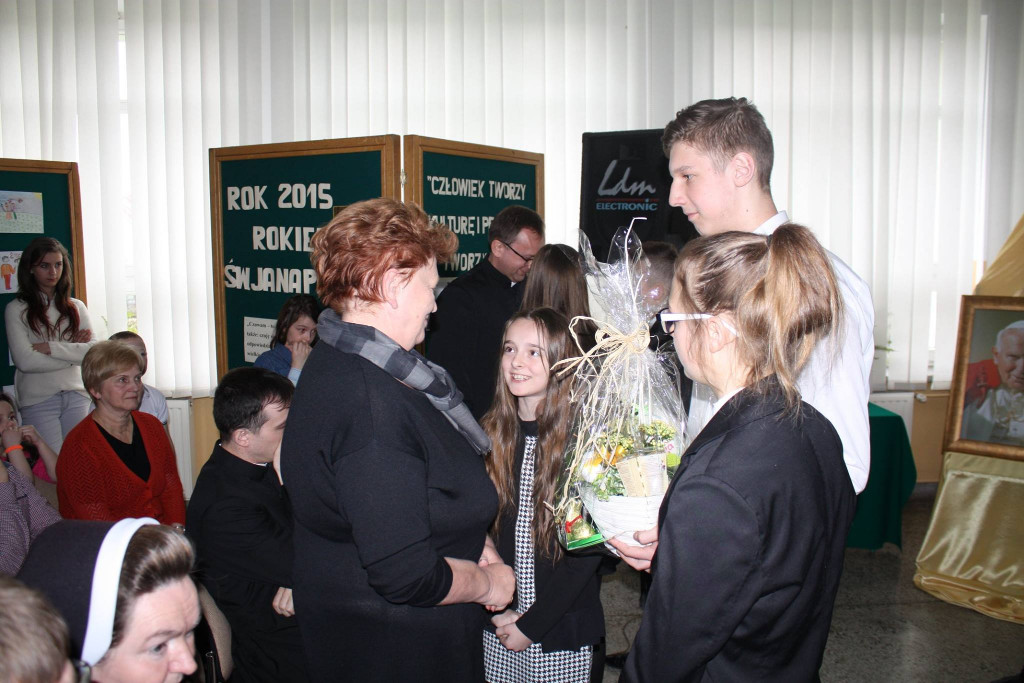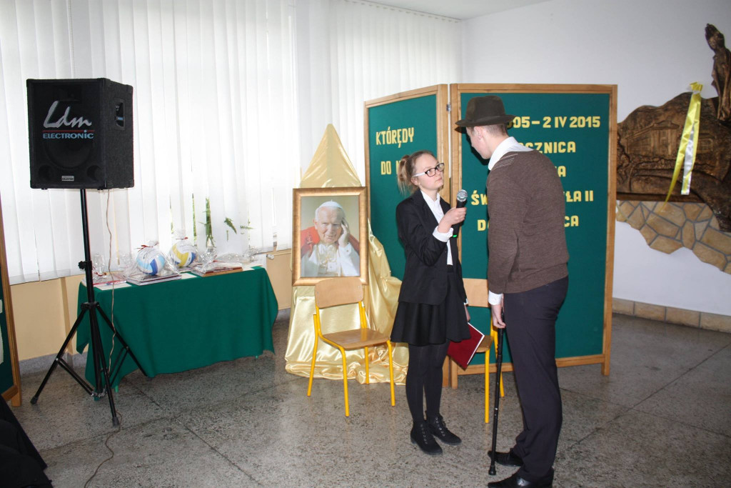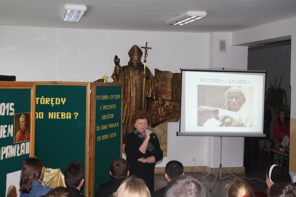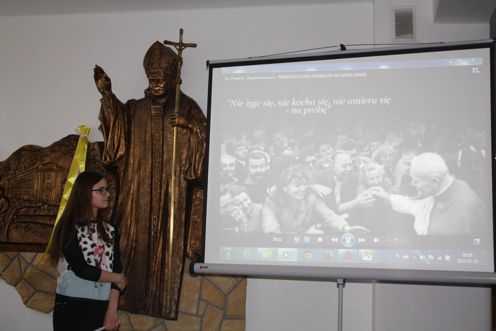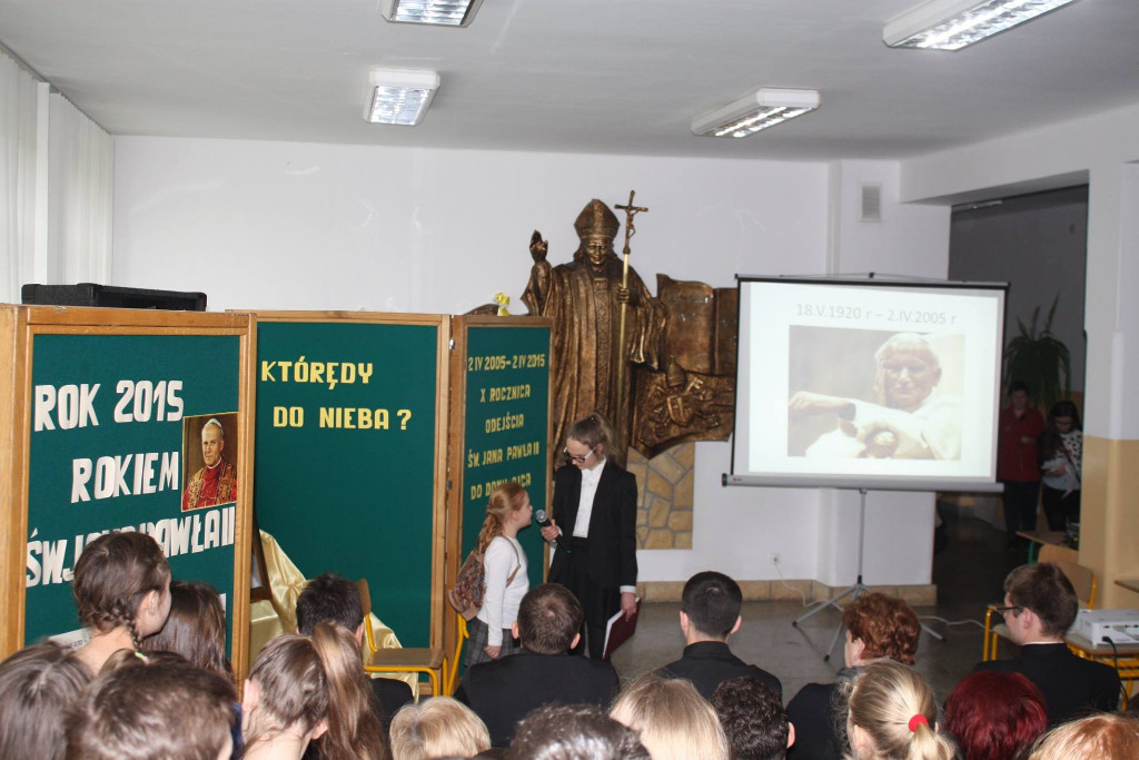 w pamięci i sercach Polaków. Ponadto odegrana scenka na temat autorytetów współczesnej młodzieży uświadomiła widzom, iż Jan Paweł II może i dziś być wzorem do naśladowania dla nastolatków. Prezentacja multimedialna wkomponowana w przedstawienie ukazała postać naszego Patrona jako nietuzinkowego człowieka. Był poetą, poliglotą, aktorem, dramaturgiem oraz pedagogiem. Uwielbiał zarazem spędzać czas na łonie natury, biorąc udział