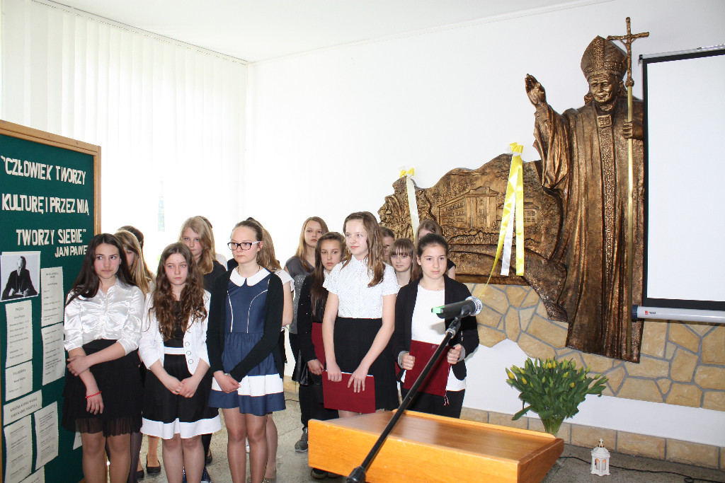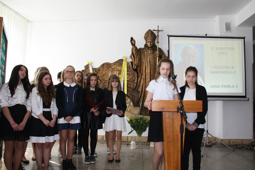 27 kwietnia przypada rocznica kanonizacji św. Jana Pawła II – patrona Zespołu Szkół nr 1 w Męcinie. Pragnąc uczcić dzień, w którym Papież Polak został ogłoszony świętym, uczniowie klasy I b gimnazjum pod kierunkiem wychowawczyni przygotowali montaż słowno -muzyczny. W poświęconym św. Janowi Pawłowi II przedstawieniu wykorzystano fragmenty filmów dokumentalnych, relacje z pielgrzymek, przypomniano liczne przemówienia, szczególnie te, w których Ojciec Święty zwracał się bezpośrednio do ludzi młodych.