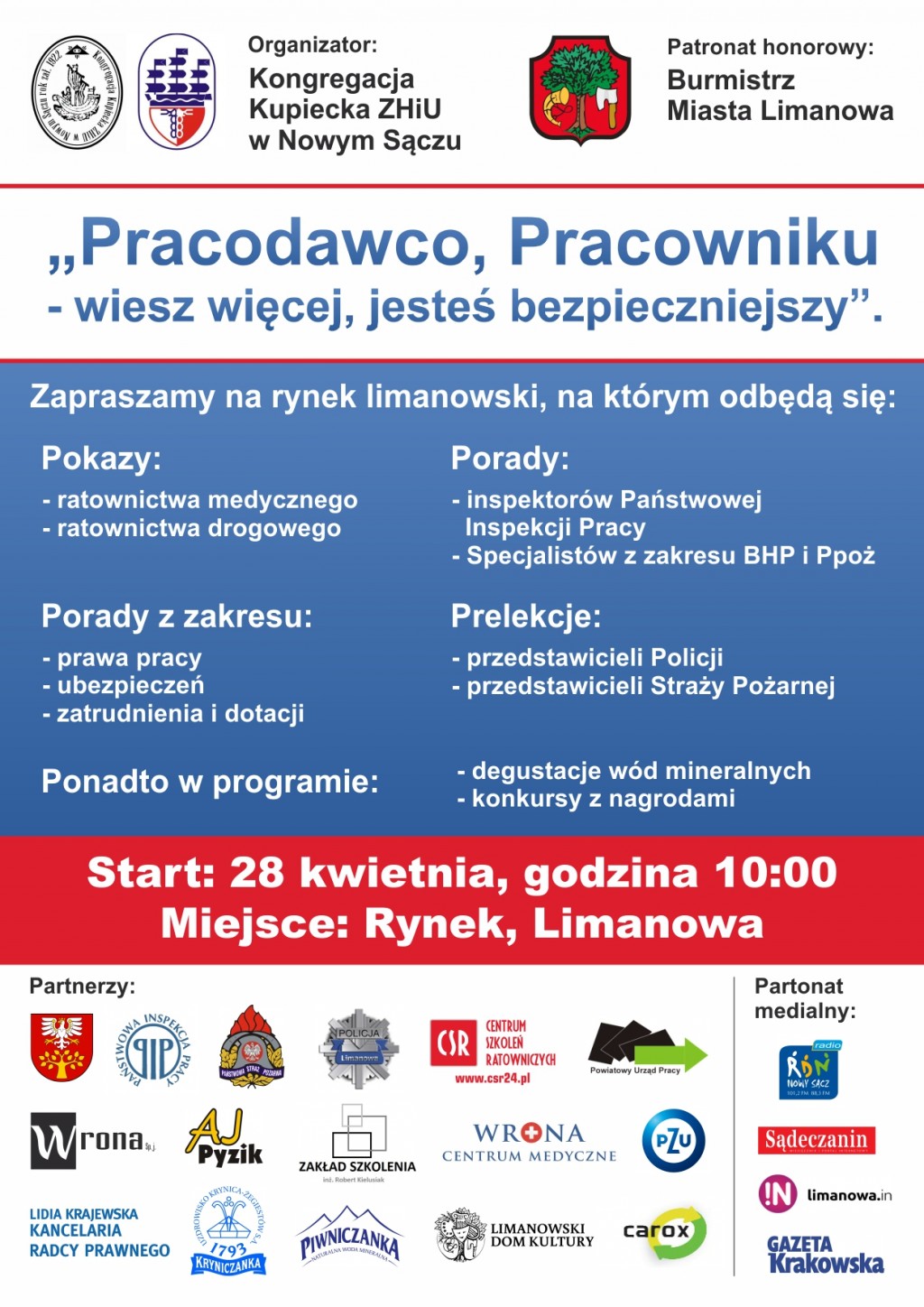 Kongregacja Kupiecka Zrzeszenia Handlu i Usług w Nowym Sączu jako organizacja zrzeszająca przedsiębiorców, a tym samym pracodawców powiatów nowosądeckiego, limanowskiego, gorlickiego, nowotarskiego i tatrzańskiego organizuje z tego tytułu dnia 28 kwietnia 2015r. trzecią edycję kampanii społecznej pod nazwą "Pracodawco, Pracowniku - wiesz więcej, jesteś bezpieczniejszy”.