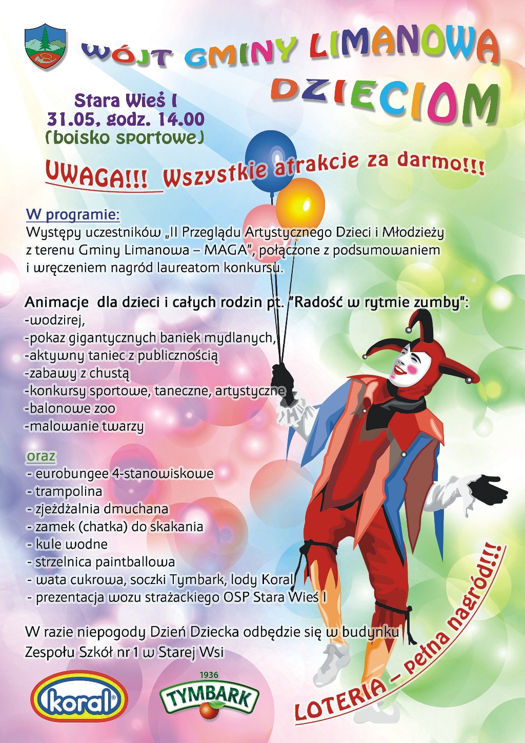 31 maja 2015 roku tj. w niedzielę w Starej Wsi I - Rola z okazji Dnia Dziecka, odbędzie się piknik pod nazwą: Wójt Gminy Limanowa Dzieciom. Zabawę rozpoczynamy o godzinie 14:00 na kompleksie boisk sportowych (pod kościołem). Główną atrakcją programową jak przystało na Dzień Dziecka to występy dzieci - tych najbardziej uzdolnionych z terenu gminy Limanowa. Nie każdy miał okazję widzieć występy naszych młodych artystów podczas II Przeglądu Artystycznego Dzieci i Młodzieży z terenu Gminy Limanowa „MaGa”, toteż umożliwimy Państwu podziwianie na żywo występów naszych gwiazd.