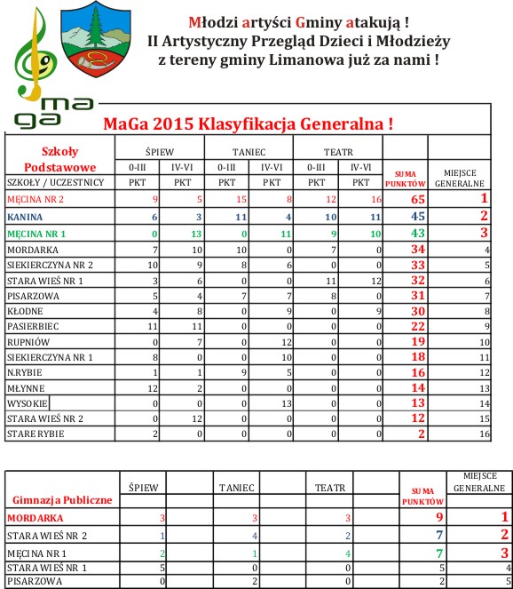 Słowa podziękowania za udział we wszystkich trzech etapach II edycji „MAGI” skierował prowadzący konkurs Kierownik Wydziału Kultury i Promocji Urzędu Gminy Limanowa Wojciech Korabik, jednocześnie zapraszając laureatów na Gminny Dzień Dziecka w Starej Wsi I który będzie zwieńczeniem całej „II MAGI”. A podczas podsumowania, w trakcie trwania Dnia Dziecka wręczenie Statuetek „MAGA” tegorocznym zwycięzcom. A kto zwyciężył i jak wygląda ogólna klasyfikacja po wszystkich trzech konkursach?