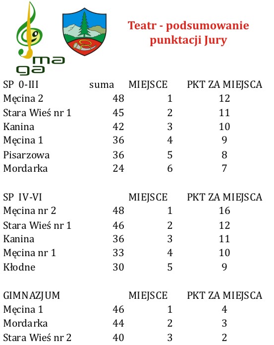 Gimnazja – trochę przez ilość zgłoszeń ,nieco przez liczebność gimnazjów ogółem w naszej gminie ..zawsze będzie te grupę można nazwać grupą „ śmierci” …każdy najmniejszy punkt jest na wagę złota czy tez na wagę MaGa …tak było i tym razem… Gimnazjum w Mordarce zdobywa w tym roku pierwsze miejsce i musi stworzyć naszej zaczarowanej statuetce dogodne miejsce. Nieco z drugiego planu ale systematycznie zajmując drugie miejsca w każdym z konkursów, zasłużenie zwyciężyło nasz przegląd. Tym samym Gimnazjum nr 2 w Starej Wsi jest zmuszone pożegnać się z naszą bajkową postacią …na niewiadomo jak długo … Walka o dwa pozostałe miejsca na podium była niezwykle trudna Gimnazjum nr 2 w Starej Wsi oraz nr 1 w Męcinie uzyskało taką samą liczbę punktów – tych z klasyfikacji poszczególnych konkursów – w takim wypadku odwołujemy się do sumy punktów przyznanych przez Jury w poszczególnych potyczkach. Stara Wieś nr 2 –śpiew -59,5 +taniec -56+teatr 40= 155,5 pkt ; Mecina nr 1 – śpiew -60 + taniec 44,5 + teatr 46 = 150,5. Tym samym miejsce drugie otrzymuje Gimnazjum nr 2 w Starej Wsi a trzecie Męcina nr 1. Gratulujemy zaciętej walki.