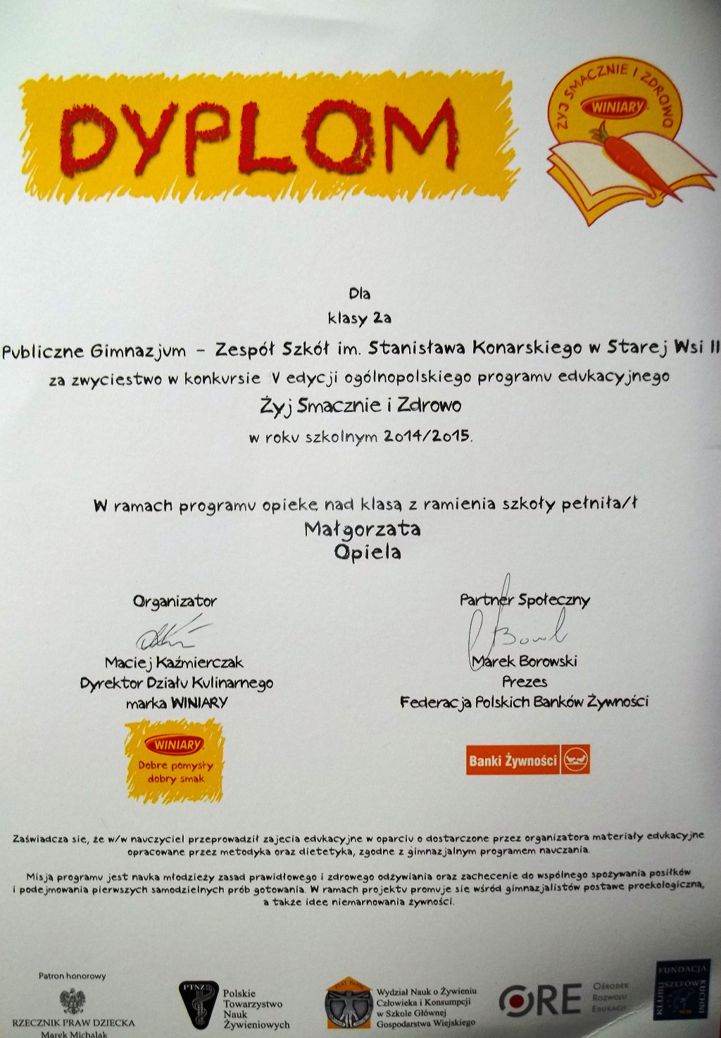 Oficjalny serwisWyróżnienie w V edycji Ogólnopolskiego Konkursu ,,Żyj smacznie i zdrowo” w kategorii Wydarzenie Społeczne otrzymali uczniowie klasy drugiej Publicznego Gimnazjum im. Stanisława Konarskiego w Starej Wsi II. Zorganizowany przez nich festyn ,,W krainie kakao i marchwi” zachwycił komisję konkursową swą oryginalnością i pomysłowością.