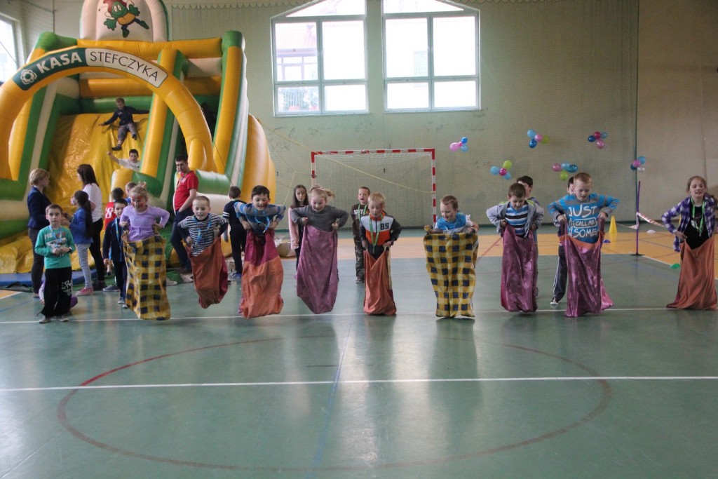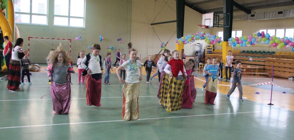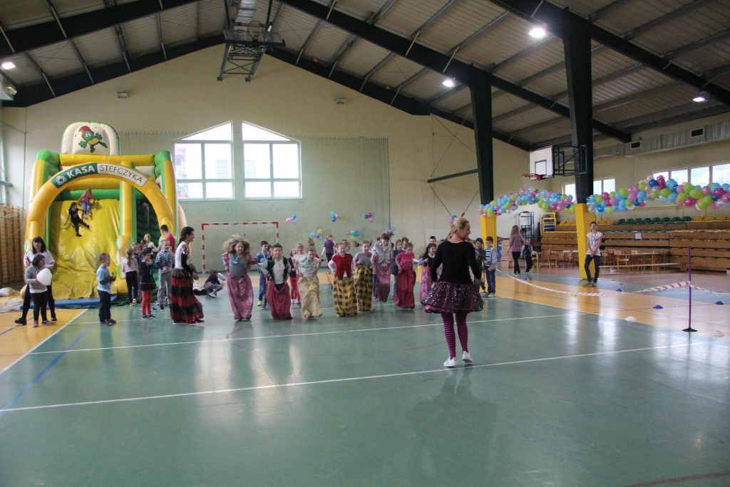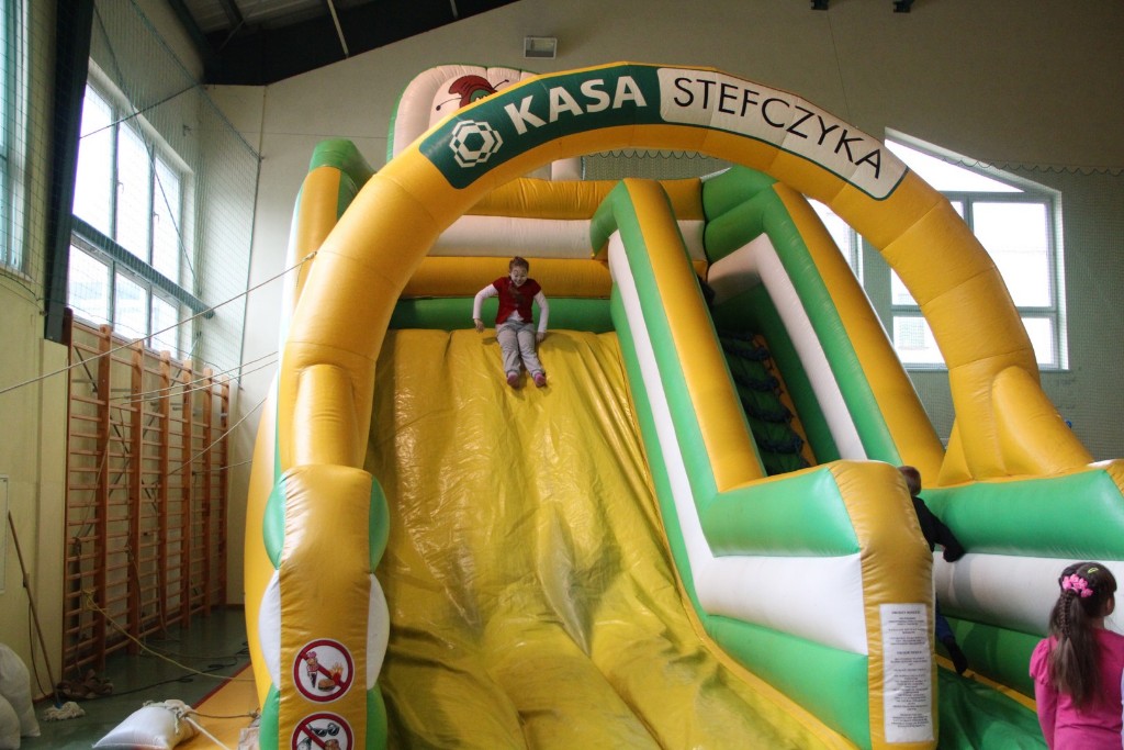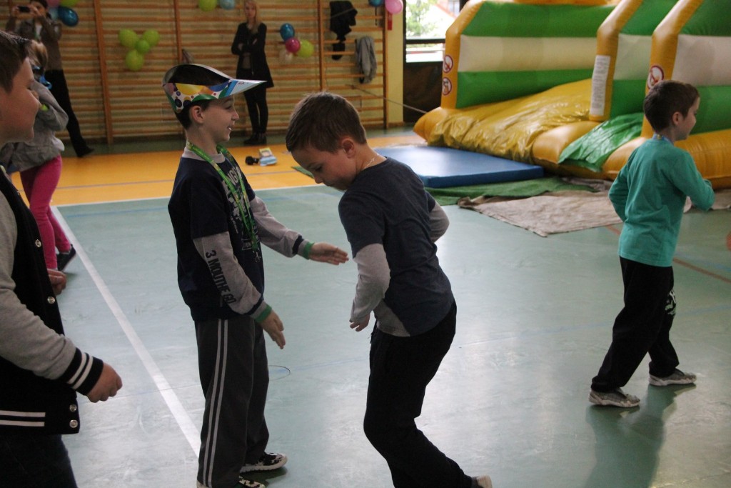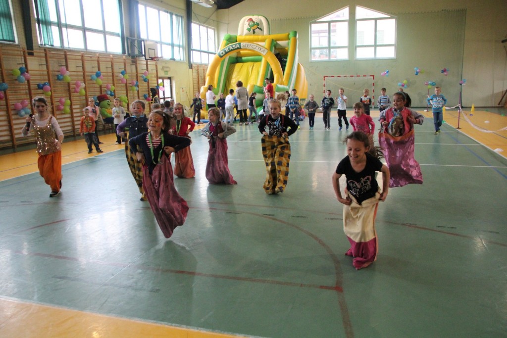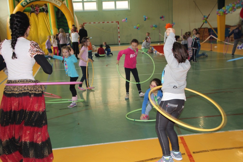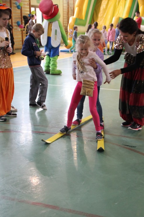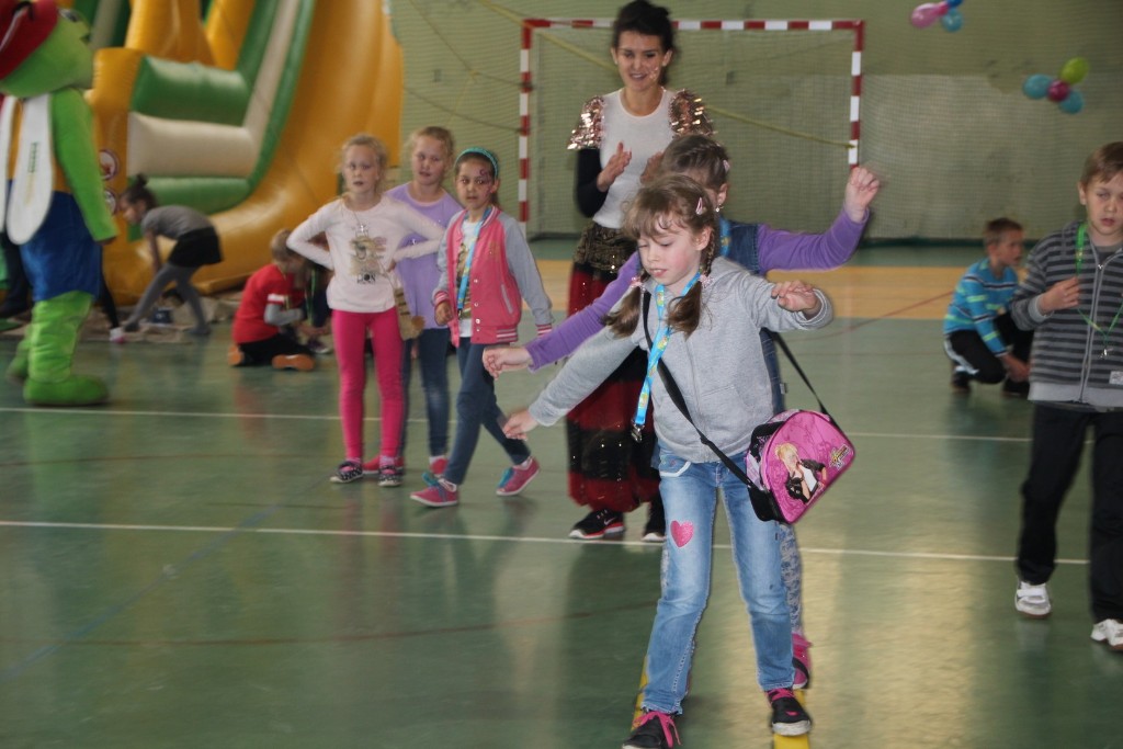 Na parkiecie hali sportowej już od godziny 9 – tej trwała odlotowa impreza prowadzona przez animatorów. Dzieci tańczyły w rytm znanych piosenek. Mogły do woli poszaleć na ogromnej, dmuchanej zjeżdżalni. Każdy mógł skorzystać z usługi: malowanie twarzy, co sprawiło, że zrobiło się nadzwyczaj kolorowo. Wspaniałą atrakcją były również baloniki, które zgodnie z życzeniem dzieci przekształcały się m.in.: w zwierzątka, rośliny – fantazji nie brakowało. Ponadto na specjalnie życzenie najmłodszych uczestników imprezy, szkolna grupa cheerleaders zaprezentowała pokaz swoich umiejętności.