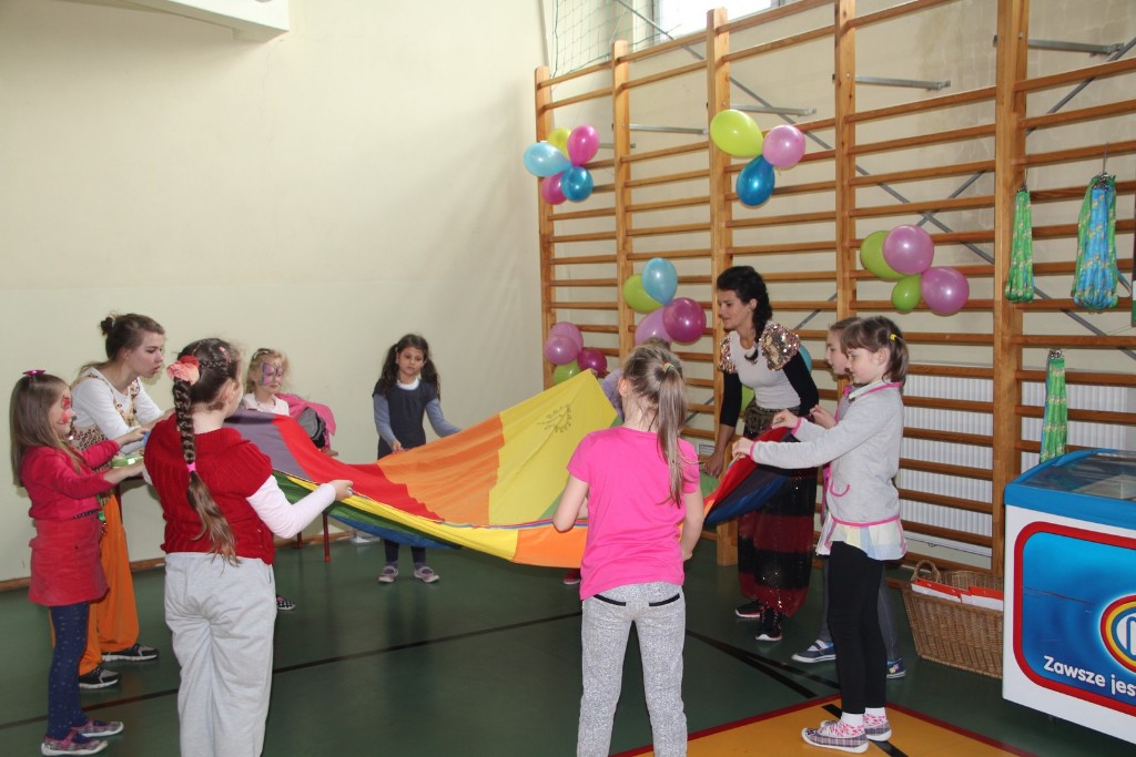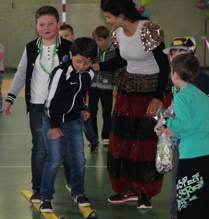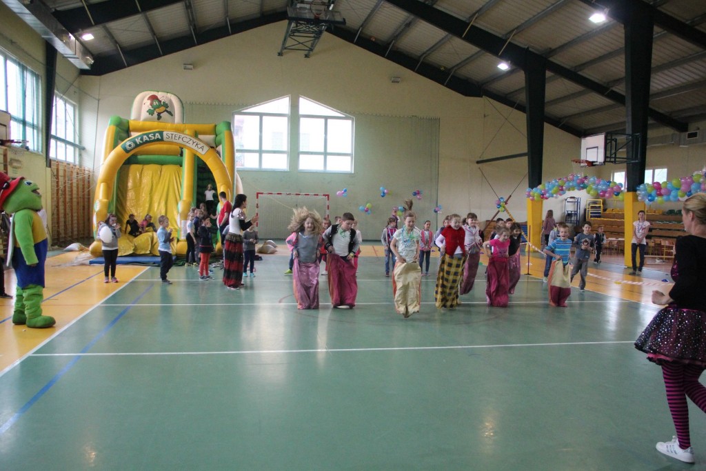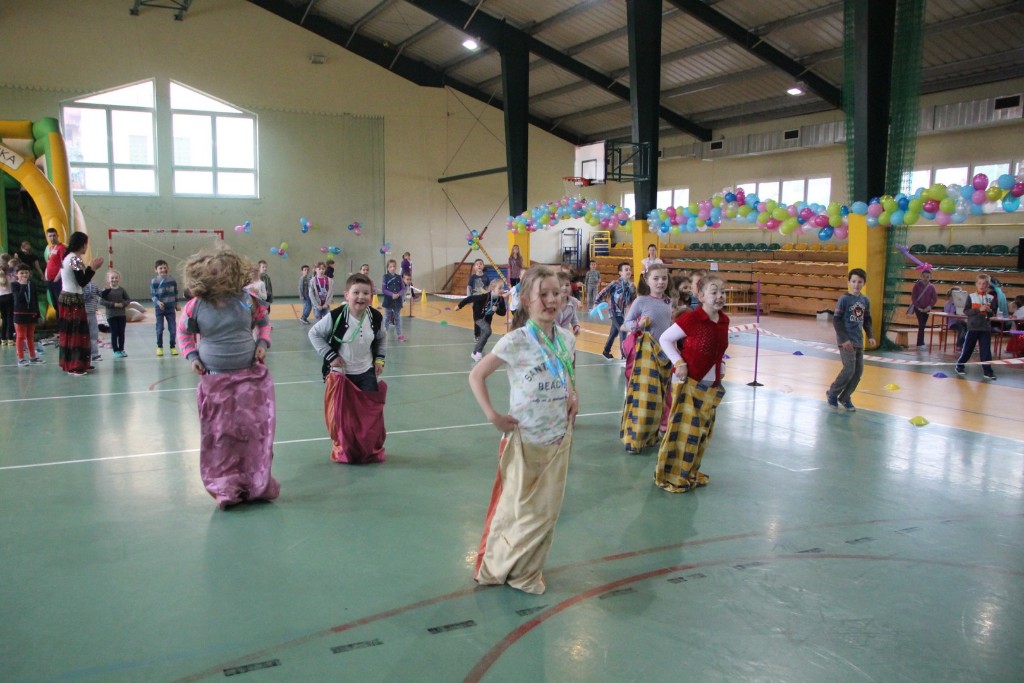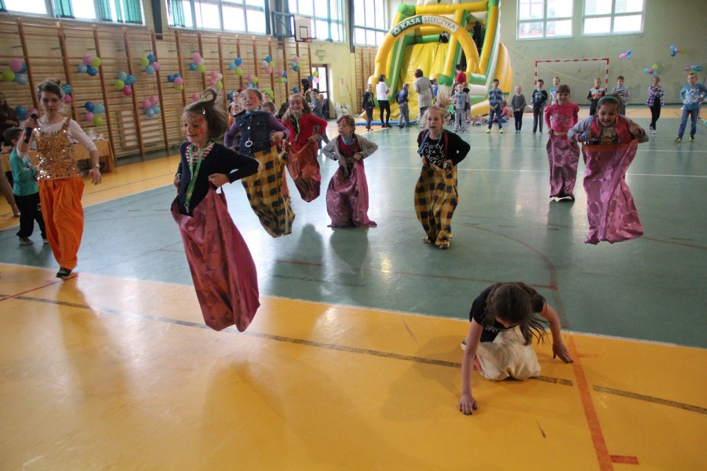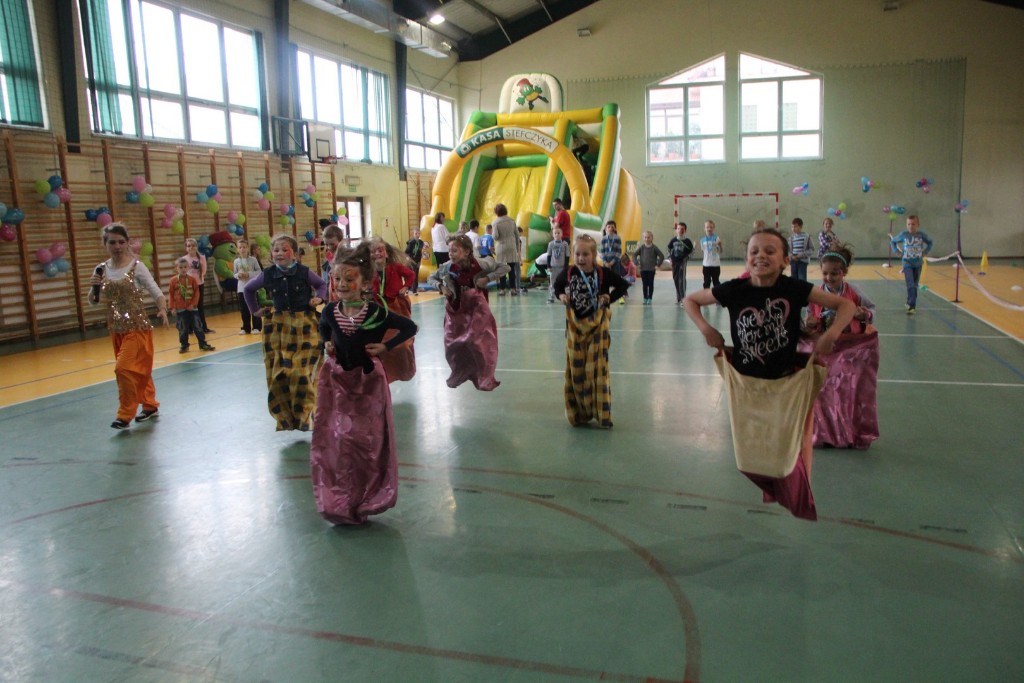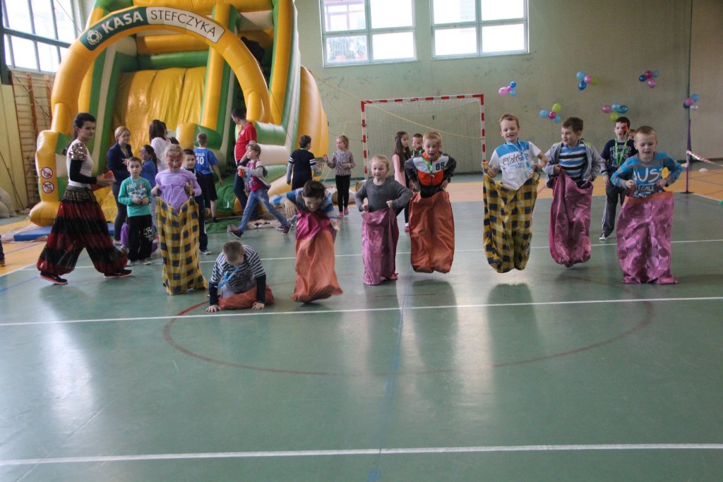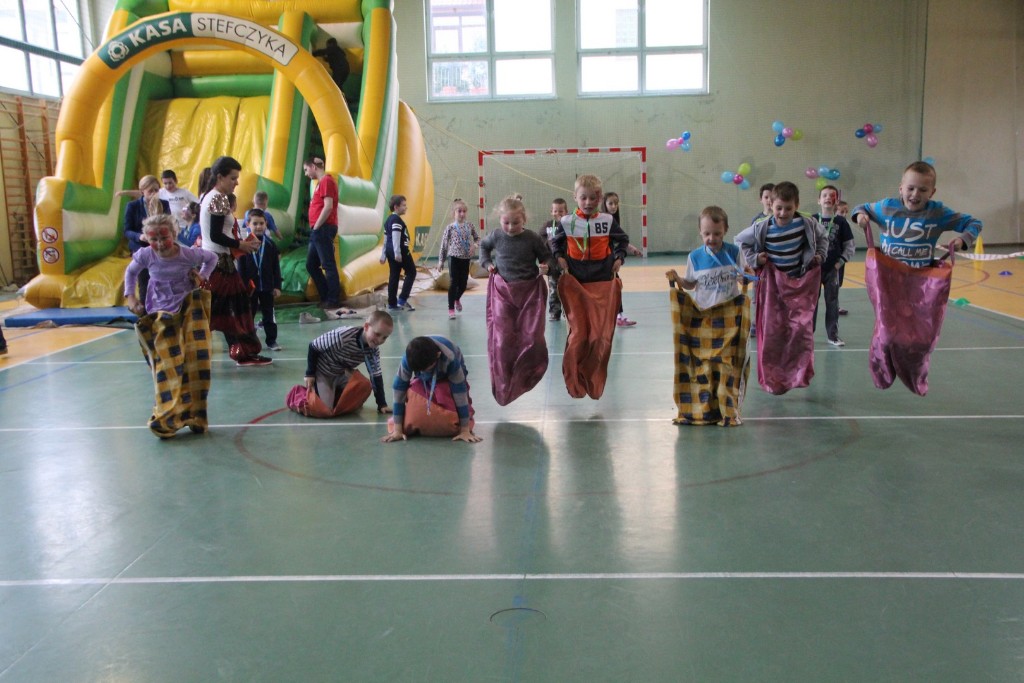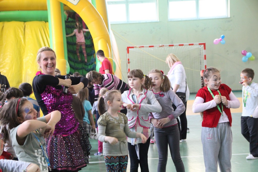 Na parkiecie hali sportowej już od godziny 9 – tej trwała odlotowa impreza prowadzona przez animatorów. Dzieci tańczyły w rytm znanych piosenek. Mogły do woli poszaleć na ogromnej, dmuchanej zjeżdżalni. Każdy mógł skorzystać z usługi: malowanie twarzy, co sprawiło, że zrobiło się nadzwyczaj kolorowo. Wspaniałą atrakcją były również baloniki, które zgodnie z życzeniem dzieci przekształcały się m.in.: w zwierzątka, rośliny – fantazji nie brakowało. Ponadto na specjalnie życzenie najmłodszych uczestników imprezy, szkolna grupa cheerleaders zaprezentowała pokaz swoich umiejętności.
