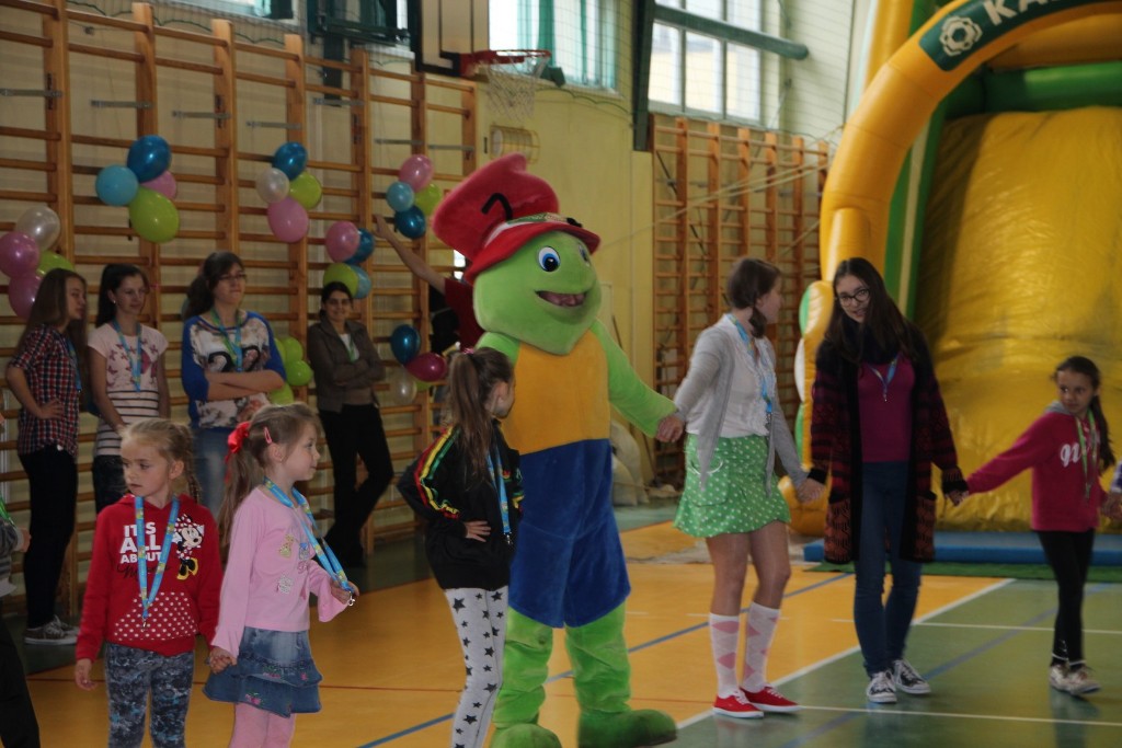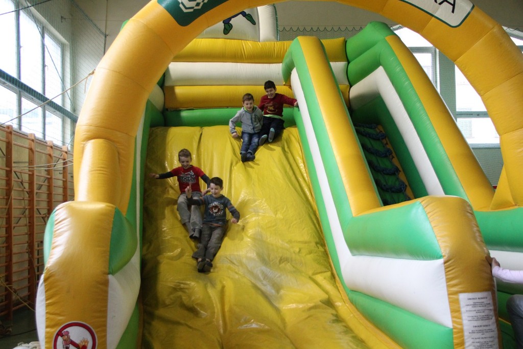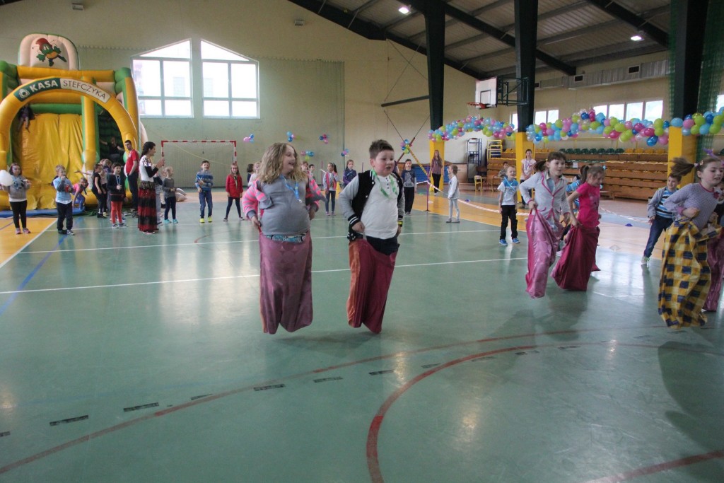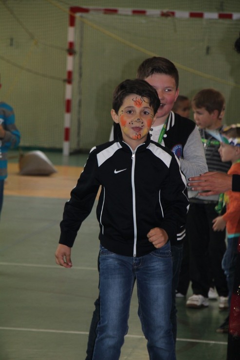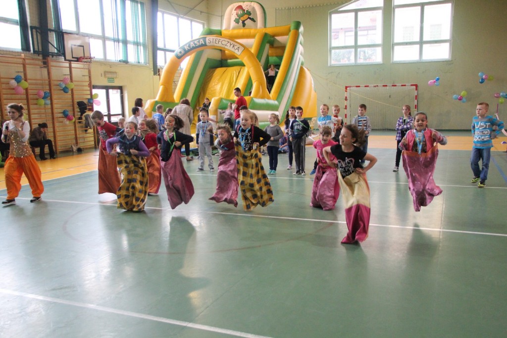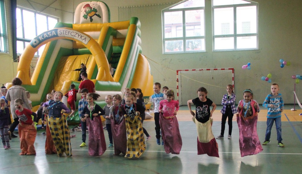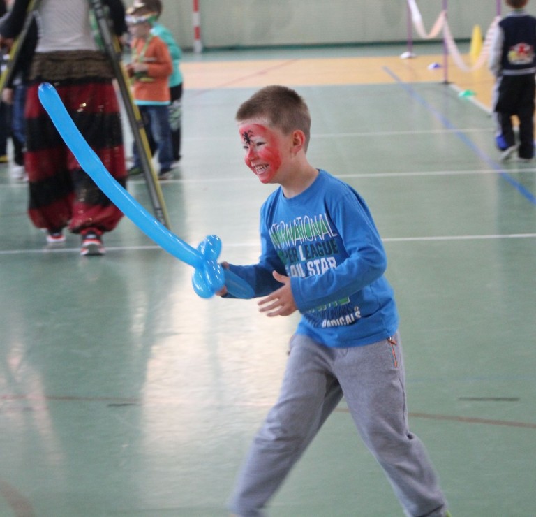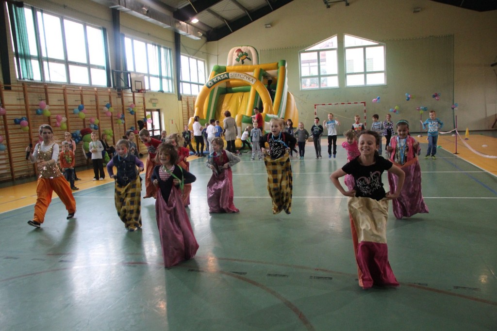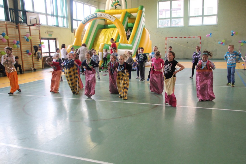 Na parkiecie hali sportowej już od godziny 9 – tej trwała odlotowa impreza prowadzona przez animatorów. Dzieci tańczyły w rytm znanych piosenek. Mogły do woli poszaleć na ogromnej, dmuchanej zjeżdżalni. Każdy mógł skorzystać z usługi: malowanie twarzy, co sprawiło, że zrobiło się nadzwyczaj kolorowo. Wspaniałą atrakcją były również baloniki, które zgodnie z życzeniem dzieci przekształcały się m.in.: w zwierzątka, rośliny – fantazji nie brakowało. Ponadto na specjalnie życzenie najmłodszych uczestników imprezy, szkolna grupa cheerleaders zaprezentowała pokaz swoich umiejętności.