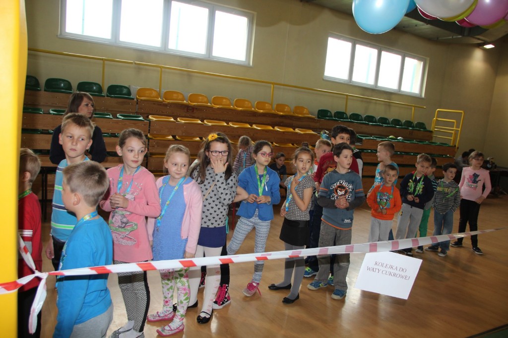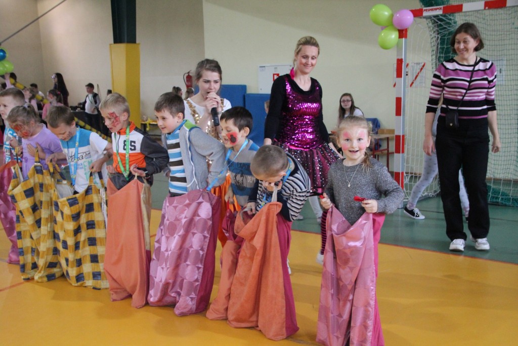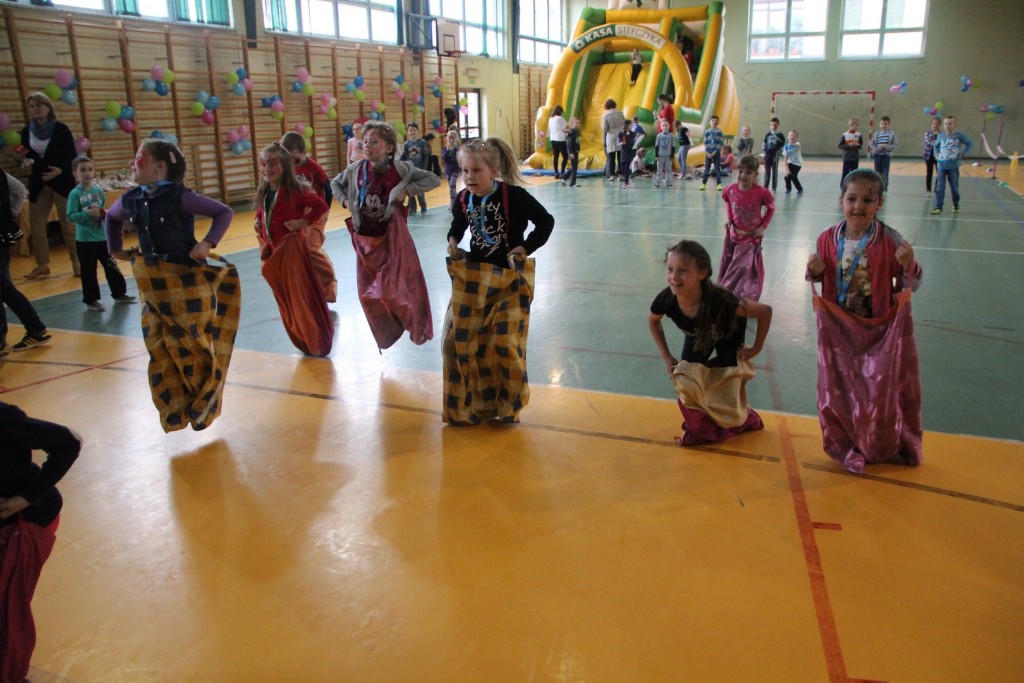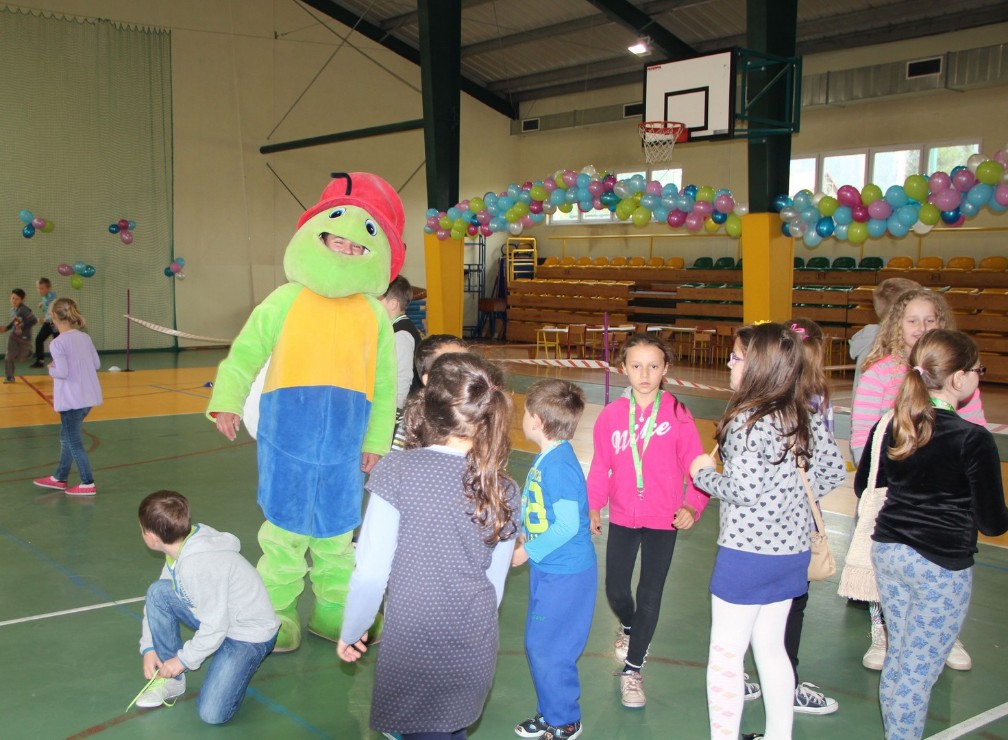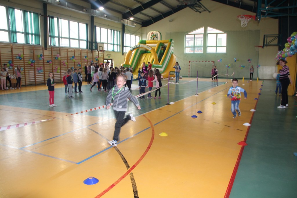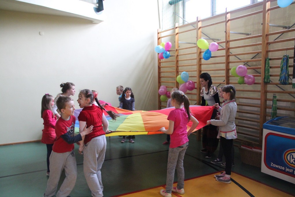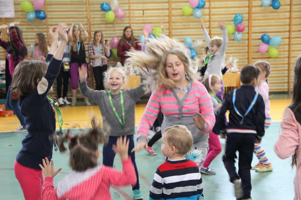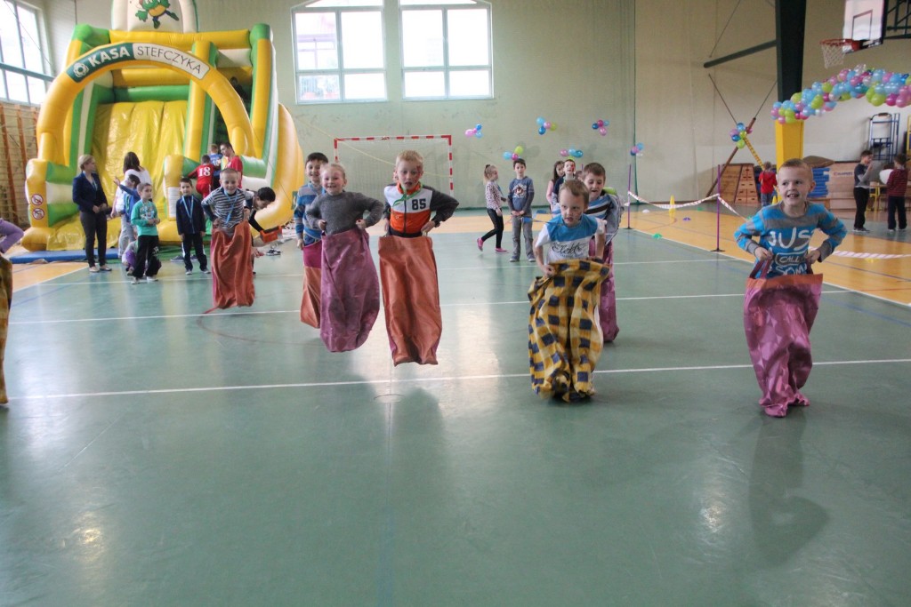 Na parkiecie hali sportowej już od godziny 9 – tej trwała odlotowa impreza prowadzona przez animatorów. Dzieci tańczyły w rytm znanych piosenek. Mogły do woli poszaleć na ogromnej, dmuchanej zjeżdżalni. Każdy mógł skorzystać z usługi: malowanie twarzy, co sprawiło, że zrobiło się nadzwyczaj kolorowo. Wspaniałą atrakcją były również baloniki, które zgodnie z życzeniem dzieci przekształcały się m.in.: w zwierzątka, rośliny – fantazji nie brakowało. Ponadto na specjalnie życzenie najmłodszych uczestników imprezy, szkolna grupa cheerleaders zaprezentowała pokaz swoich umiejętności.