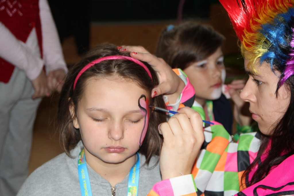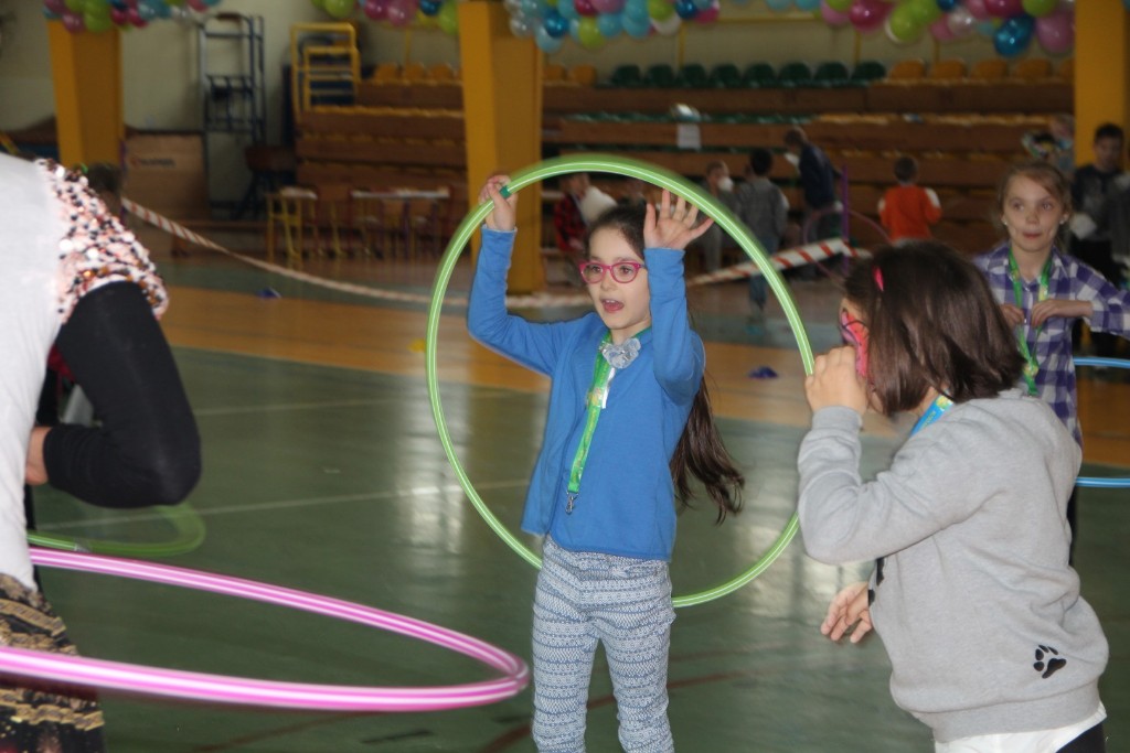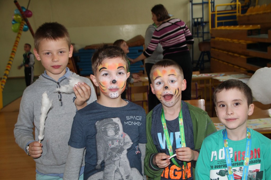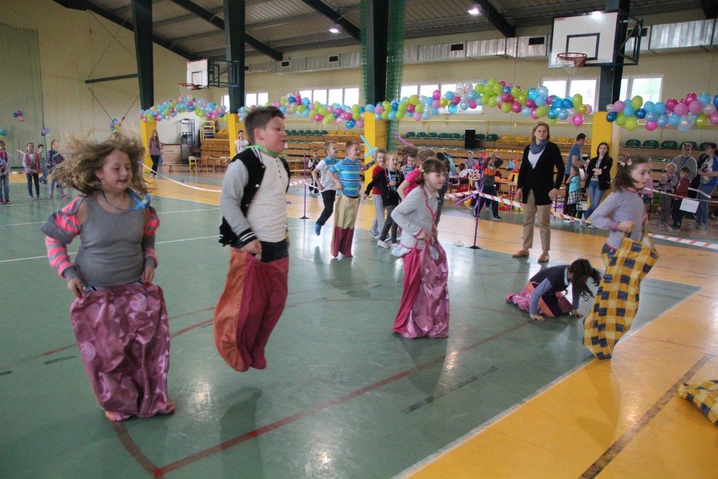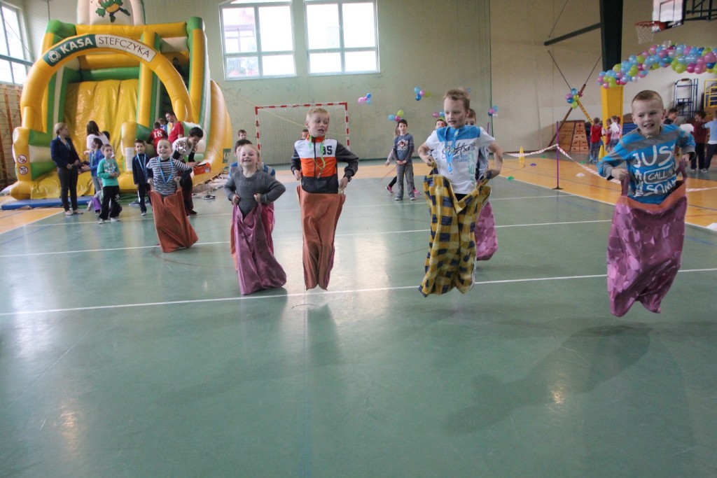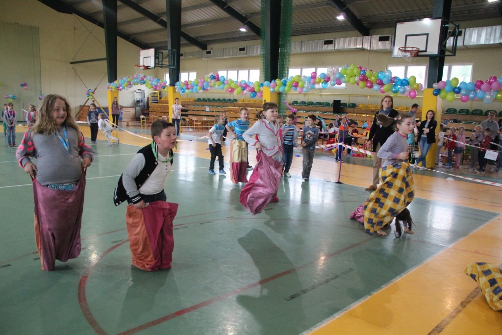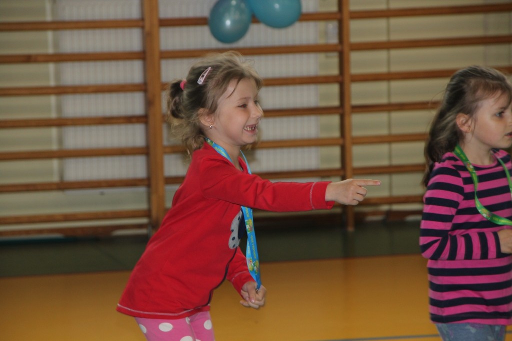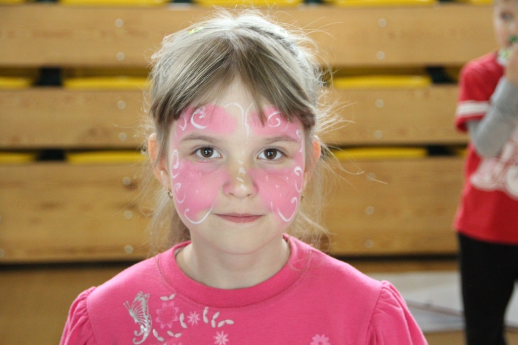 Na parkiecie hali sportowej już od godziny 9 – tej trwała odlotowa impreza prowadzona przez animatorów. Dzieci tańczyły w rytm znanych piosenek. Mogły do woli poszaleć na ogromnej, dmuchanej zjeżdżalni. Każdy mógł skorzystać z usługi: malowanie twarzy, co sprawiło, że zrobiło się nadzwyczaj kolorowo. Wspaniałą atrakcją były również baloniki, które zgodnie z życzeniem dzieci przekształcały się m.in.: w zwierzątka, rośliny – fantazji nie brakowało. Ponadto na specjalnie życzenie najmłodszych uczestników imprezy, szkolna grupa cheerleaders zaprezentowała pokaz swoich umiejętności.