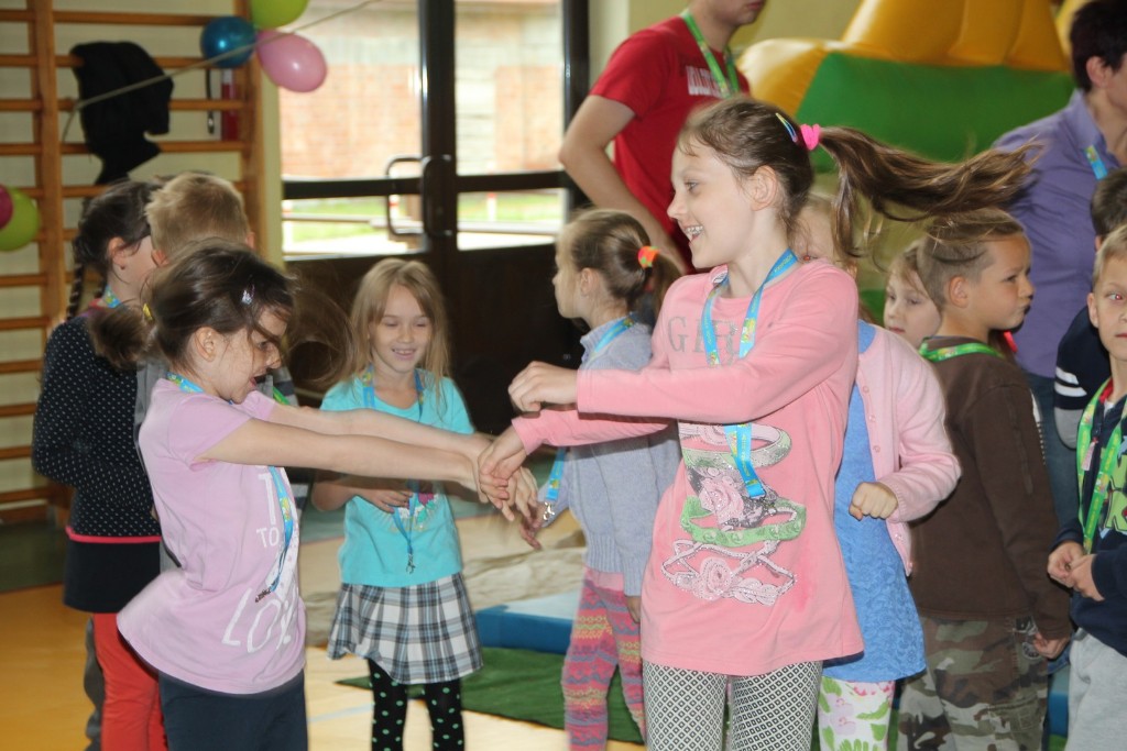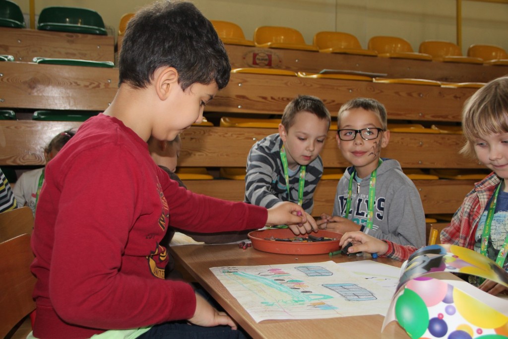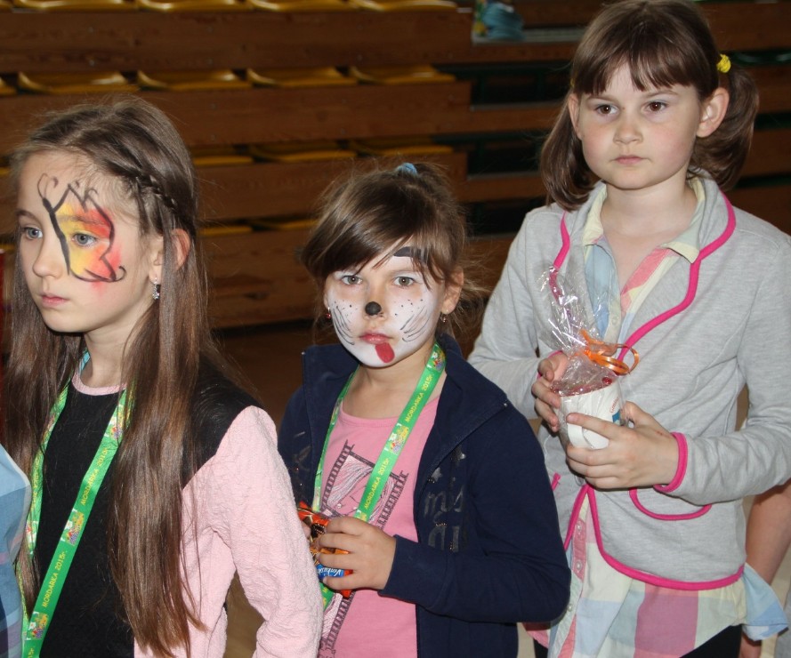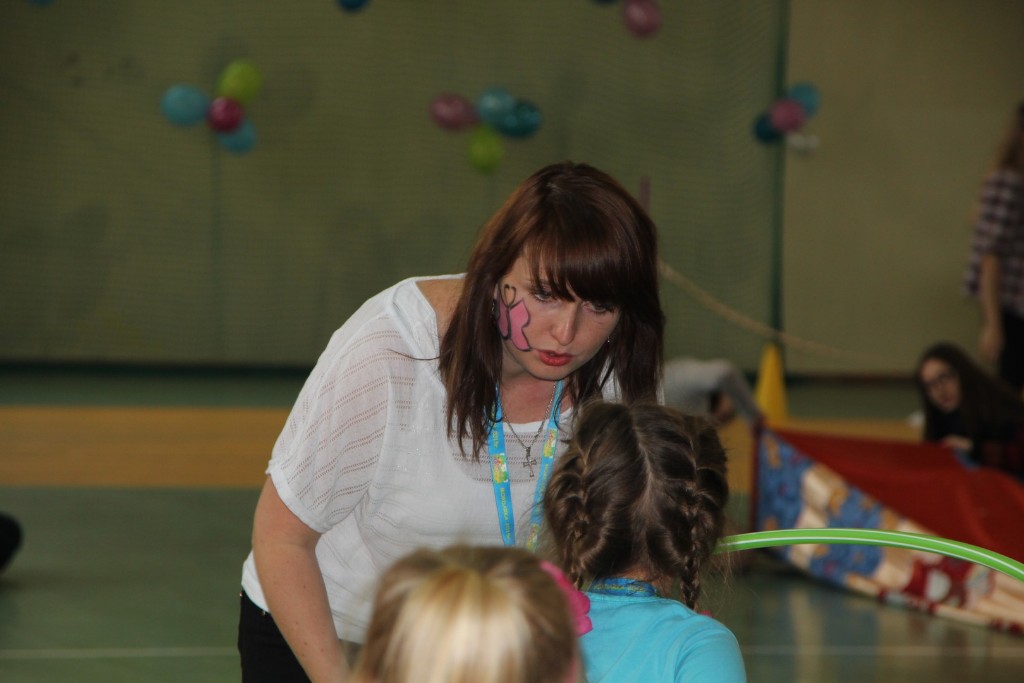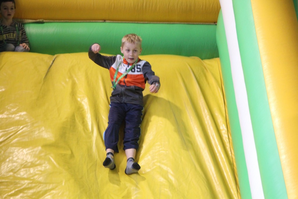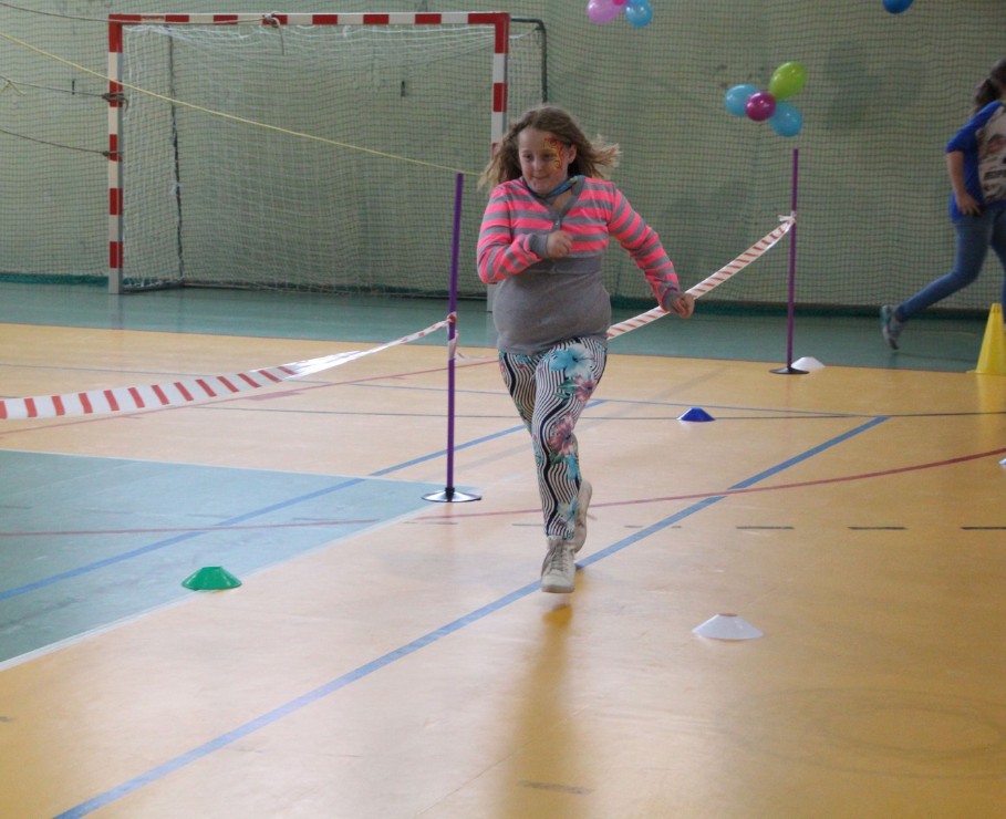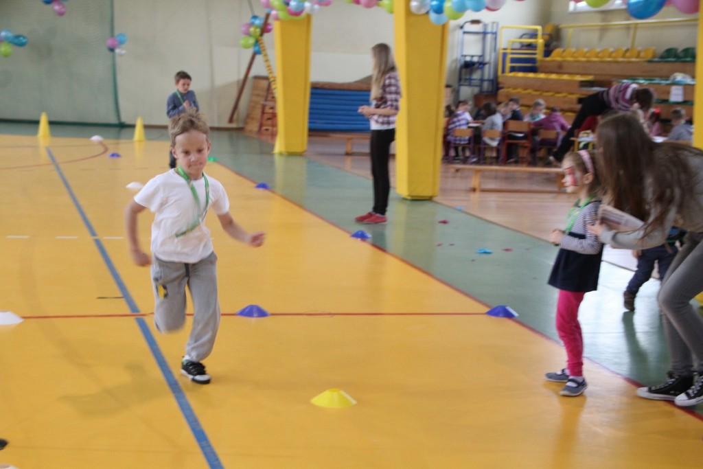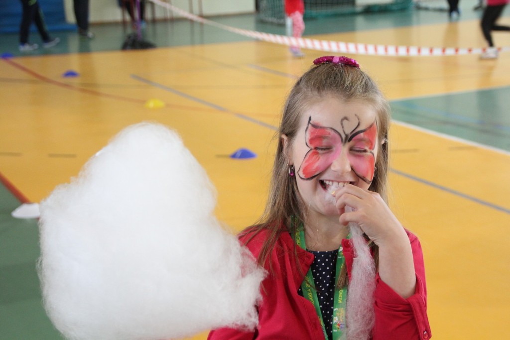 Na parkiecie hali sportowej już od godziny 9 – tej trwała odlotowa impreza prowadzona przez animatorów. Dzieci tańczyły w rytm znanych piosenek. Mogły do woli poszaleć na ogromnej, dmuchanej zjeżdżalni. Każdy mógł skorzystać z usługi: malowanie twarzy, co sprawiło, że zrobiło się nadzwyczaj kolorowo. Wspaniałą atrakcją były również baloniki, które zgodnie z życzeniem dzieci przekształcały się m.in.: w zwierzątka, rośliny – fantazji nie brakowało. Ponadto na specjalnie życzenie najmłodszych uczestników imprezy, szkolna grupa cheerleaders zaprezentowała pokaz swoich umiejętności.