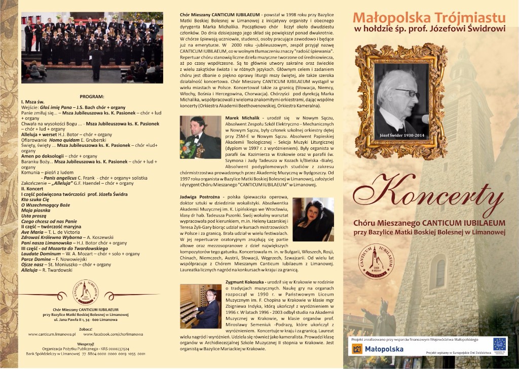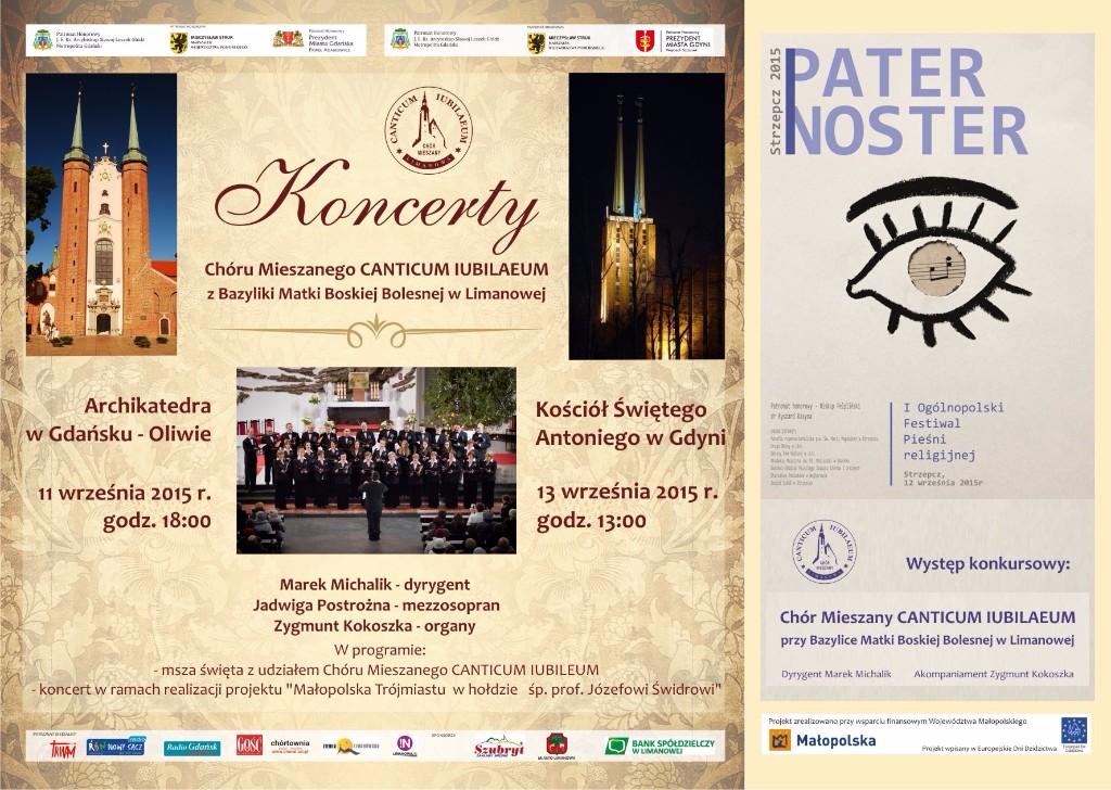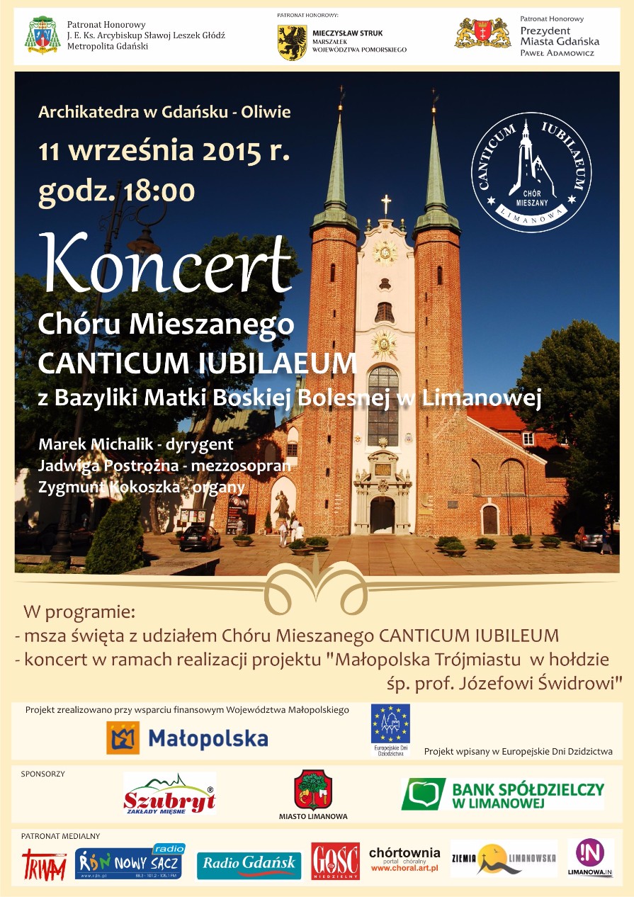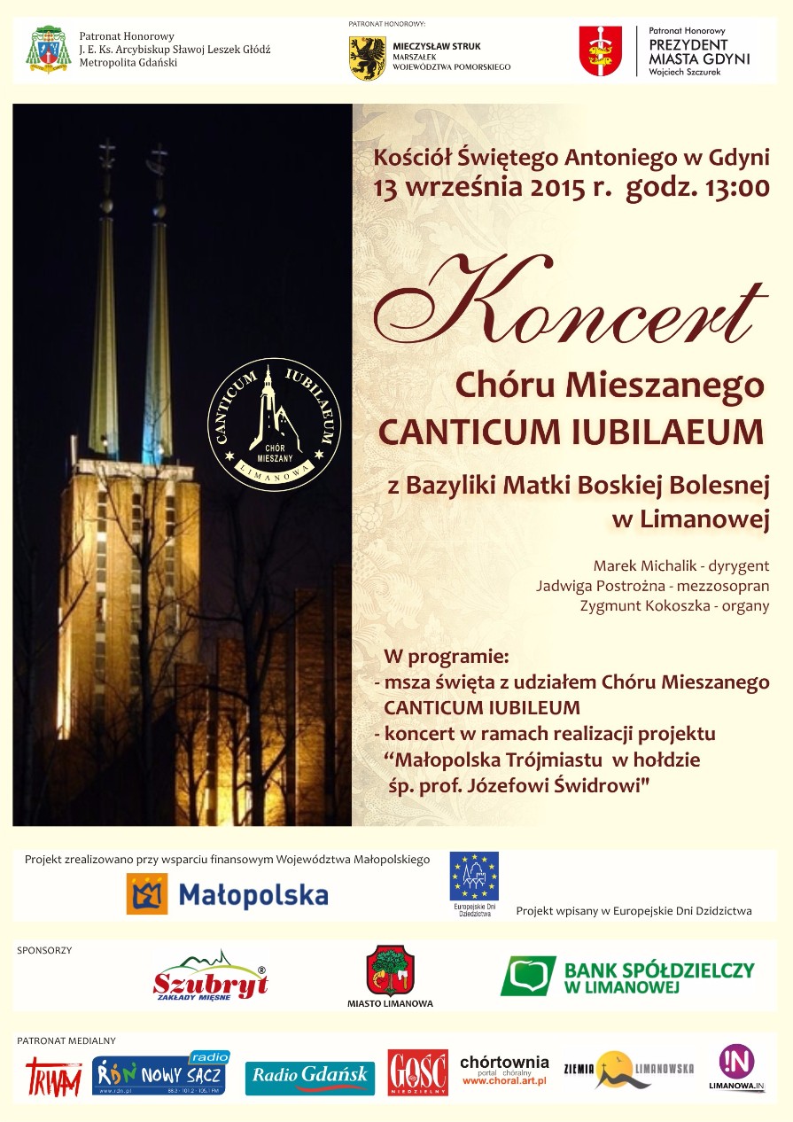 Podczas trasy koncertowej na Wybrzeżu Gdańskim , chór z Limanowej będzie realizował projekt współfinansowany ze środków Województwa Małopolskiego w ramach konkursu "Mecenat Małopolski 2015" . Nazwa projektu to "Małopolska Trójmiastu w hołdzie śp. prof. Józefowi Świdrowi - koncerty Chóru Mieszanego CANTICUM IUBILAEUM z Limanowej". Nagradzany licznymi nagrodami zespół pod dyrekcją Marka Michalika wystąpi 11 września