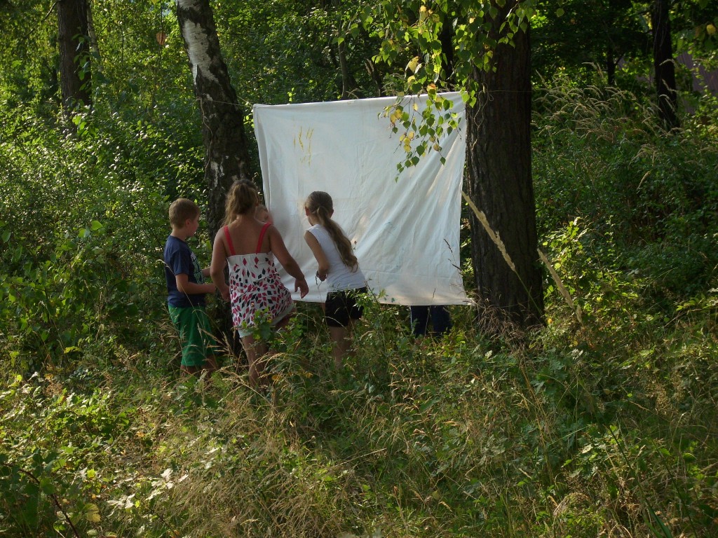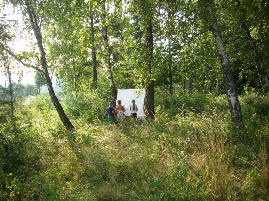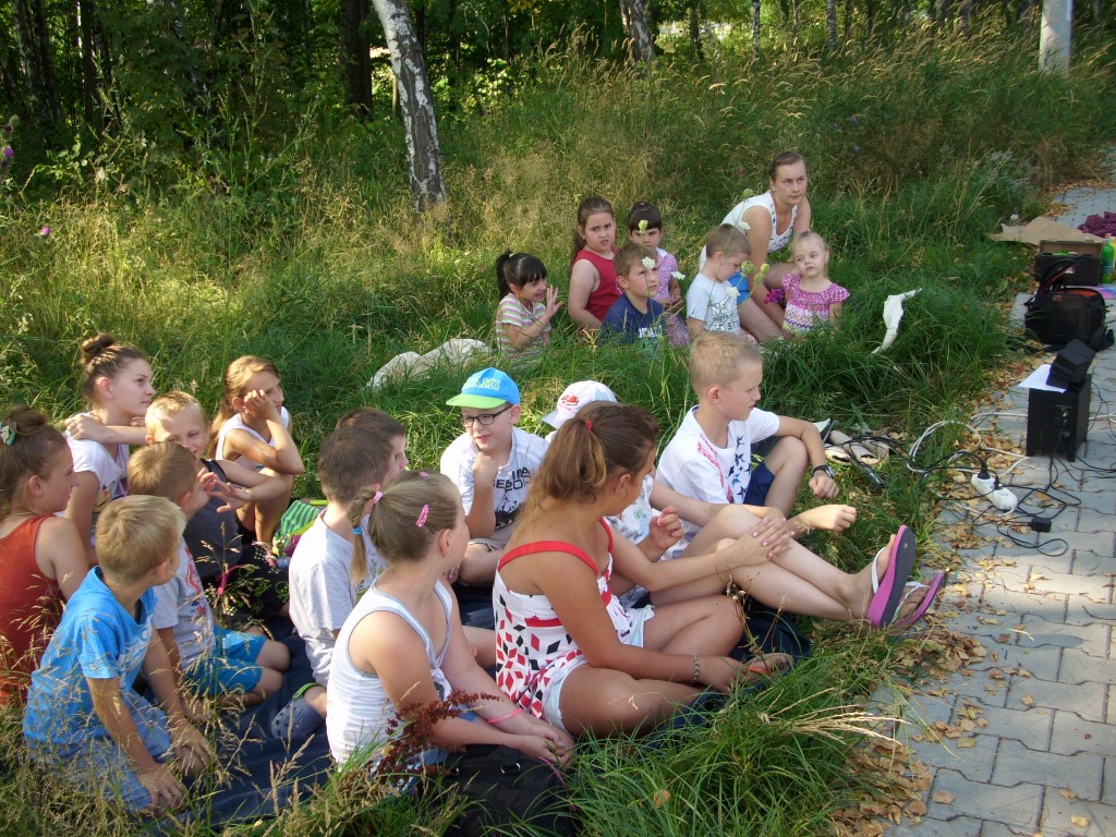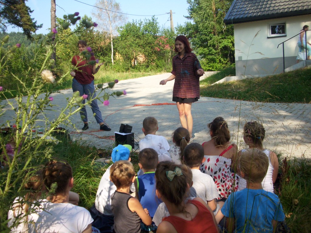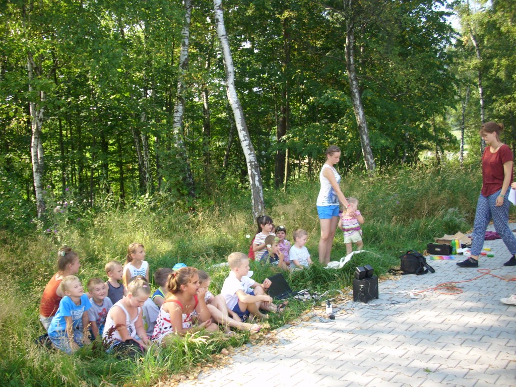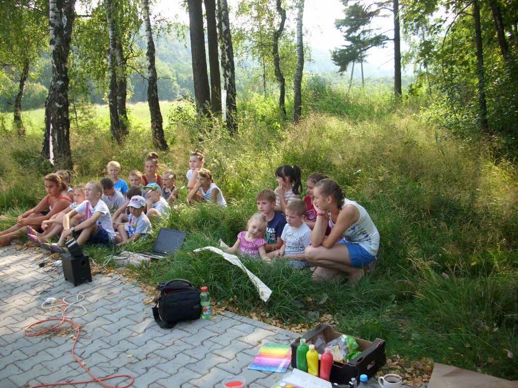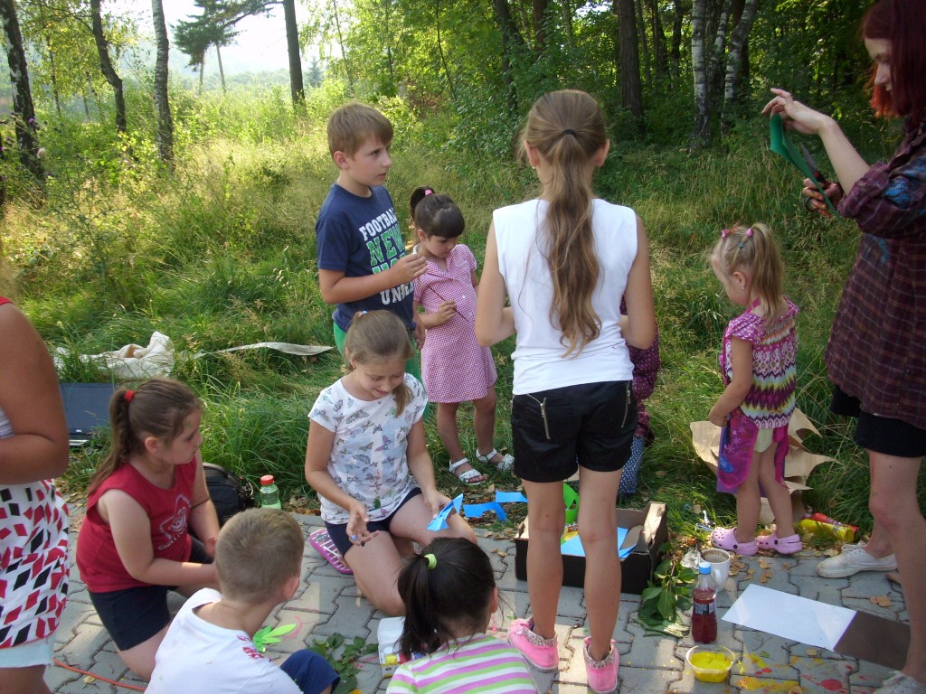 Studentki Marta Węgiel i Aleksandra Schedler przeczytaną bajką wprowadziły dzieci w magiczny świat tajemnic lasu. Po uważnym wysłuchaniu bajki, dzieci miały podzielić się na dwie grupy. Jedna z nich miała za zadanie przenieść na płótno swoją wizję lasu przy użyciu kolorowych farb i z pomocą ,,pędzli’’ zrobionych z traw i patyków znalezionych w lesie. Na płótnie rozwieszonym pomiędzy brzozami powstały obrazy malowane czym się da, także dziecięcymi paluszkami. Natomiast druga grupa przyozdabiała drzewa kolorowymi figurkami wycinanymi z papieru i malowanymi według własnej wyobraźni. Efektem zabawy był las, który nabrał dodatkowych kolorów i jeszcze większej tajemniczości. Wszyscy uczestnicy miło spędzili popołudnie nie zwracając uwagi na uciekający czas, a dzieci dobrze zapamiętały to spotkanie i czekają na następne.