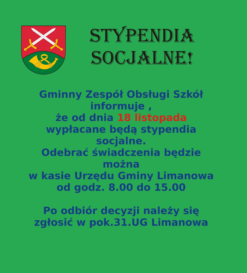 Oficjalny serwisOd środy 18 listopada ruszyła wypłata stypendiów socjalnych dla uczniów. Świadczenia wypłacane są w kasie Urzędu Gminy Limanowa w godz. od 8.00 do 15.00.