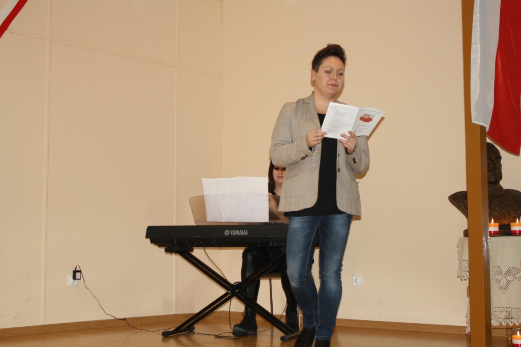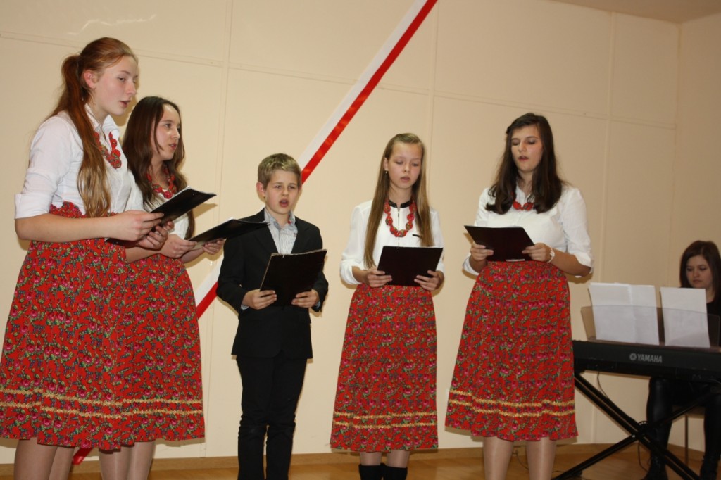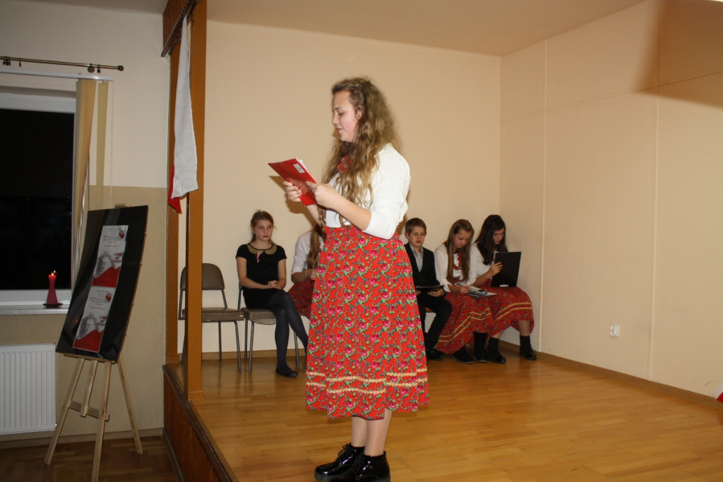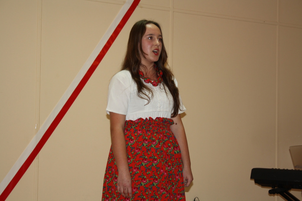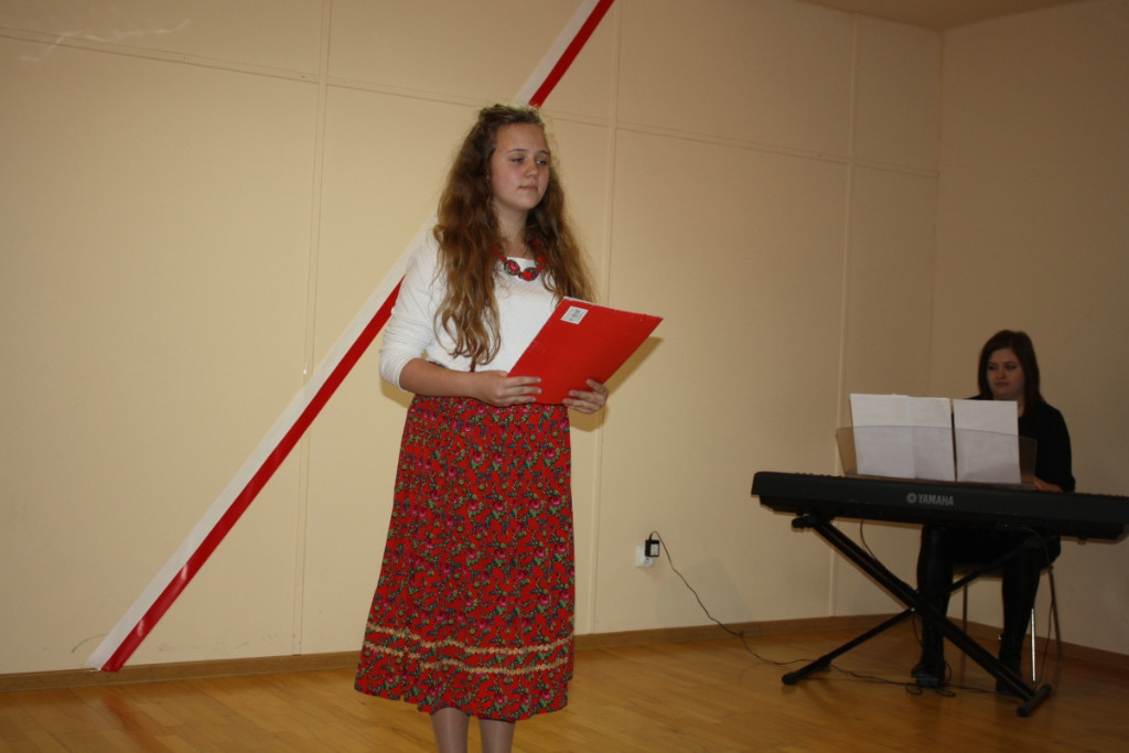 Inscenizacja słowno – muzyczna przygotowana została przez uczniów Szkoły Muzycznej w Trzcianie uczęszczających na zajęcia wokalne w ramach eksperymentu wokalnego pod kierunkiem: Ewy Mazur - pianistki, Magdy Mazur - zajmującej się choreografią, Ilony Szczepańskiej prowadzącej śpiew, na podstawie scenariusza prof. Moniki Rosiewicz. Występ zawierający wersy wojskowych i żołnierskich pieśni był dla uczestników spotkania niezwykłym przeżyciem. Następnie miała miejsce druga cześć Wieczornicy, podczas której uczestnicy otrzymali śpiewniki i pod przewodnictwem Ilony Szczepańskiej wspólnie śpiewali popularne pieśni takie jak: "Wojenko, Wojenko", "Piechota", "Legiony", "O mój rozmarynie", by zakończyć uroczystym "Nie rzucim ziemi skąd nasz ród, Nie damy pogrześć mowy, Polski my naród, polski lud, Królewski szczep Piastowy". Słowa uznania i podziękowania za piękne chwile refleksji i zadumy, które dały możliwość nie tylko wspomnienia, ale i oddania hołdu walczącym za wolność Ojczyzny skierowali w stronę wykonawców Zastępca Wójta Marian Mąka oraz Ks. Proboszcz Kazimierz Basista.