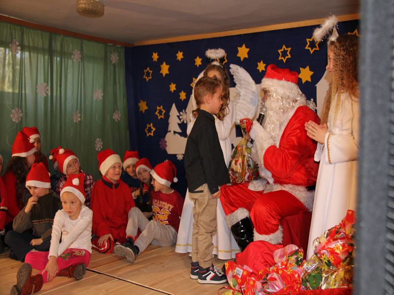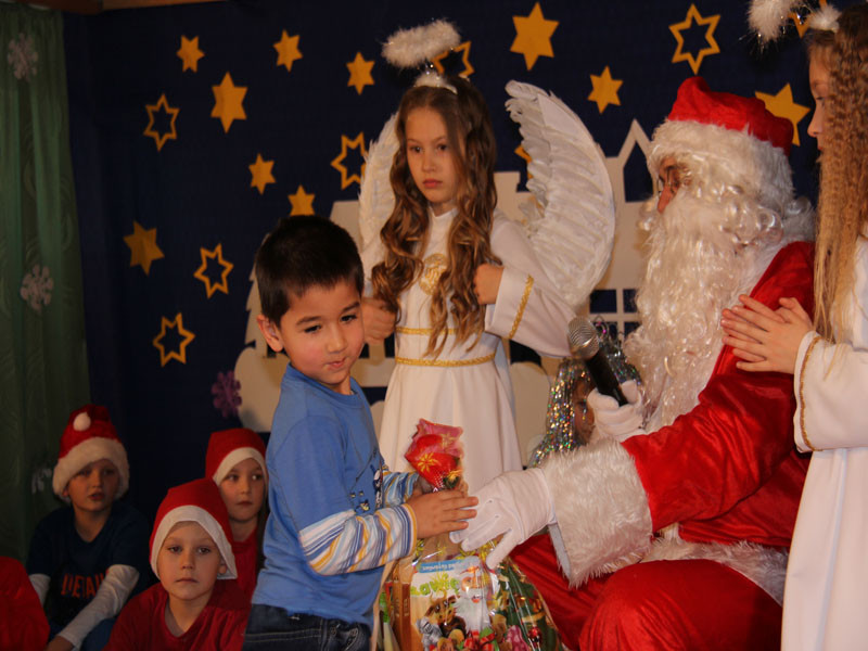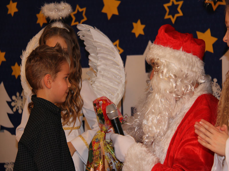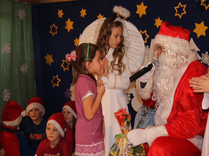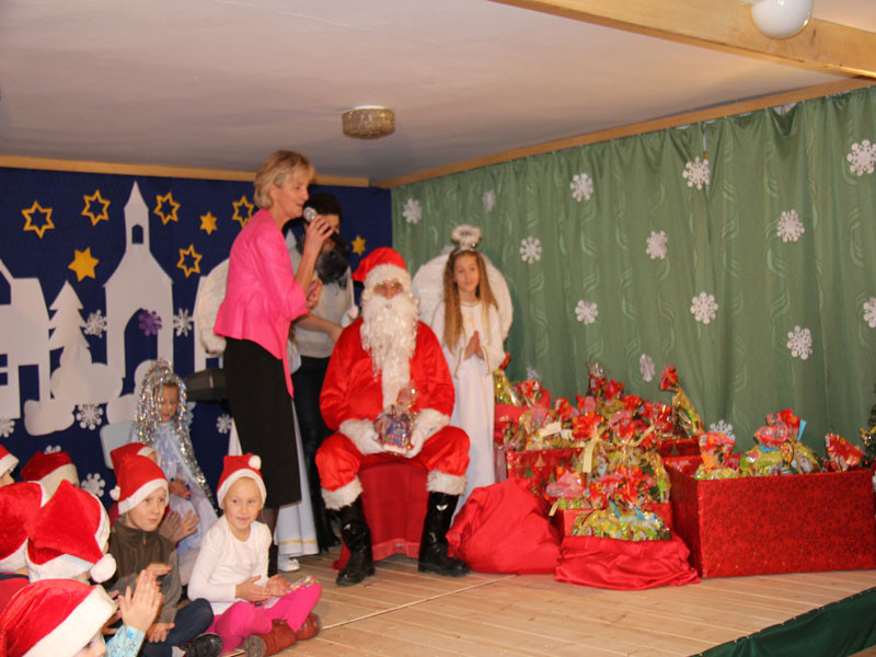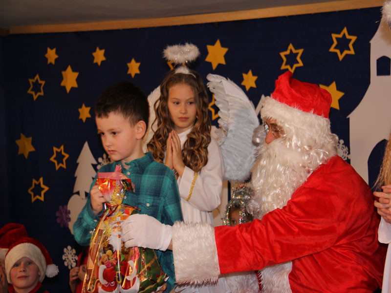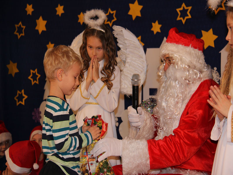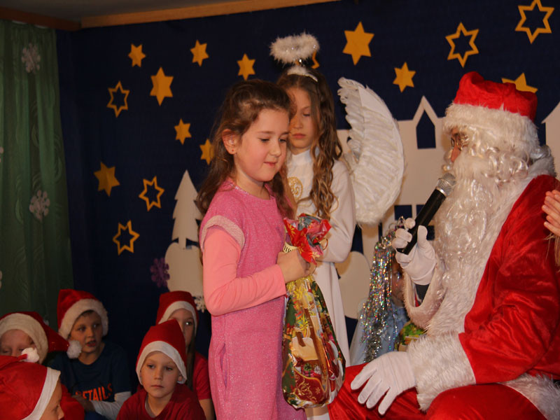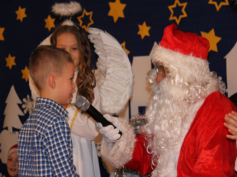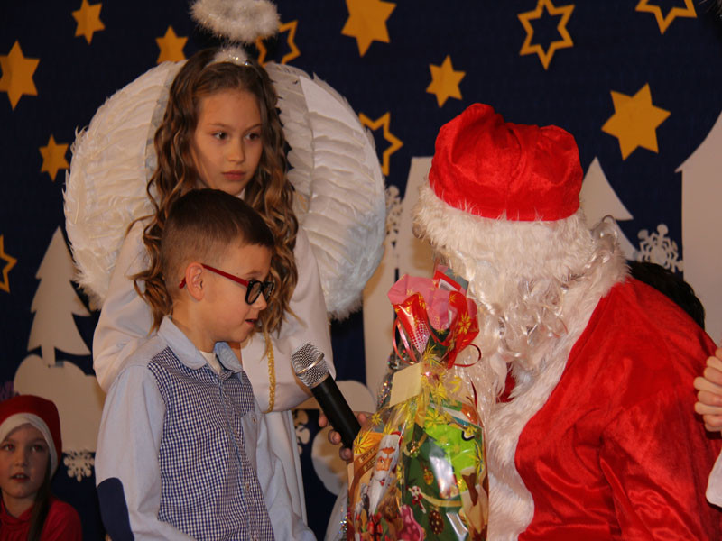 W oczekiwaniu na Mikołaja dzieci z klasy drugiej z wychowawcą Zdzisławą Zoń i Moniką Płachta przygotowały występ artystyczny. Gdy tylko Mikołaj z aniołami wszedł do pięknie udekorowanej sali, na buziach dzieci pojawiło się zaskoczenie, zdziwienie, a przede wszystkim ogromna radość. Wszyscy przywitali Mikołaja ogromnymi brawami. Również dyrektor szkoły Józefa Setlak serdecznie powitała Mikołaja, wszystkie dzieci, zebranych gości, rodziców, przedstawicieli klasowych rad rodziców oraz nauczycieli . Nastąpił najbardziej oczekiwany moment rozdawania prezentów. Każde dziecko otrzymało paczkę, mogło też porozmawiać z Mikołajem oraz zrobić pamiątkowe zdjęcie. Chwile spędzone w szkole wywołały wiele przeżyć i wrażeń nie tylko tym najmniejszym, ale także rodzicom i wychowawcom klas. Wszystkie dzieci zaprosiły Mikołaja na kolejne spotkanie za rok.