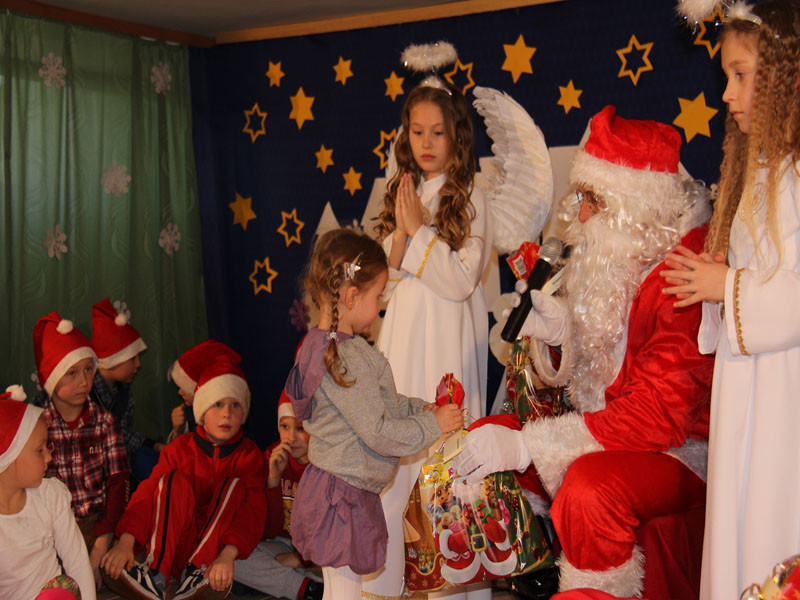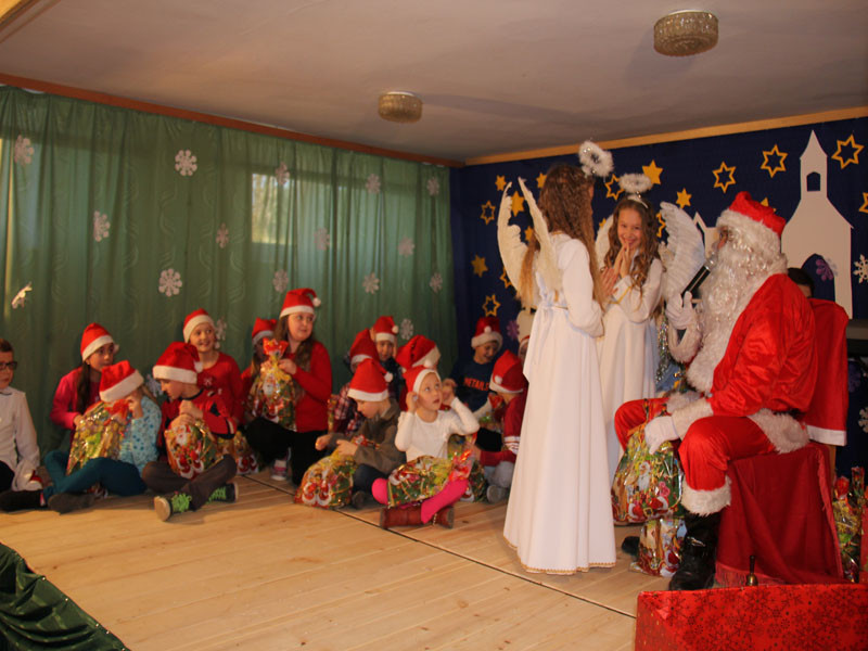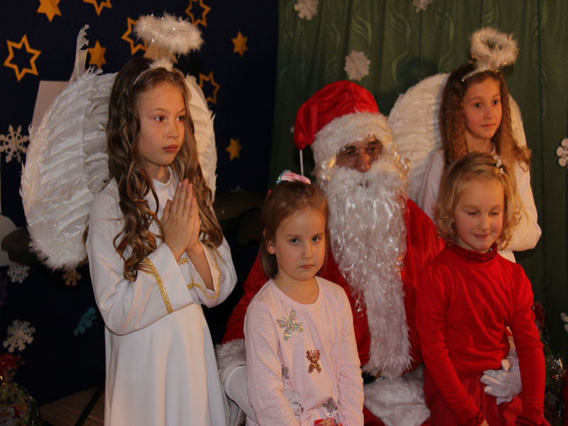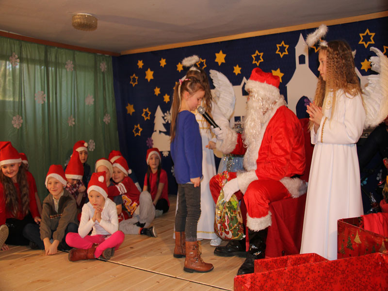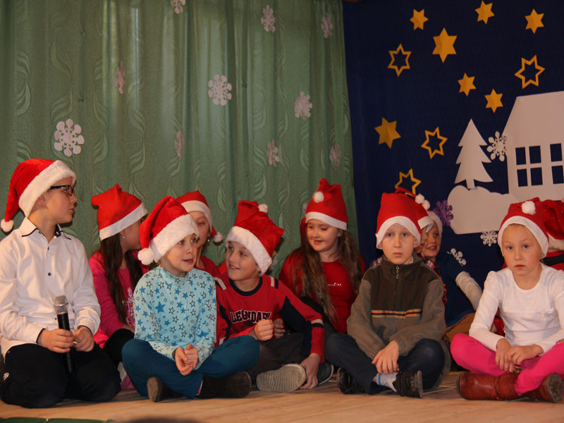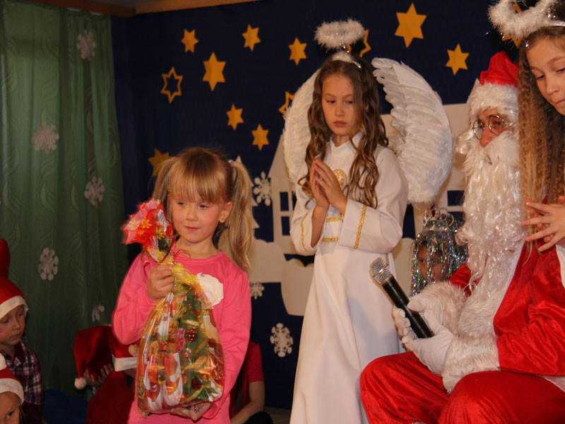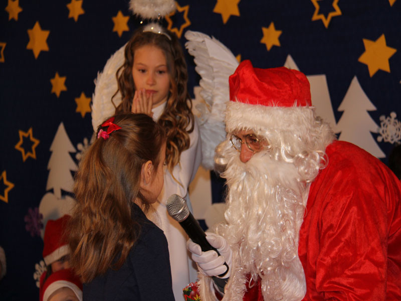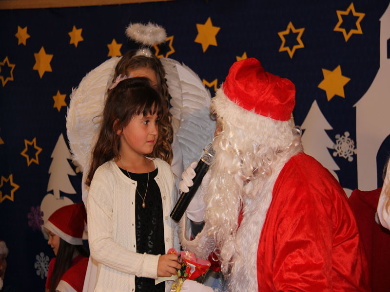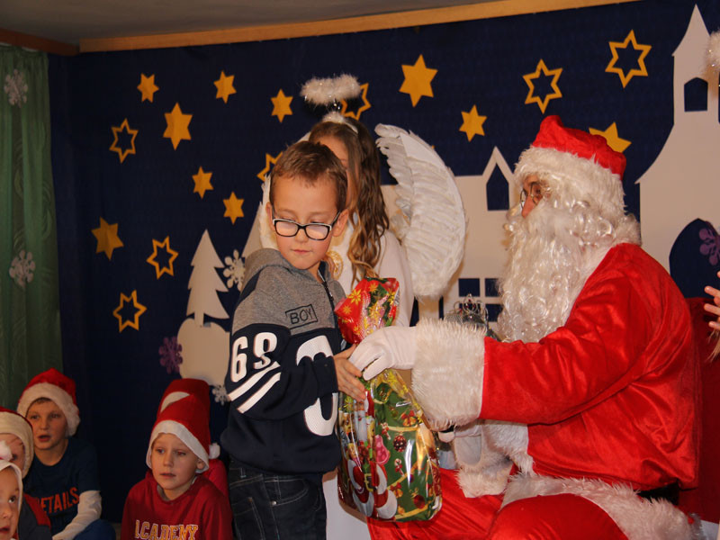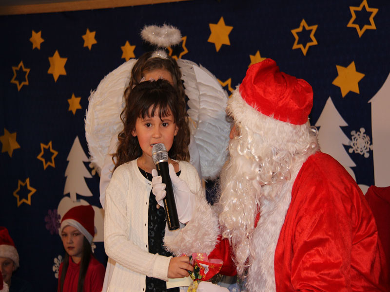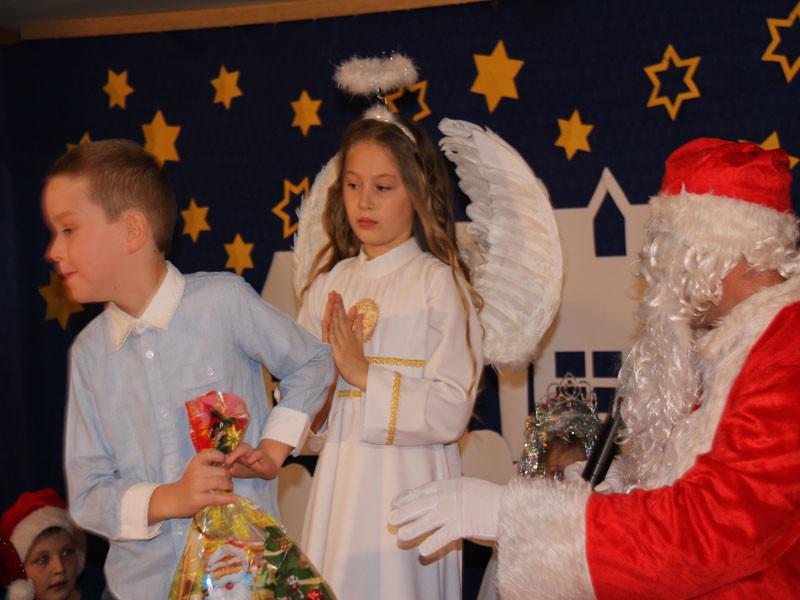 W oczekiwaniu na Mikołaja dzieci z klasy drugiej z wychowawcą Zdzisławą Zoń i Moniką Płachta przygotowały występ artystyczny. Gdy tylko Mikołaj z aniołami wszedł do pięknie udekorowanej sali, na buziach dzieci pojawiło się zaskoczenie, zdziwienie, a przede wszystkim ogromna radość. Wszyscy przywitali Mikołaja ogromnymi brawami. Również dyrektor szkoły Józefa Setlak serdecznie powitała Mikołaja, wszystkie dzieci, zebranych gości, rodziców, przedstawicieli klasowych rad rodziców oraz nauczycieli . Nastąpił najbardziej oczekiwany moment rozdawania prezentów. Każde dziecko otrzymało paczkę, mogło też porozmawiać z Mikołajem oraz zrobić pamiątkowe zdjęcie. Chwile spędzone w szkole wywołały wiele przeżyć i wrażeń nie tylko tym najmniejszym, ale także rodzicom i wychowawcom klas. Wszystkie dzieci zaprosiły Mikołaja na kolejne spotkanie za rok.