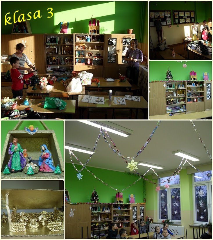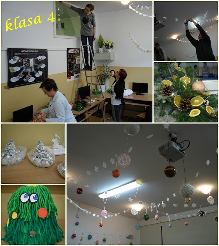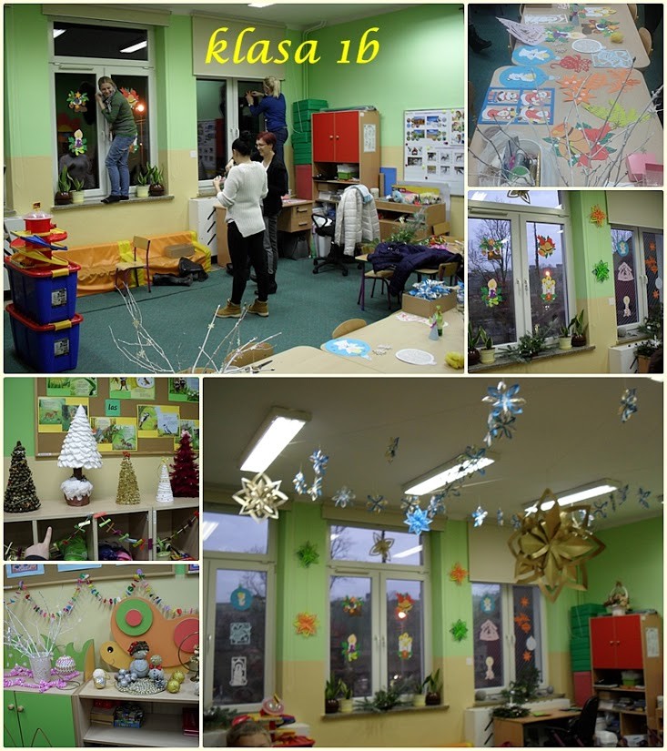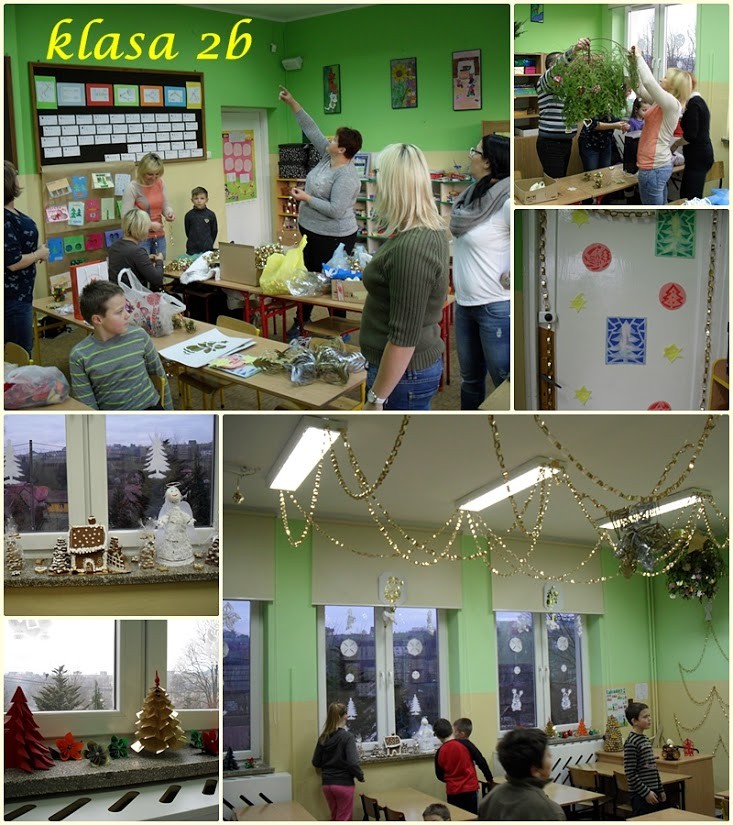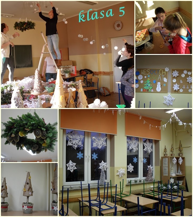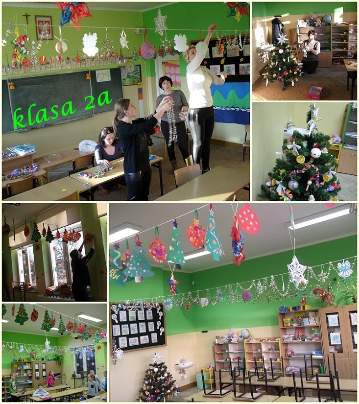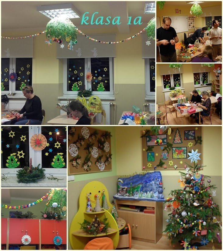 15 grudnia do szkoły przybyli rodzice uczniów klas 1-6 zaopatrzeni … w choinki, wieńce, girlandy, pierniki, stroiki, szopki, kolorowe łańcuchy i wiele innych fikuśnych dekoracji. Z pomocą dzieci i pań wychowawczyń przez kilka godzin twórczo i wesoło pracowali. Następnego dnia wszyscy nie mogli się nadziwić świątecznym klimatom, które udało im się wyczarować. Na dodatek w każdej sali zupełnie inny i niezwykle oryginalny.