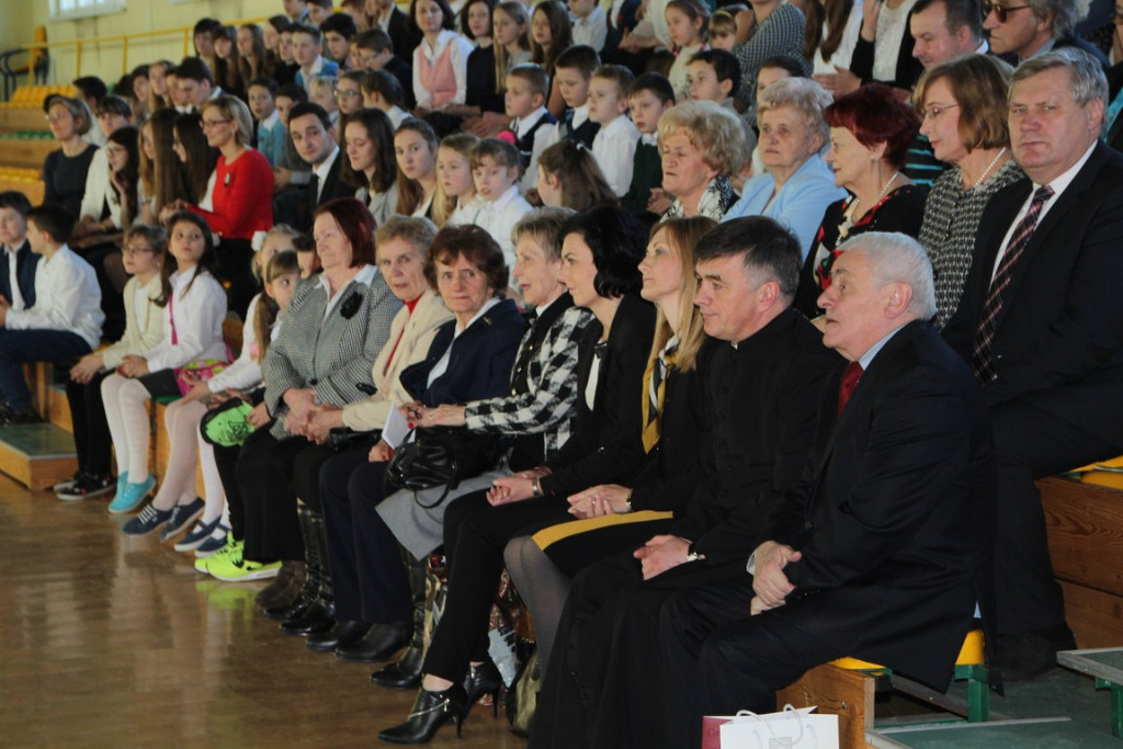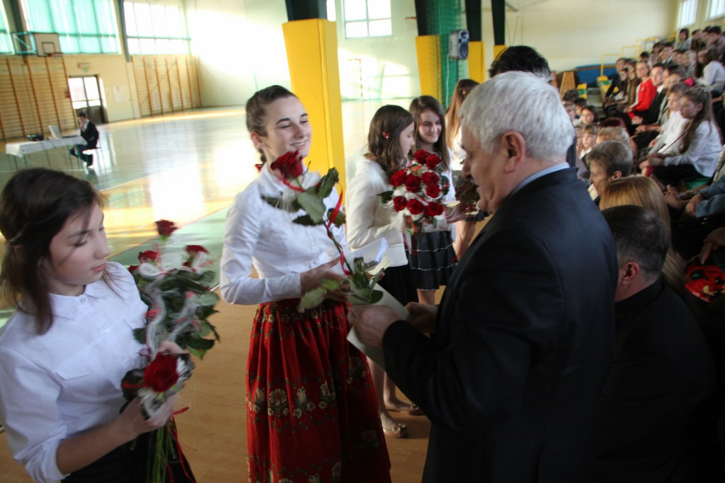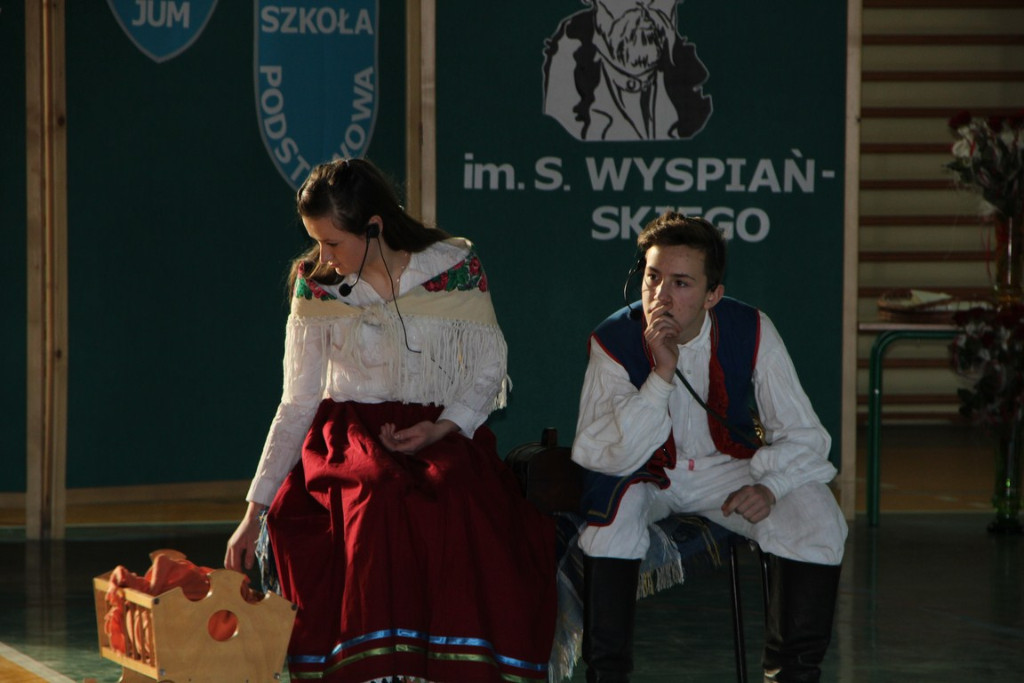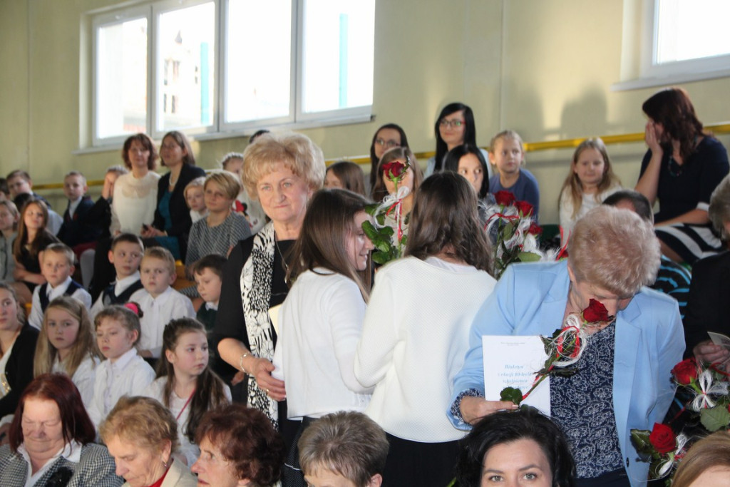 Uroczystość rozpoczął dyrektor Zespołu Szkół im. Stanisława Wyspiańskiego Paweł Ciuła. Przywitał zaproszonych gości, podkreślił znaczenie szkoły w społeczności lokalnej, zaangażowanie wszystkich, którym na sercu leżało jej dobro. Przypomniał nazwiska pierwszych nauczycieli, kierowników, dyrektorów, działaczy społecznych, katechetów. Wyraził ogromną wdzięczność osobom, dzięki którym nasza szkoła nigdy nie była jedynie miejscem czy instytucją, ale zawsze zwartą społecznością stworzoną przez pokolenia uczniów i ich rodziców, nauczycieli, którzy oddali szkole swoje umiejętności, entuzjazm i serce. Wokół szkoły zawsze gromadziły się osoby twórcze, kreatywne, poszukujące najlepszych rozwiązań oraz otwarte i wrażliwe na potrzeby dzieci. Dzięki ich entuzjazmowi i zaangażowaniu udało się stworzyć szkołę taką, jaką widzimy ją dzisiaj – przyjazną, kolorową i otwartą na nowe.