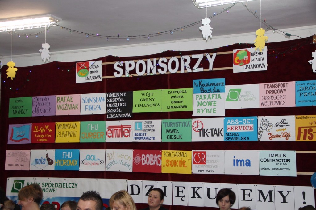 Jak już wcześniej było wspomniane, niebagatelną rolę w organizacji tej imprezy odegrali sponsorzy – ludzie, którym nie są obojętne dzieci skrzywdzone przez los. To dzięki nim wszyscy uczestnicy zabawy mogli otrzymać swoje wymarzone prezenty. Sponsorami, dzięki którym sprawiono dzieciom tyle radości byli: Urząd Gminy Limanowa, Urząd Miasta Limanowa, Władysław Pazdan – Wójt Gminy Limanowa, Marian Mąka – Zastępca Wójta Gminy Limanowa, Edyta Król – Dyrektor Gminnego Zespołu Obsługi Szkół w Limanowej, ksiądz Kazimierz Basista - Parafia Nowe Rybie, Rafał Woźniak - Kierownik Wydziału Gospodarki Komunalnej, Mieszkaniowej i Komunikacji, Stanisław Piegza – Kierownik Wydziału Inwestycji i Zamówień Publicznych, Bogusław Sukiennik – właściciel Firmy Tik – Tak, Metsa Tissue Producent Papieru Lambi i Mola, Bank Spółdzielczy w Limanowej, Ośrodek Szkolenia Kierowców - Robert Piwowarczyk, Władysław Sułkowski, Renata i Grzegorz Wójtowicz – firma Transport Drogowy, Firma Balshen, Renata i Stanisław Młyńscy, Firma ABS Jet-Service - Maria Sewielska, Jerzy Uryga - Firma Handlowo – Usługowa Jurger, Mirosław Bubula - Księgarnia „Nowa”, Krzysztof Iwan - Biuro Usług Finansowo – Księgowych Fis – Kuz, Bogdan Rusin – właściciel firmy „Interline”, Biuro Projektowe „Drog – Projekt” Przemysław Kita, Firma Emiter, Dorota i Jacenty Musiałowie, Janina Wójcik - Salon Fryzjerski „Image” w Limanowej, Paweł Cieślik - Firma Przewozowa „Turystyka”, Beata Ryś - Firma Handlowo – Usługowa Hydromix, Przedsiębiorstwo Handlowo – Produkcyjno – Usługowe IMA, Księgarnia „Sokół”, Sklep Wielobranżowy „Bobas”, Firma „Partner – Alma” Stach, Król sp.j., ks. Dariusz Bugajski, Bogumiła Lach – Gabinet Odnowy Biologicznej z Elementami Rehabilitacji, Impuls Contractor Spółka z o.o. Spółka Komandytowa oraz darczyńcy anonimowi. Wykwalifikowaną opiekę medyczną sponsorował Piotr Wyrwa - właściciel Centrum Szkoleń Ratowniczych w Limanowej. Dziękujemy wszystkim w imieniu swoim, rodziców, opiekunów i dzieci.