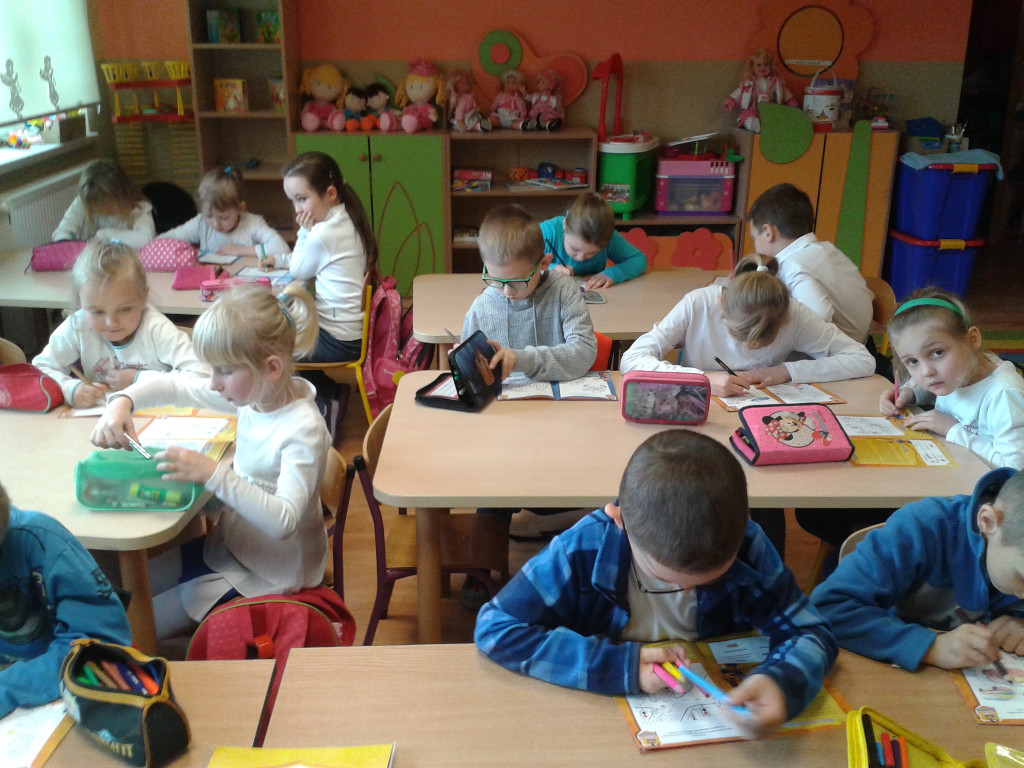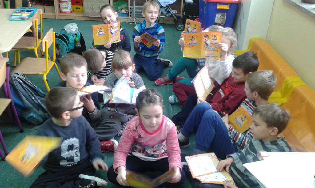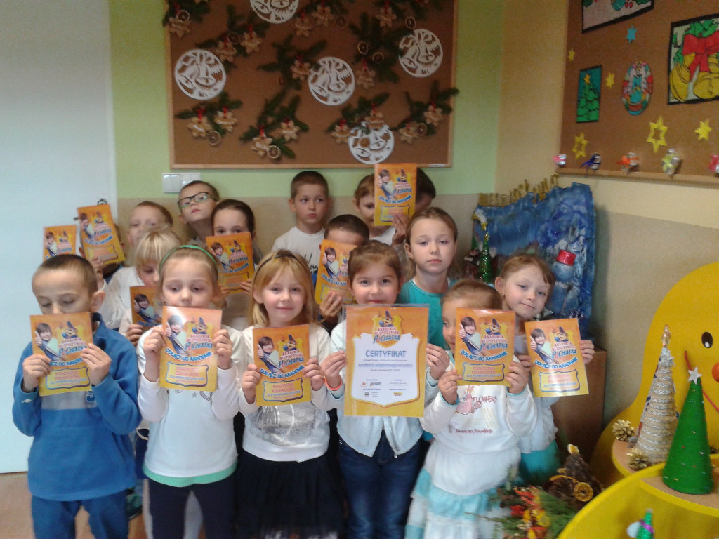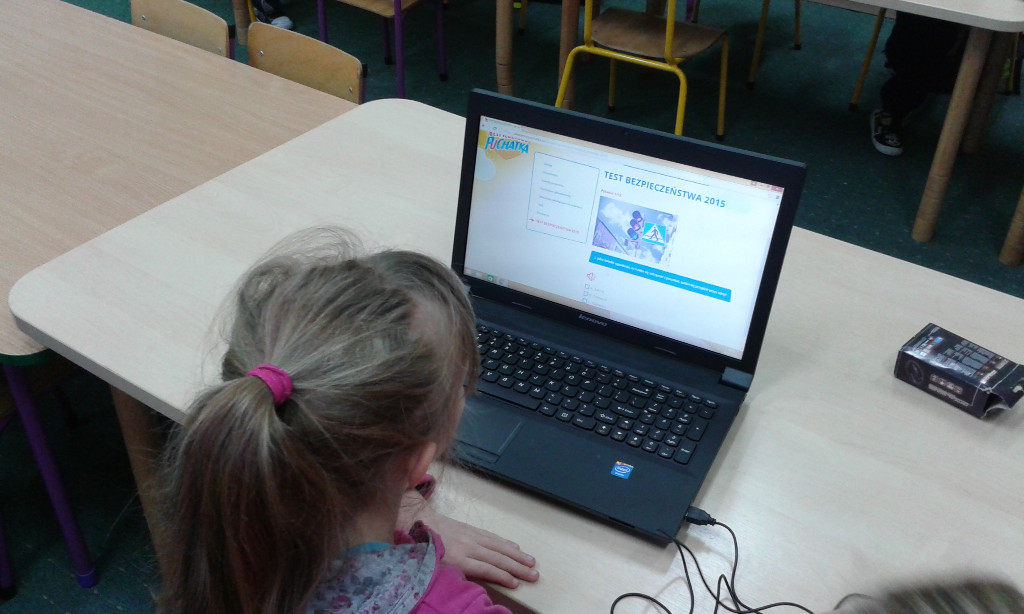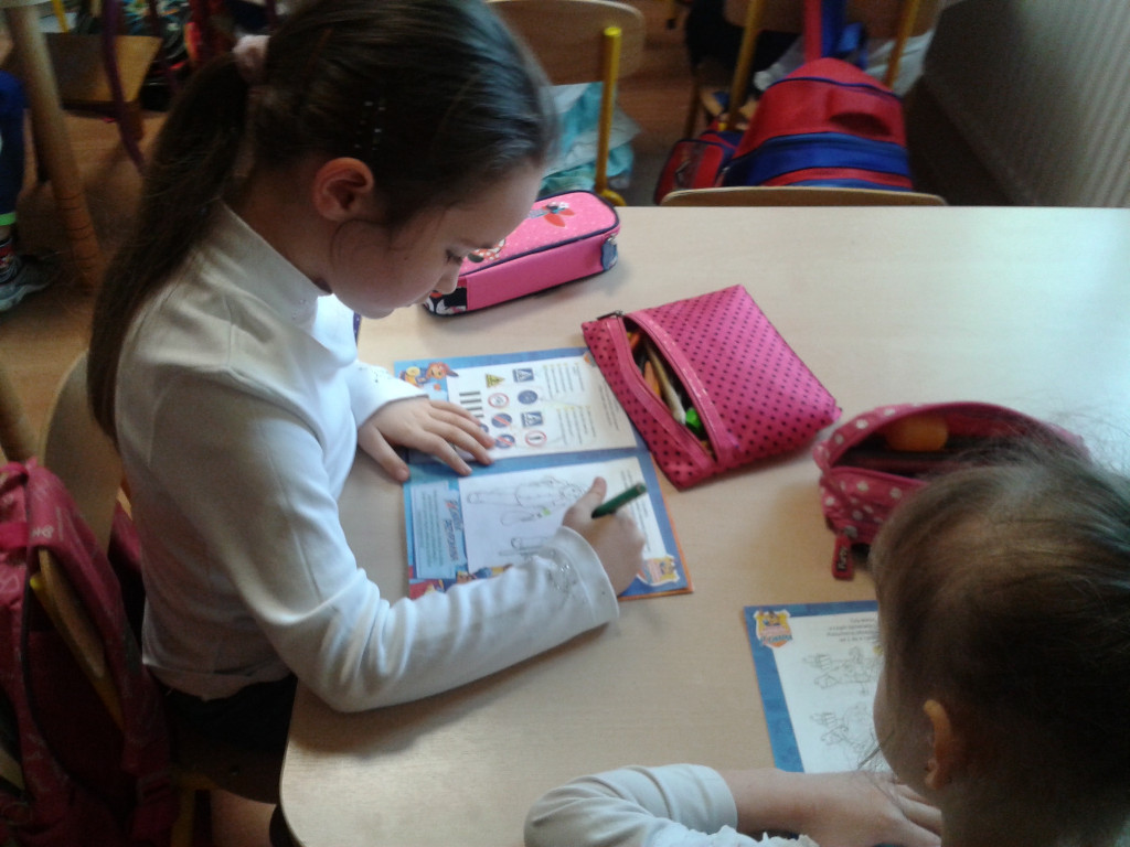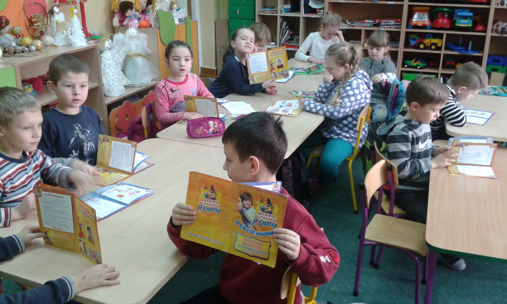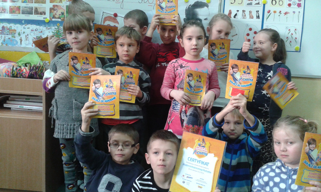 Pierwszoklasiści na zajęciach przypominali sobie znane im już zasady bezpiecznego poruszania się po drogach. Zdobywali wiedzę, jak bezpiecznie spędzać czas w domu, w szkole i w czasie zabawy oraz jak unikać zagrożeń. Razem z wychowawczyniami Danutą Gucwą i Krystyną Tobiasz, oraz w domu z rodzicami dzieci wykonywały zadania w książeczce, utrwalając w ten sposób zdobyte już wiadomości. W dniach od 15 do 21 grudnia 2015 roku pierwszoklasiści rozwiązywali Ogólnopolski Test Bezpieczeństwa.
