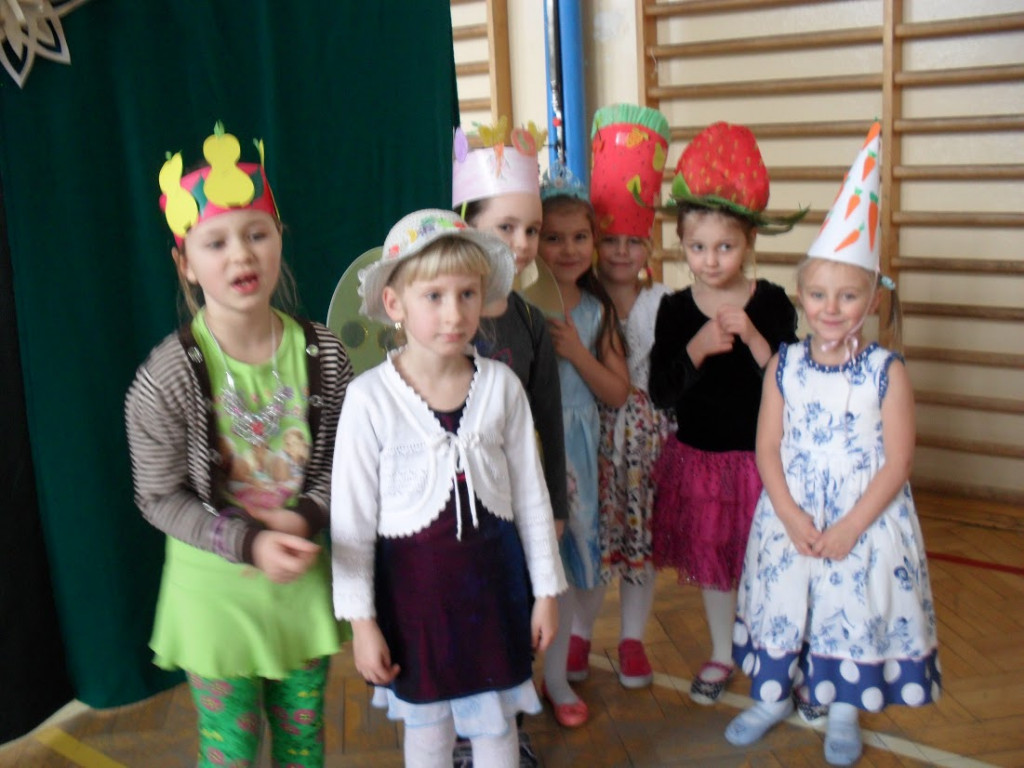 Uzupełnieniem wielu barwnych strojów były czapki, opaski, kapelusze z motywami owoców i warzyw.