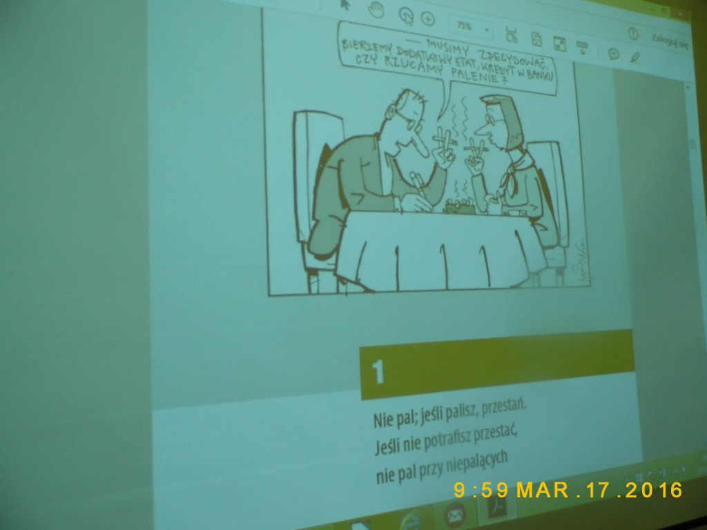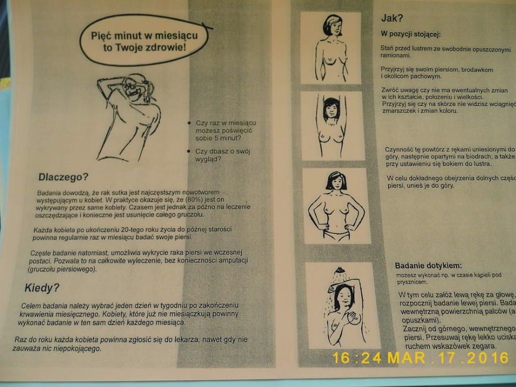 Na lekcjach biologii oraz podczas spotkania wywiadowczego dla rodziców została przeprowadzona prelekcja nt. „Profilaktyki nowotworowej raka piersi”. Prelekcję dla rodziców prowadził lekarz Artur Kalita: chirurg- onkolog- specjalista ze Szpitala Powiatowego w Limanowej. Doktor uświadomił, zebranym jak ważne jest samobadanie piersi i badania profilaktyczne ponieważ pozwalają wykryć w bardzo wczesnym stadium raka piersi. Ponadto przy wejściu do szkoły w dniu wywiadówki, uczennice rozdawały ulotki dotyczące samobadania piersi oraz zaprojektowane przez siebie mini-plakaty.
