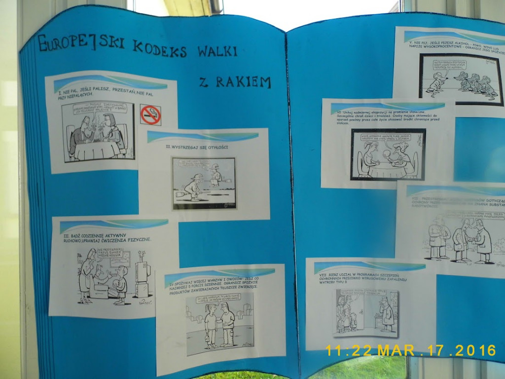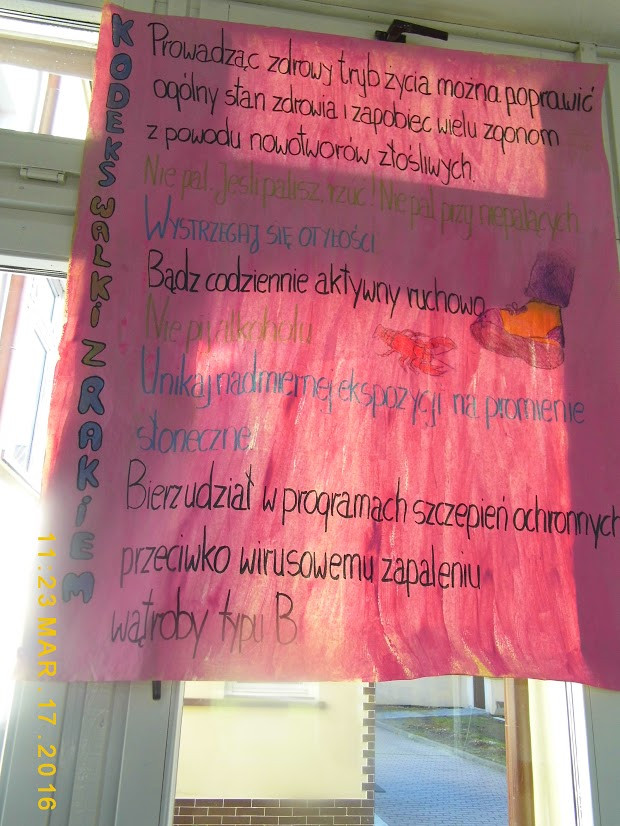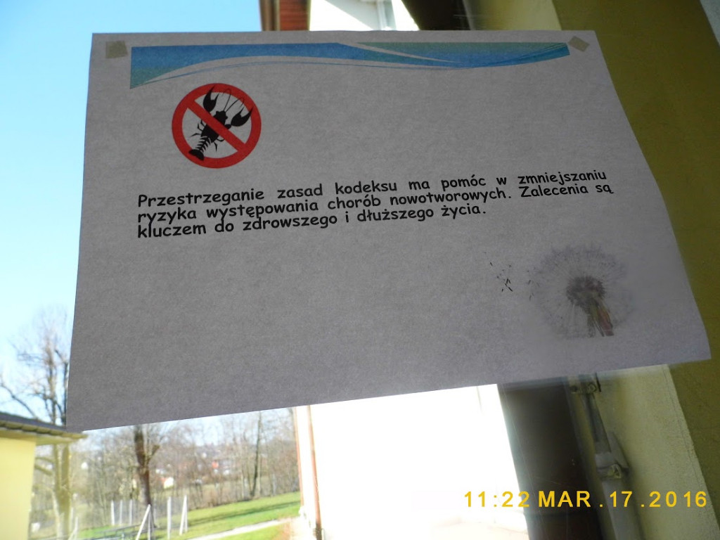 Oficjalny serwisDnia 17 marca 2016 r. w Zespole Szkół w Pisarzowej został zorganizowany Dzień dla Zdrowia w ramach realizacji projektu „Szkoła promująca zalecenia Europejskiego Kodeksu Walki z Rakiem”. W tym dniu na korytarzach szkolnych zawisły gazetki na temat zdrowego stylu życia oraz zaleceń wynikających z Europejskiego Kodeksu Walki z Rakiem.