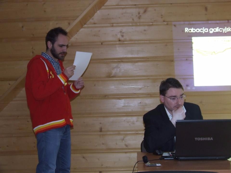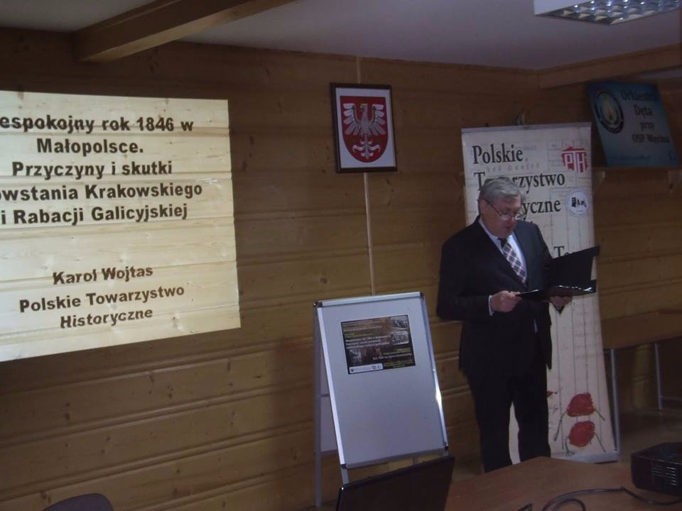 W jednej z relacji czytamy: „Zima w tym roku (1845/46) była bardzo niestała. Ten rok był jednym z najnieszczęśliwszych tego wieku, gdzie od czasów Gonty i Żeleźniaka na Ukrainie i Podolu, podobnych okrucieństw i mordów nie było…”. Rzeź galicyjska rozpoczęła się w nocy z 18 na 19 lutego1846 roku. Zbrojne gromady chłopów zrabowały i zniszczyły w ciągu kilku dni ponad 500 dworów w cyrkułach: tarnowskim, bocheńskim, sądeckim, wielickim, jasielskim. Zamordowano blisko trzy tysiące osób, głównie ziemian, urzędników dworskich oraz przedstawicieli duchowieństwa. Przez cały wiek XIX docierały tutaj echa powstań narodowych, brali w nich udział ochotnicy z Ziemi Limanowskiej, jednak bezpośrednich walk na terenie Limanowszczyzny nie było. Rzeź galicyjska natomiast dotyczyła szczególnie naszego rejonu, bo właśnie tutaj rozegrały się tragiczne wydarzenia. Tutaj mieszkańcy Limanowej bronili miasta przed uzbrojonymi bandami chłopskimi. W czasie wykładu wspomnienia uczestników tamtych dramatycznych wydarzeń deklamował Jan Wilk z Limanowej, czym dodatkowo wzmacniał niezwykły przekaz naszych przodków sprzed 170-lat.