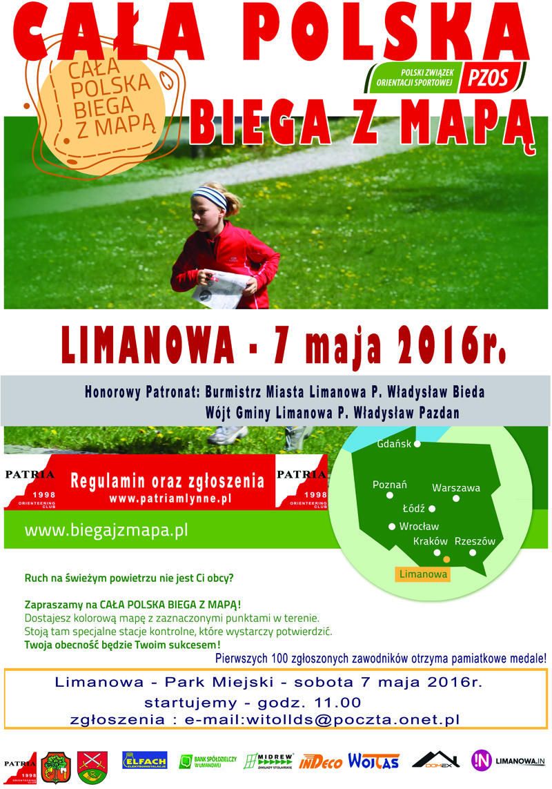 Oficjalny serwisUczniowski Klub Sportowy „Patria” Młynne po raz kolejny jest organizatorem akcji „CAŁA POLSKA BIEGA Z MAPĄ”. W tym roku bieg z mapą odbędzie się w sobotę 7 maja w Parku Miejskim w Limanowej, a dla uczestników przygotowano 10 tras biegowych.