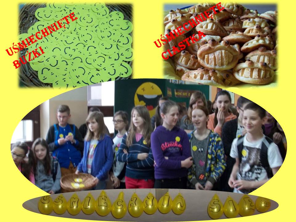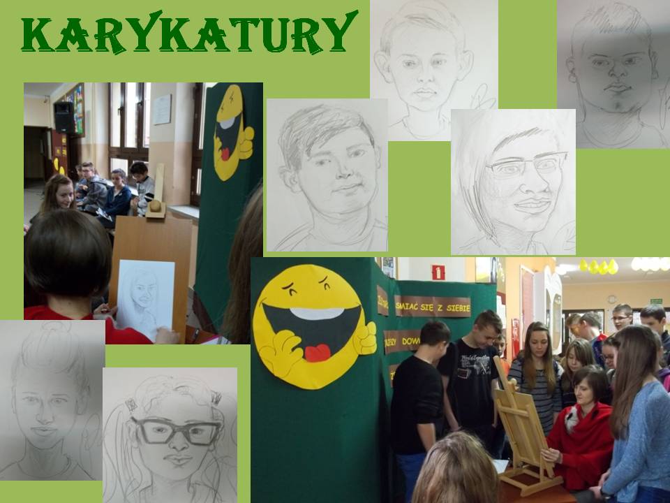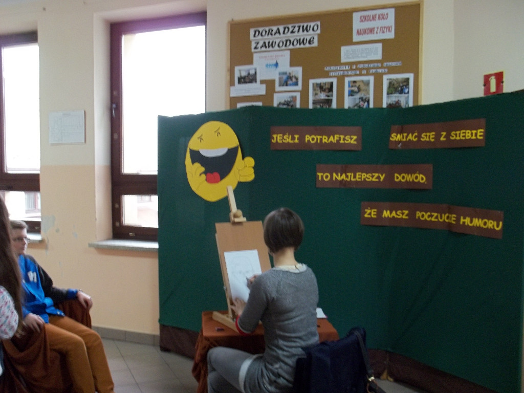 Przedstawiciele Samorządu Uczniowskiego od rana obdarowywali uczniów plakietkami z żółtą buźką oraz częstowali uśmiechniętym ciastkiem. Przygotowali  też ścianę śmiechu – miejsce, w którym pojawiły się nie tylko informacje o wpływie śmiechu na zdrowie, ale również  dowcipy i  humorystyczne  rysunki.  Z kolei podczas przerw można było korzystać z wielu zabawnych atrakcji. Przeprowadzono  konkurs na  niekwaśne miny  po zjedzeniu cytryny. Zgromadzono zwariowane gadżety, dzięki którym uczniowie mogli  wcielać się w przeróżne postacie, kreować zabawny image i wykonywać sobie zdjęcia w fotobudce.  W dobry nastrój wprowadził również uczniów szkolny program Stand Up – Zabij mnie śmiechem, czyli występ w którym zadaniem uczestnika było rozbawienie szkolnej publiczności swoim monologiem kabaretowym. Jednak największą atrakcją tego dnia okazała się możliwość wykonania sobie portretu -karykatury z zachowaniem cech charakterystycznych, ale jednak trochę w zmienionej formie, bo napełnionej dobrym humorem bez złośliwej satyry. Prace wykonywał gość specjalny, absolwentka naszej szkoły, uzdolniona malarka i rzeźbiarka Jolanta Biedroń.