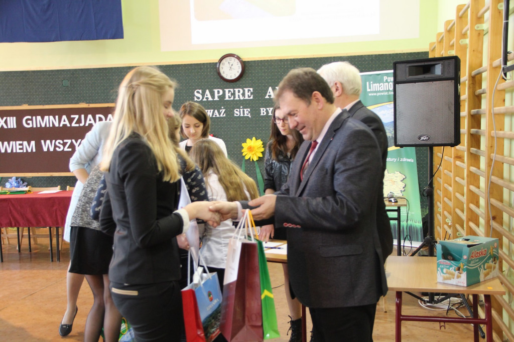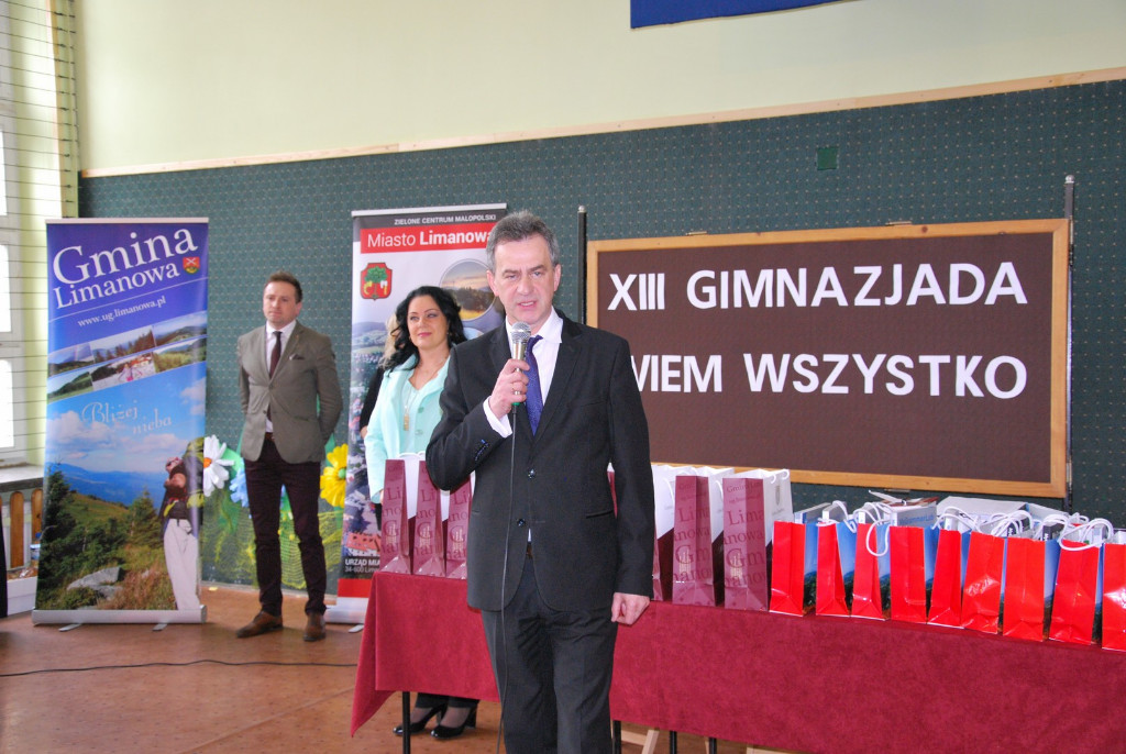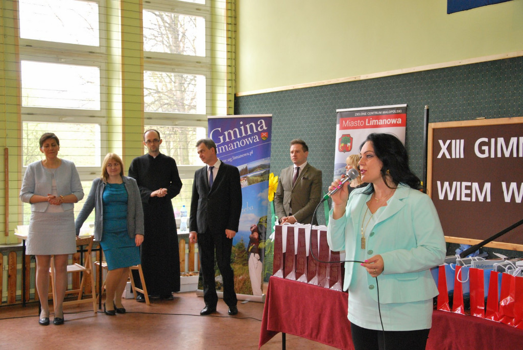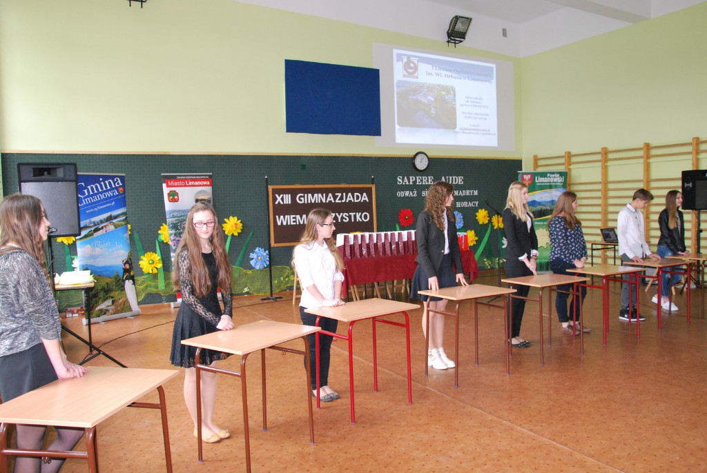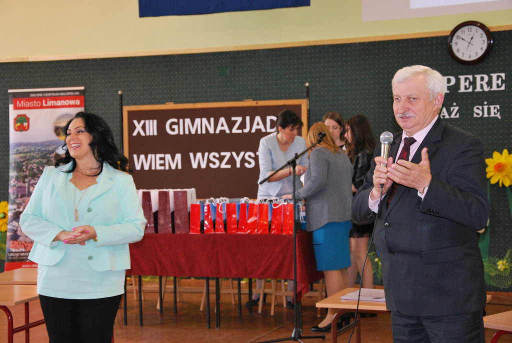 Oficjalny serwisDnia 14 kwietnia br. w I Liceum Ogólnokształcącym im. Władysława Orkana w Limanowej odbyła się już po raz trzynasty Powiatowa Gimnazjada „Wiem wszystko”. Jak co roku wśród licznego grona uczestników znaleźli się także uczniowie gimnazjów z naszej gminy. Zakres tematyczny Gimnazjady obejmował wiadomości i umiejętności znajdujące się w programie nauczania poszczególnych przedmiotów w gimnazjum.