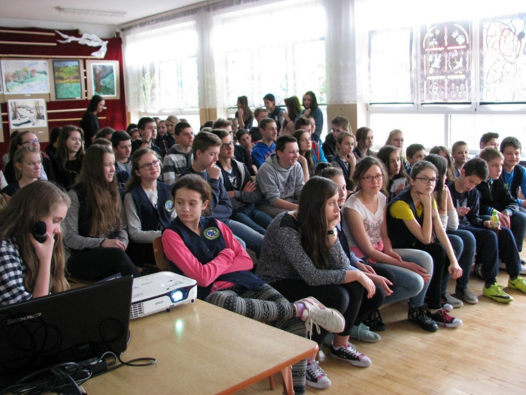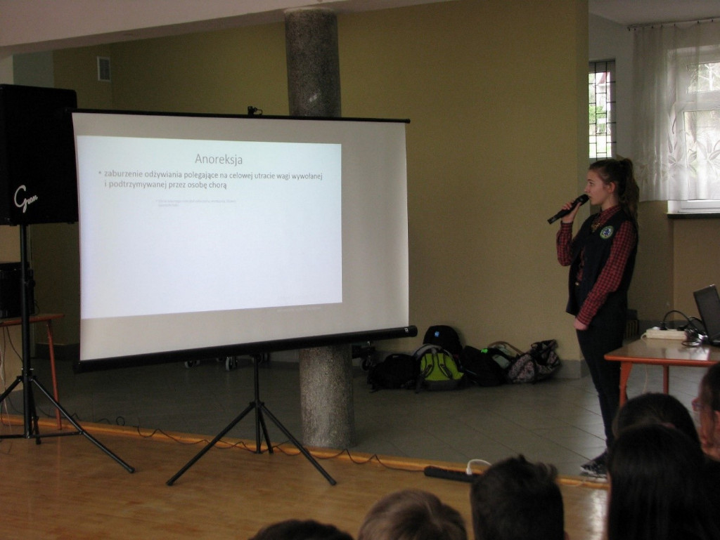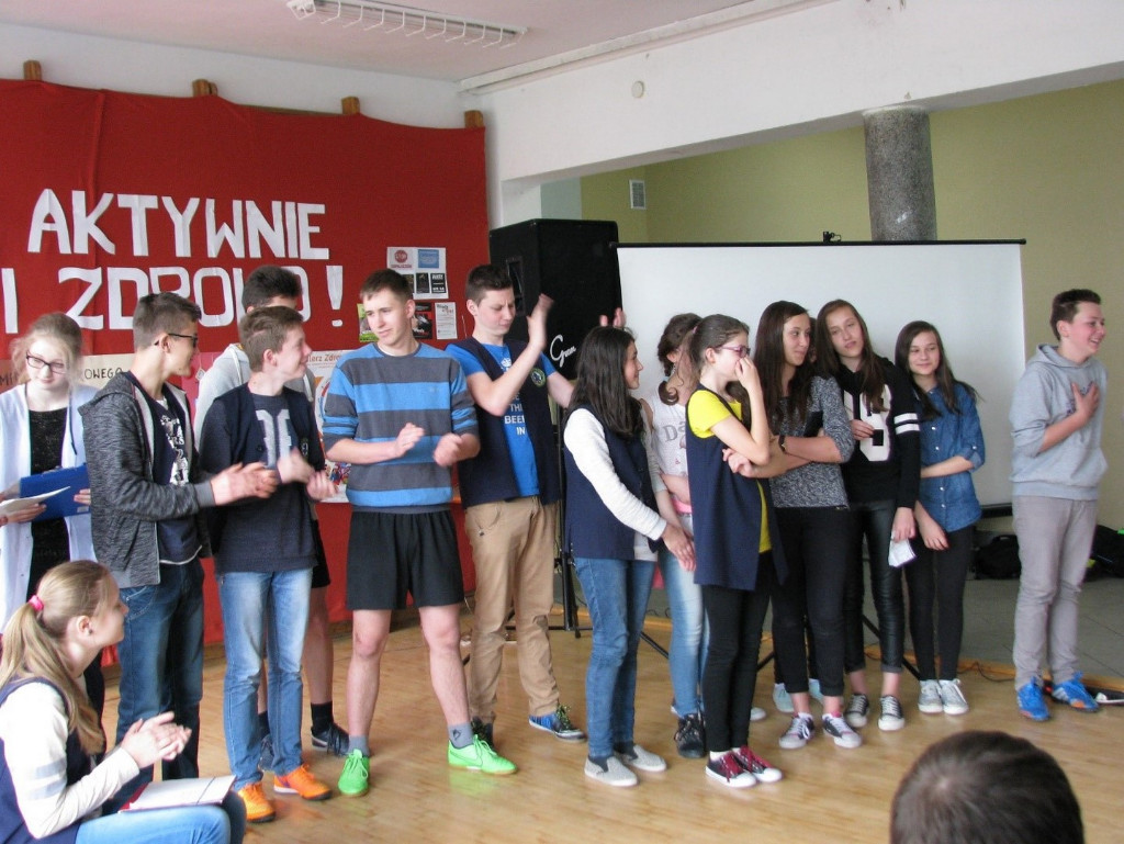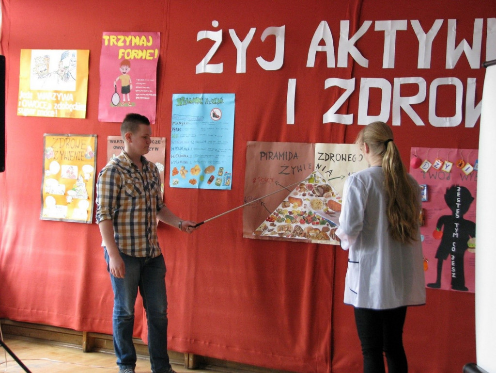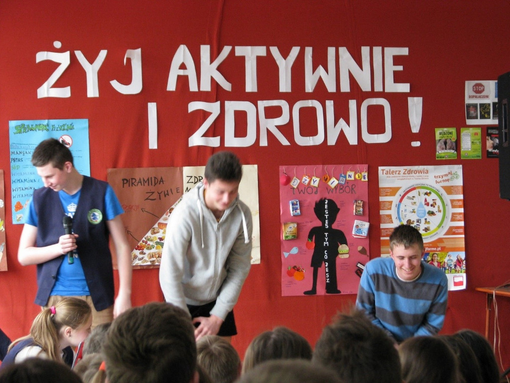 W dniu 15 kwietnia br. odbył się apel przygotowany przez liderów z klas II a i b gimnazjum, którzy w ciekawy sposób przedstawili rówieśnikom problemy związane z niewłaściwym odżywianiem i sposoby na aktywne spędzanie wolnego czasu. Poruszona została problematyka higienicznego stylu życia i przedstawiona Piramida Zdrowego Odżywiania. Ponadto realizowane były zajęcia warsztatowe przeprowadzane na lekcjach wychowawczych z zakresu: zachowań asertywnych, radzenia sobie z problemami oraz uświadamiania mechanizmów konfliktu i umacniania poczucia własnej wartości w zbudowaniu pozytywnego myślenia.