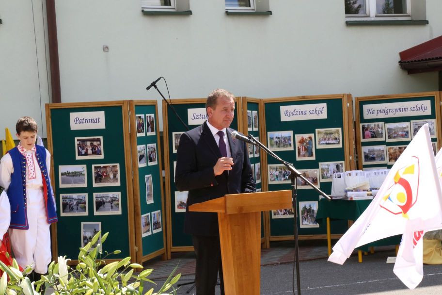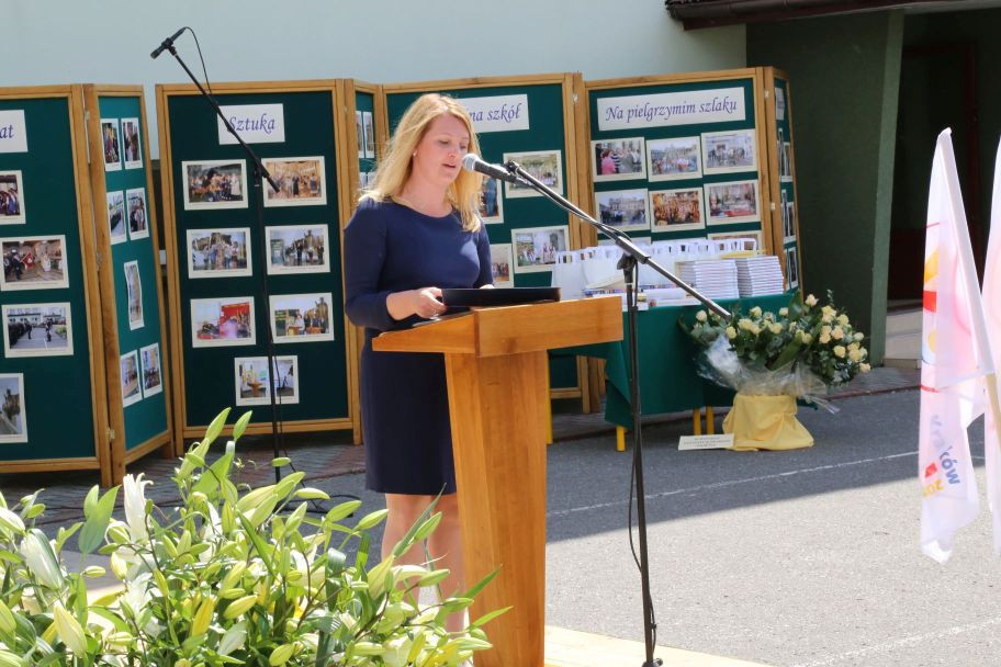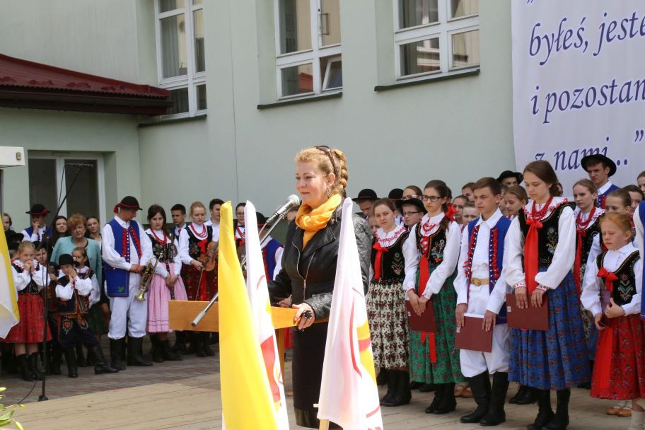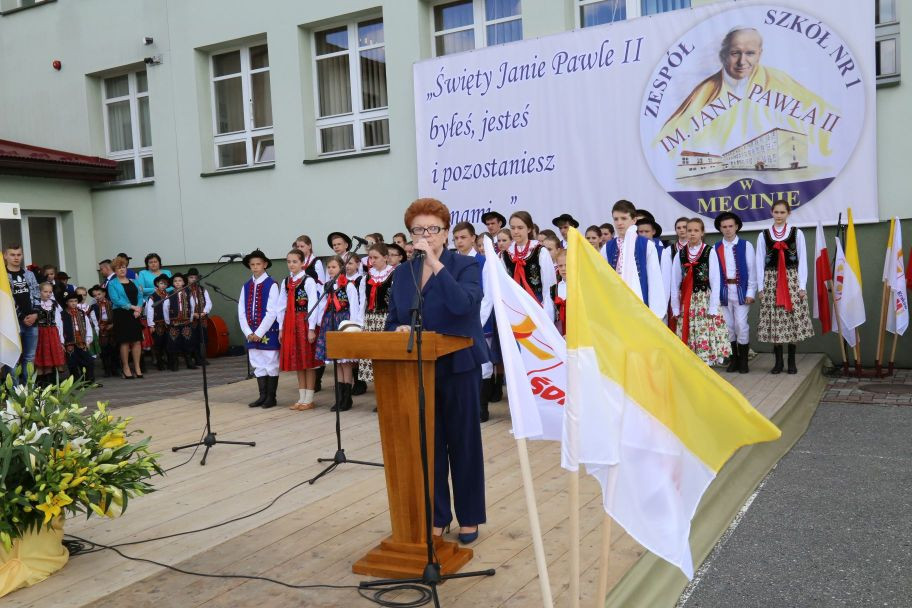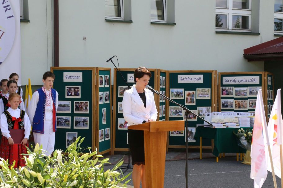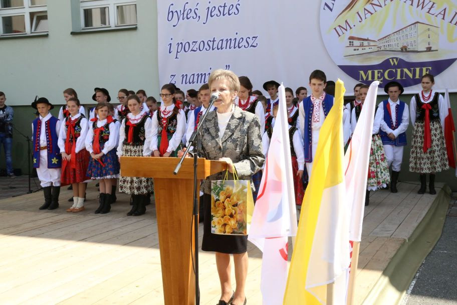 Pani dyrektor w swoim przemówieniu przypomniała, jak zrodziła się idea nadania szkole imienia Jana Pawła II. Jednocześnie wyraziła wdzięczność tym, którzy wspierali tę szlachetną inicjatywę. W swoim wystąpieniu dokonała także podsumowania pracy dydaktyczno – wychowawczej szkoły w ciągu minionych dziesięciu lat, ze szczególnym uwzględnieniem udziału naszych uczniów w konkursach, projektach, wycieczkach, zlotach oraz rajdach poświęconych patronowi.