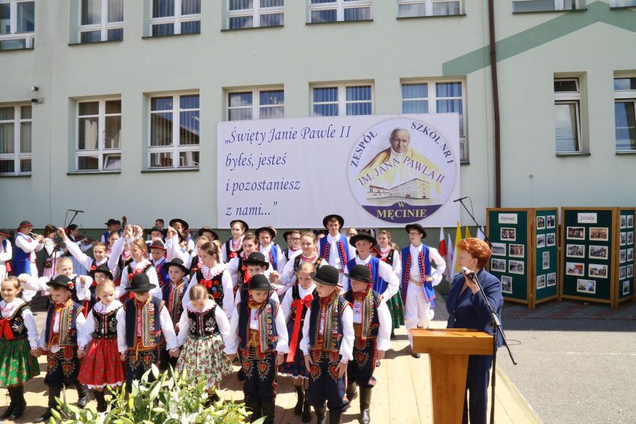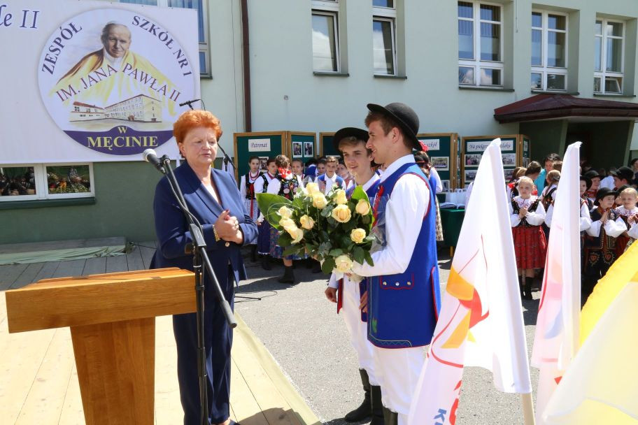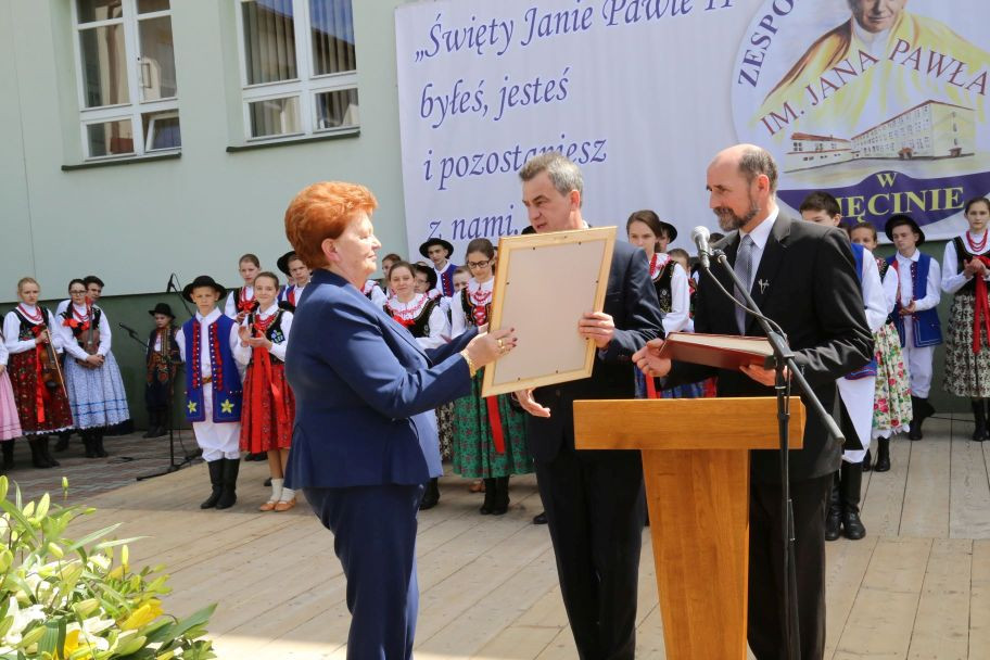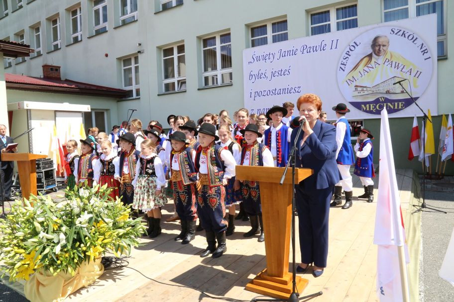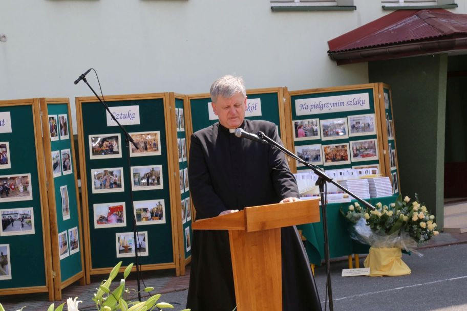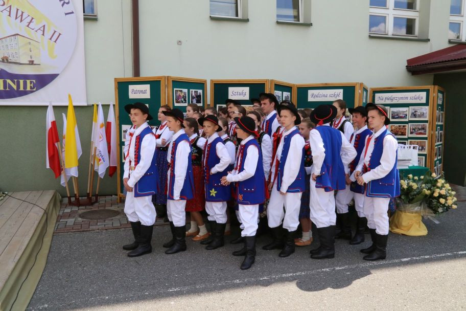 Pani dyrektor w swoim przemówieniu przypomniała, jak zrodziła się idea nadania szkole imienia Jana Pawła II. Jednocześnie wyraziła wdzięczność tym, którzy wspierali tę szlachetną inicjatywę. W swoim wystąpieniu dokonała także podsumowania pracy dydaktyczno – wychowawczej szkoły w ciągu minionych dziesięciu lat, ze szczególnym uwzględnieniem udziału naszych uczniów w konkursach, projektach, wycieczkach, zlotach oraz rajdach poświęconych patronowi.
