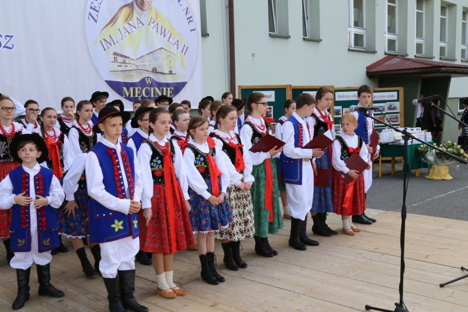 Obchody jubileuszowe zainaugurowane zostały Mszą Świętą w kościele parafialnym pw. św. Antoniego z Padwy. Nabożeństwo celebrowane było przez ks. prałata Antoniego Bielaka w asyście proboszczów i wikiariuszy pracujących obecnie i w ostatnich latach w Męcinie oraz kapłanów rodaków. Mszę św. uświetnił swoim śpiewem Zespół Regionalny „Mali Męcinianie”, a akompaniowała mu Orkiestra Dęta przy OSP Męcina. Po Eucharystii zaproszeni goście, rodzice i cała społeczność szkolna w reprezentacyjnym pochodzie udali się na boisko sportowe, by tam kontynuować obchody.