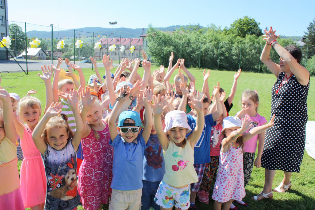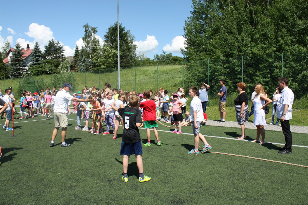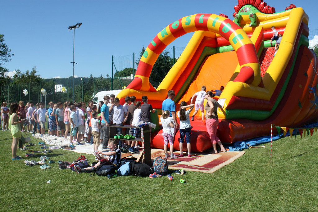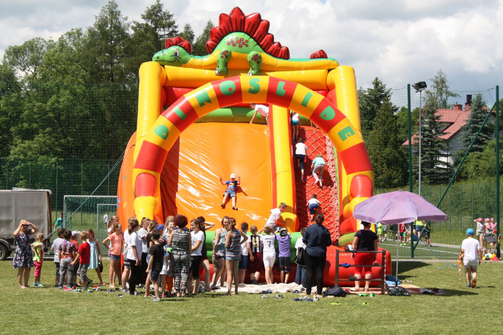 Po zakończeniu prezentacji projektów nadszedł czas na zabawy ruchowe i rozgrywki sportowe na Orliku. Najmłodsi wzięli udział w grze terenowej „Baśniowym szlakiem”. Pozostali mogli sprawdzić swoją sprawność i kondycję fizyczną podczas przeciągania liny czy meczów piłki nożnej. Niewątpliwie najwięcej emocji wzbudziła ogromna, dmuchana zjeżdżalnia, która pojawiła się obok naszej szkoły specjalnie na tę okazję (niespodzianka od dyrekcji). Kolejki chętnych do skorzystania z tego obiektu nie miały końca, zaczynając od maluchów, a kończąc na uczniach gimnazjum.