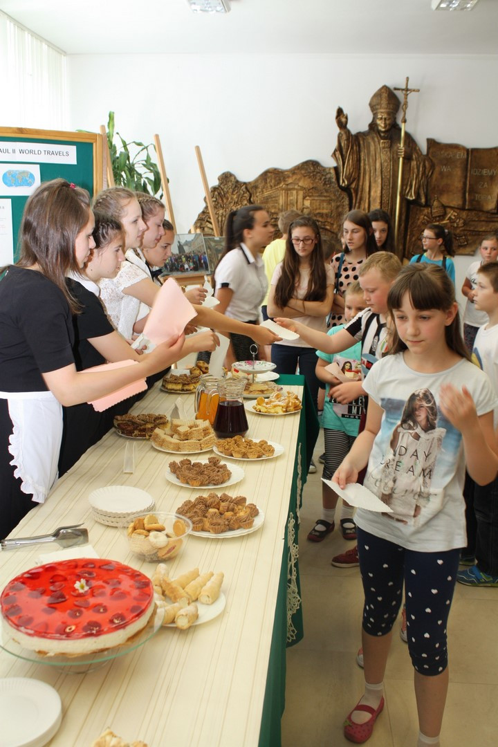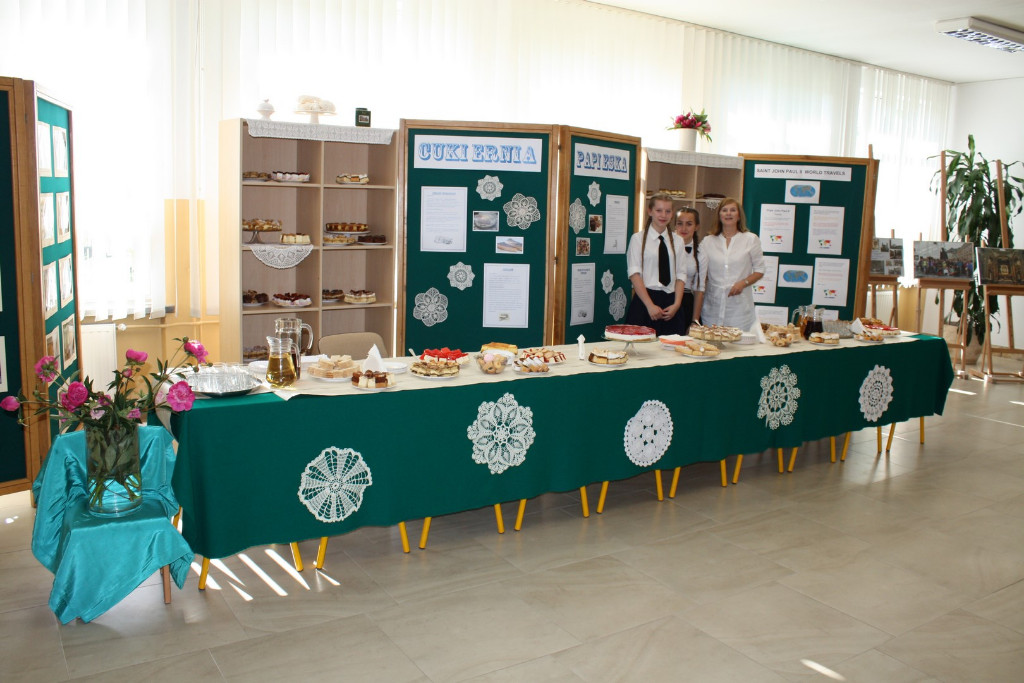 w cukierni stylizowanej na „czasy wadowickie” Karola Wojtyły. Uczniowie mogli skosztować między innymi kremówek, sernika wiedeńskiego, szarlotki, sękacza i innych łakoci, od których nie stronił również nasz Patron.