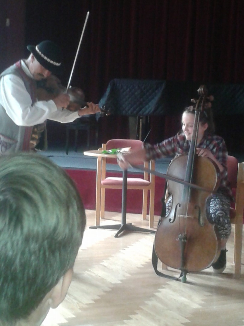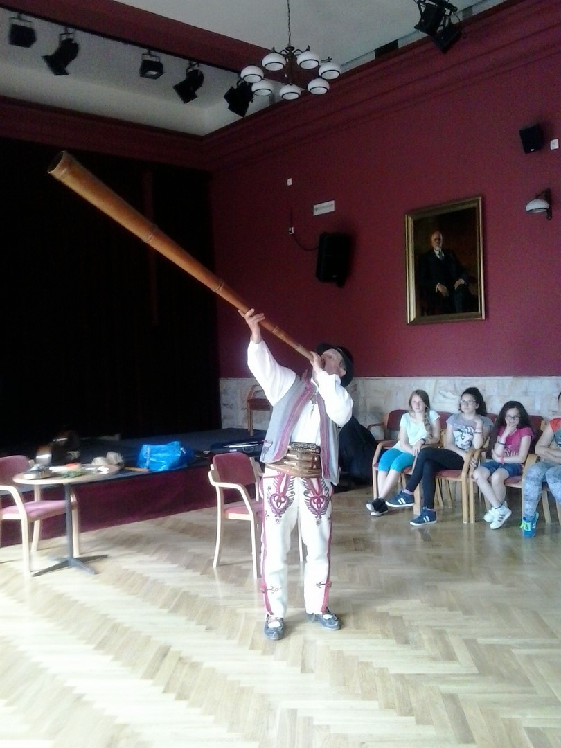 Pierwszego dnia uczniowie klas IV – VI wzięli udział w warsztatach Małej Akademii Folkloru. Pierwsze z nich, zatytułowane O czym grają dudy, jak dźwięczy trombita? były doskonałą okazją do zapoznania się z instrumentami pasterskimi. Dzieci miały okazję zobaczyć z bliska, dotknąć i posłuchać jak grają: dudy, złóbcoki, basy, trombita, okaryna i różnego rodzaju piszczałki. Przy akompaniamencie tradycyjnej muzyki uczniowie bawili się w dawne zabawy, słuchali tradycyjnych przyśpiewek, sami próbowali akompaniować. Wykonali również własne piszczałki.