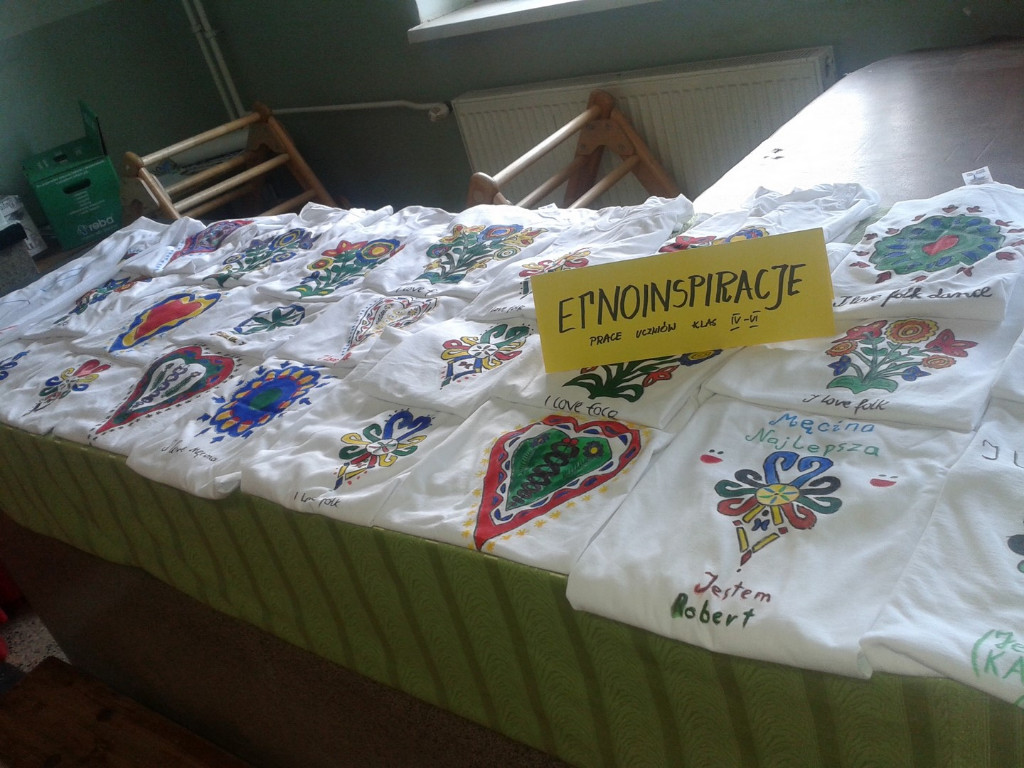 Drugie warsztaty odbywały się pod hasłem Etno-inspiracje. Uczestnicy dowiedzieli się czym jest etnodizajn. Była to przede wszystkim niezwykła wędrówka po barwnej krainie wzorów i motywów wykorzystywanych w tradycyjnym zdobnictwie, ich symbolicznym i obrzędowym znaczeniu. Uczniowie poznali współczesne oblicza wzornictwa inspirowanego miejscowym folklorem. Oczywiście najciekawsze były zajęcia, podczas których ze zgromadzonego katalogu wzorów, barw, motywów uczniowie tworzyli własne projekty i przenosili je na t-shirt. Każdy uczeń opuścił zajęcia z podkoszulkiem, na którym widniał własnoręcznie wykonany wzór.